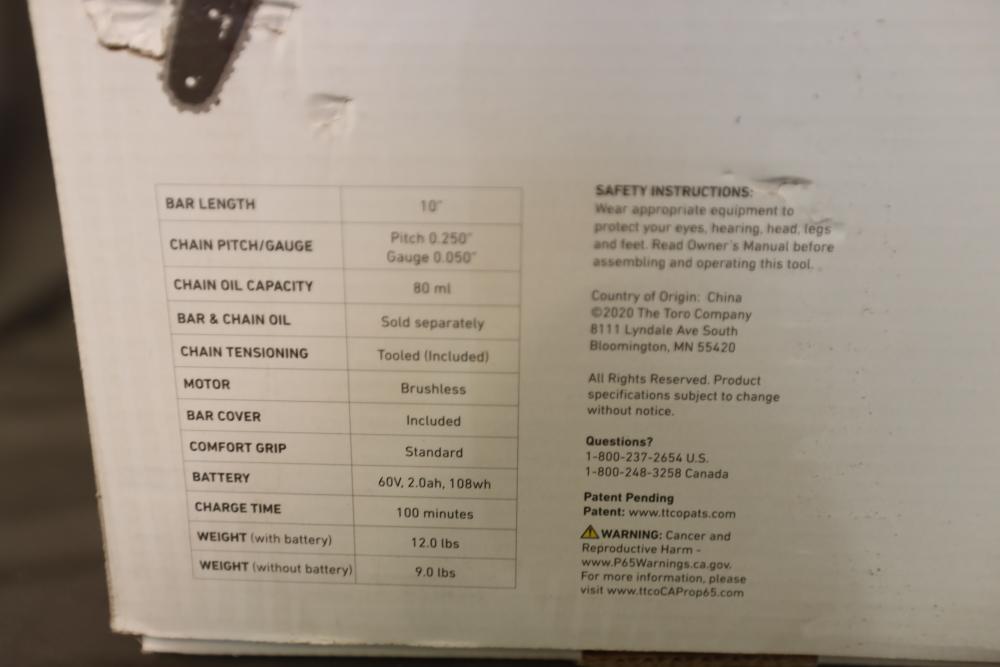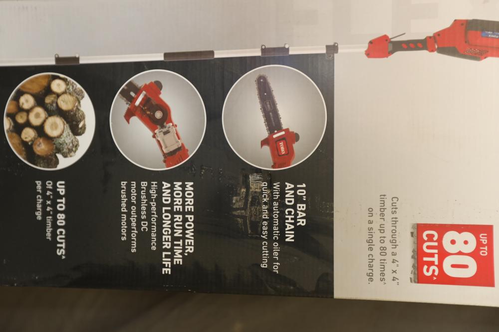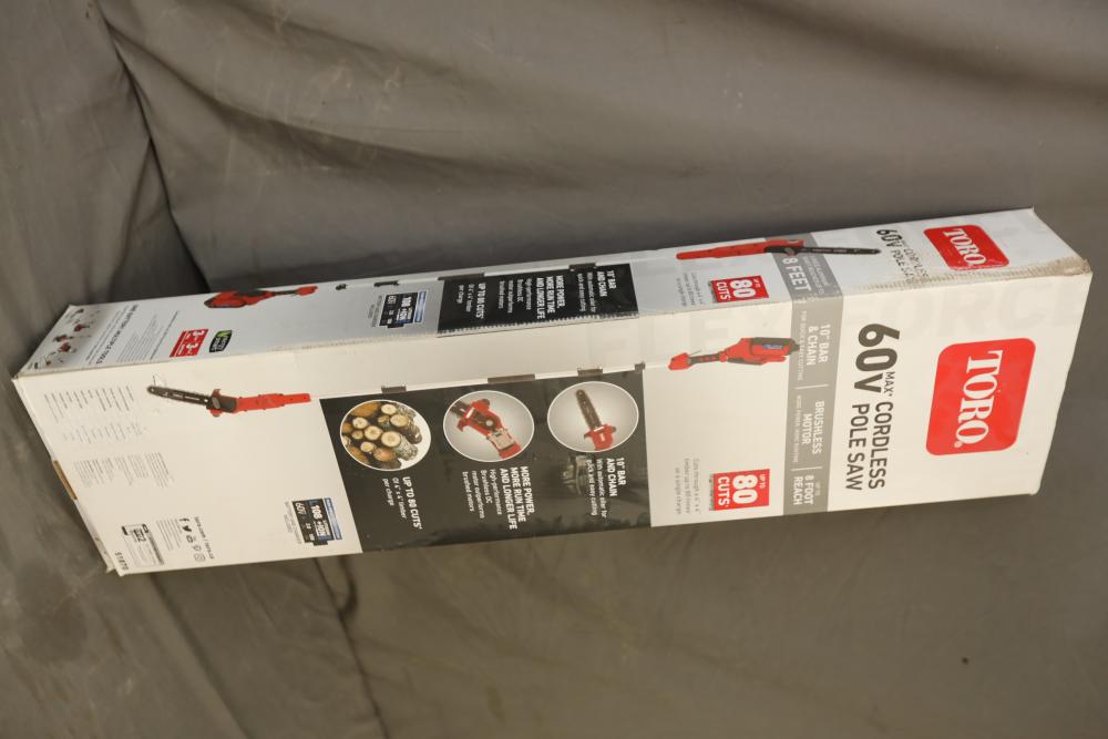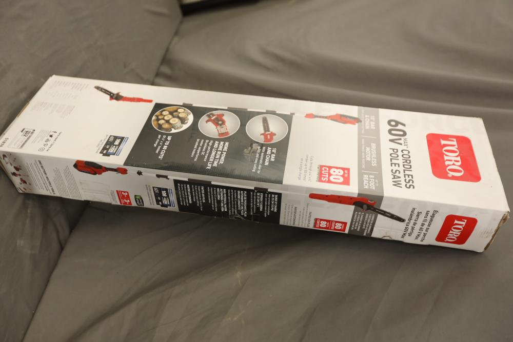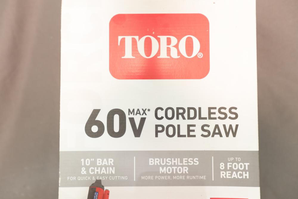 Toro 60V Max cordless 10" electric brushless pole saw with up to 8' reach model 51870 with battery and charger. Appears to be new in box.