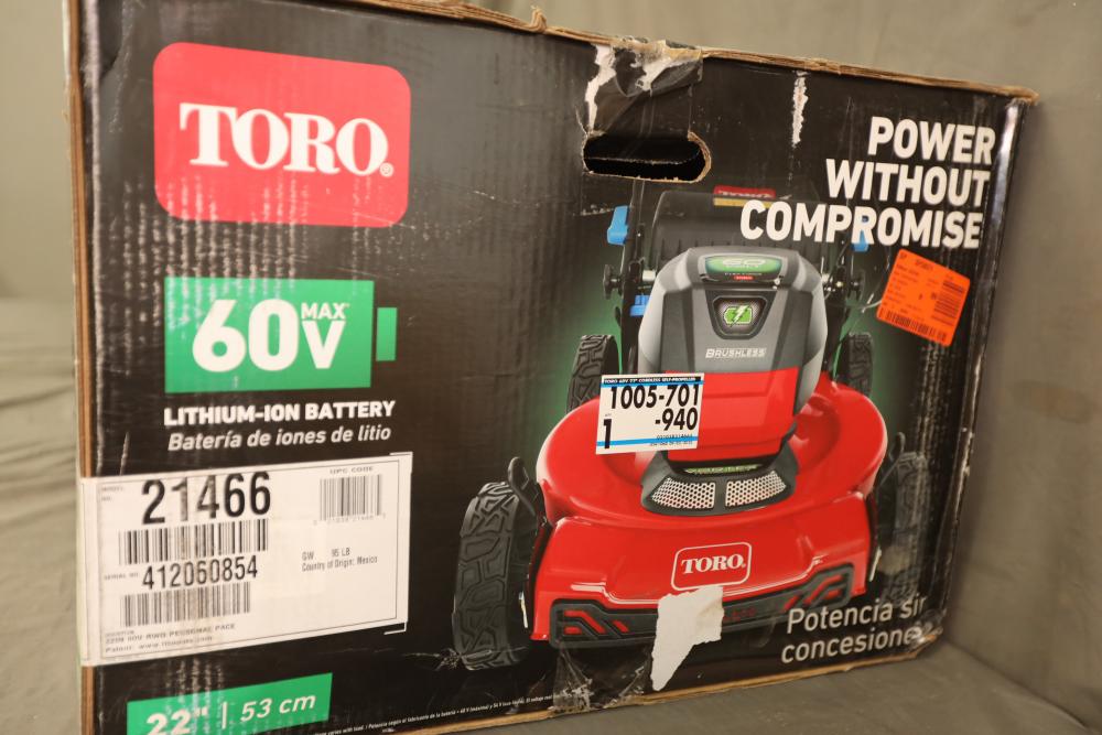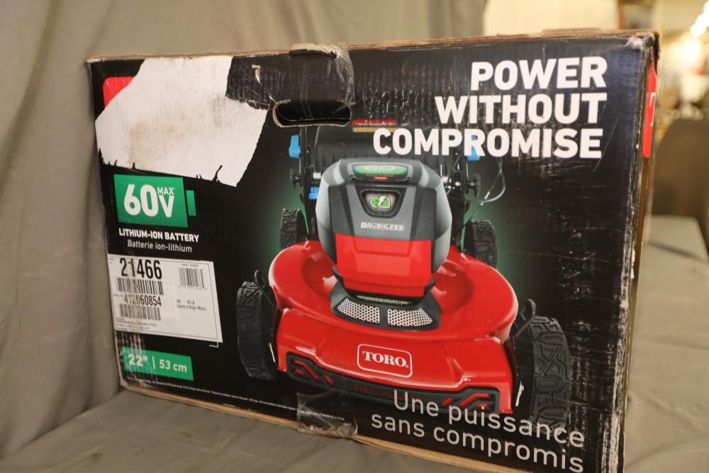 Toro Recycler 22" 60V battery self-propelled lawn mower kit model 21466 with battery and charger. Appears to be new in box.