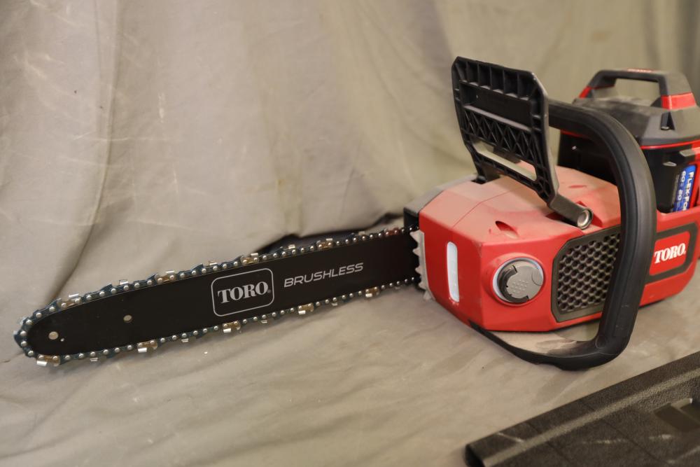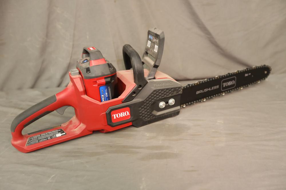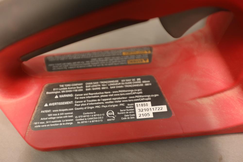 Toro 60V Max 16" cordless electric brushless chainsaw model 51850. Runs and operates. Includes battery but not charger.