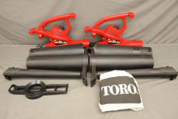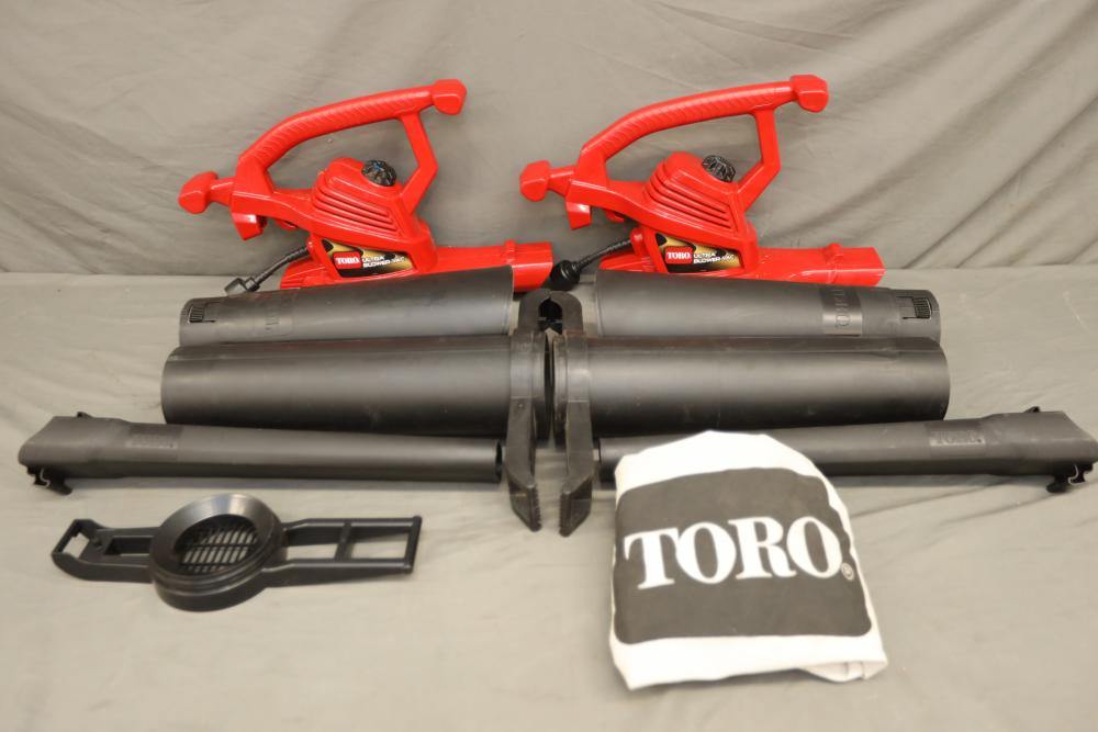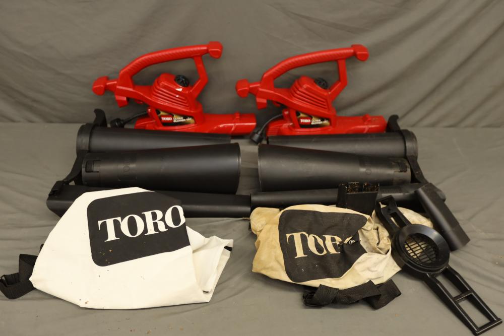 Two Toro electric ultra-blower 3 in 1 vac model 51619, high speed vacuum, leaf shredder, and blower with attachments. Both blowers are non-operational.