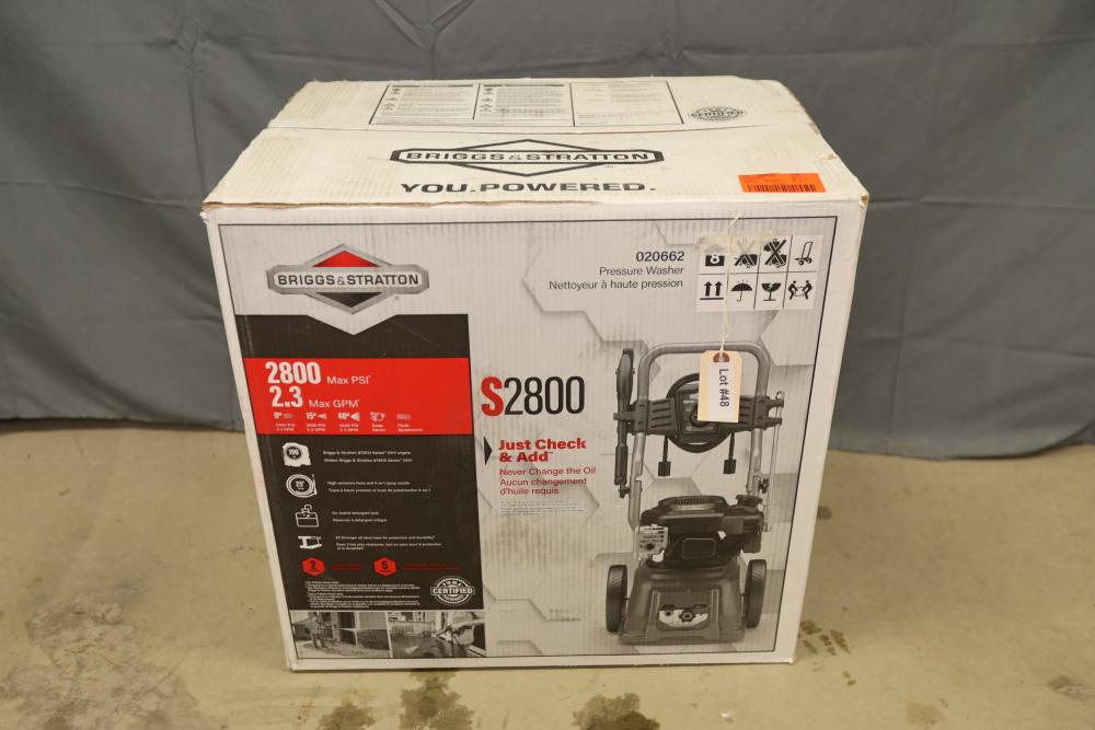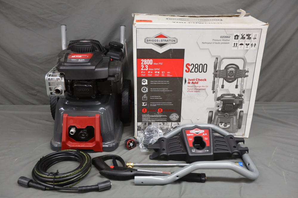 Briggs and Stratton S2800 pressure washer model 020662-01 with 875 Exi 190cc engine and attachments. Runs and operates.