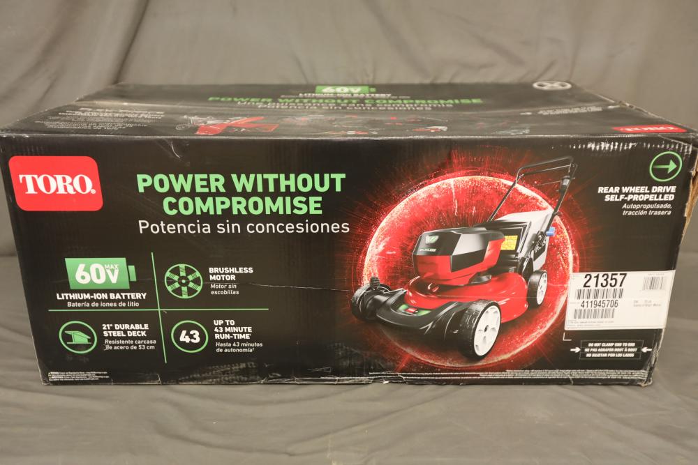 Toro Recycler 21" steel-deck 60V self-propelled lawn mower kit with battery and charger model 21357. Appears to be new in box.