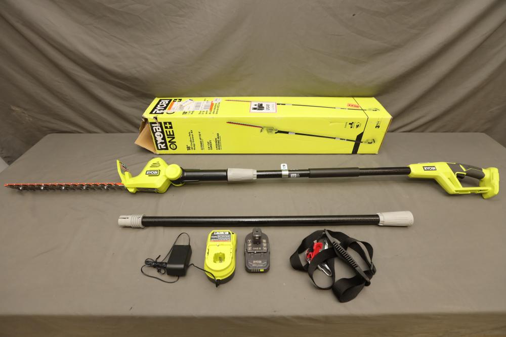 Ryobi 18" cordless 18-volt pole hedge trimmer model P26010VNM with pole extender, battery and charger. Runs and operates.