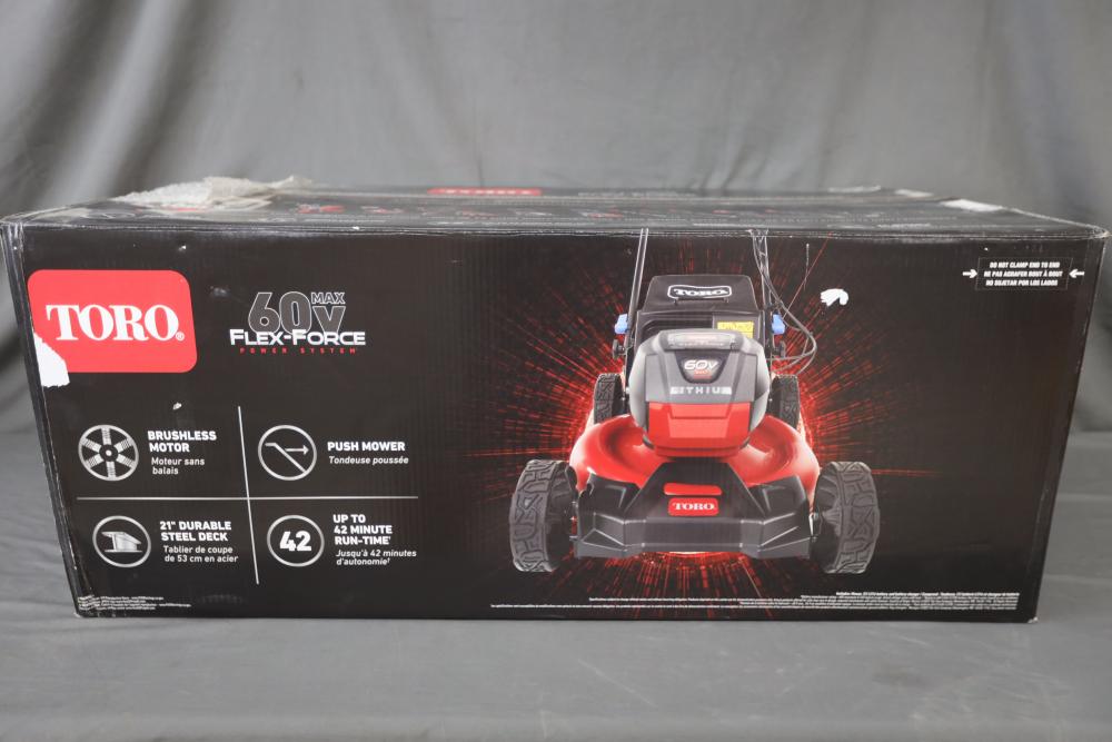 Toro SMARTSTOW Flex-Force max 60-volt 21" push-mower with 3-phase brushless motor, battery charger, grass bag and product manual. Appears to be new in box.