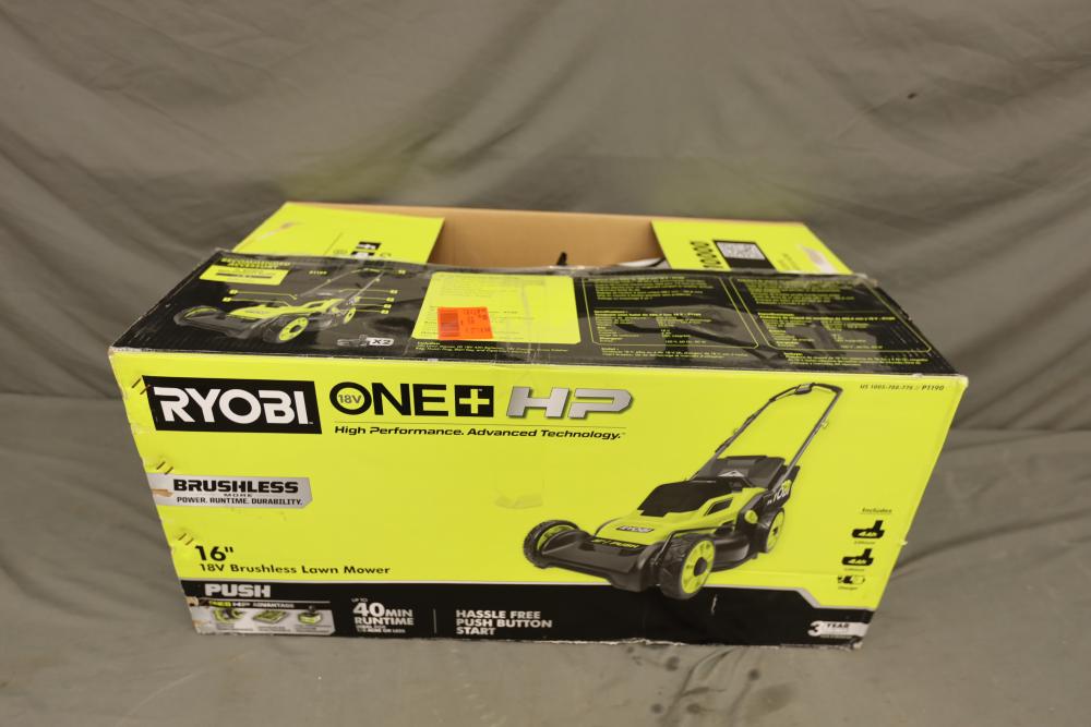 Ryobi ONE+ 18 volt brushless 16" cordless battery walk behind push mower with battery and charger. Runs and operates.