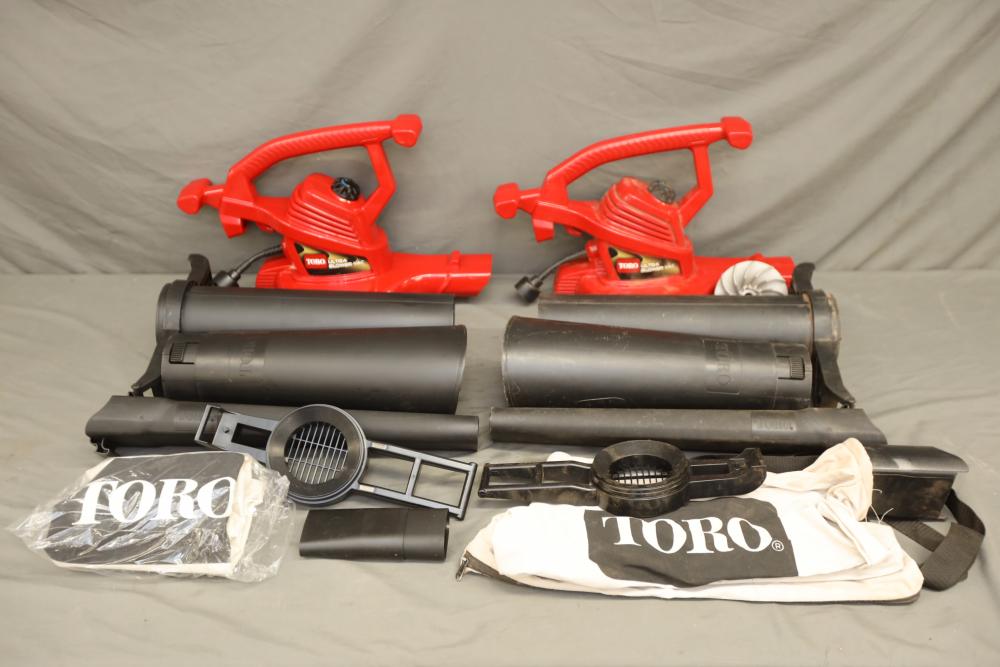 Two Toro electric ultra-blower 3 in 1 vac model 51619, high speed vacuum, leaf shredder, and blower with attachments. Both blowers are non-operational.