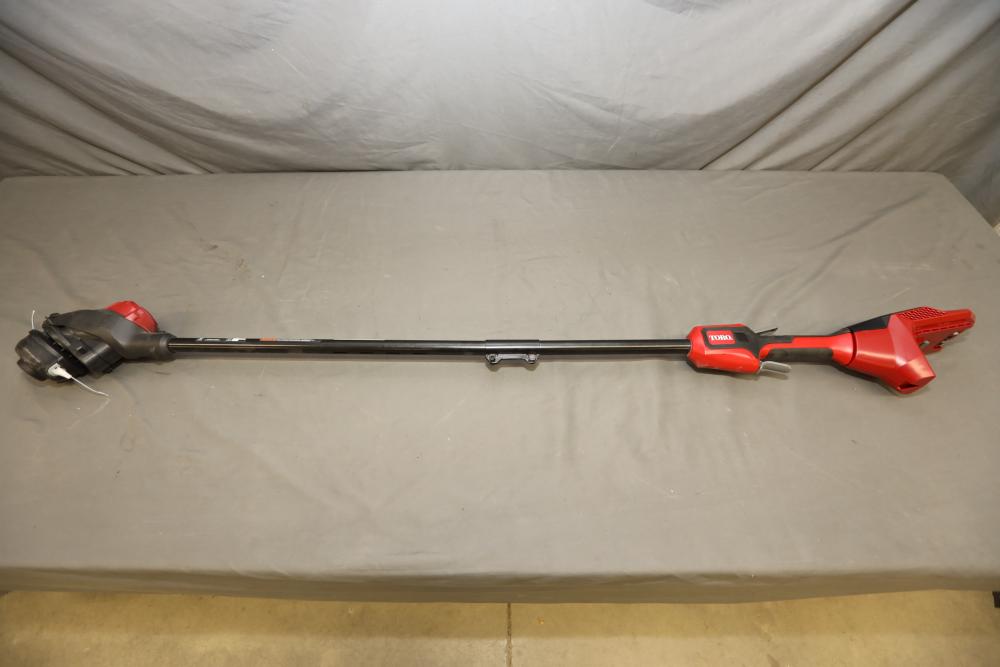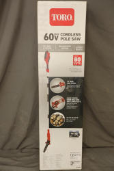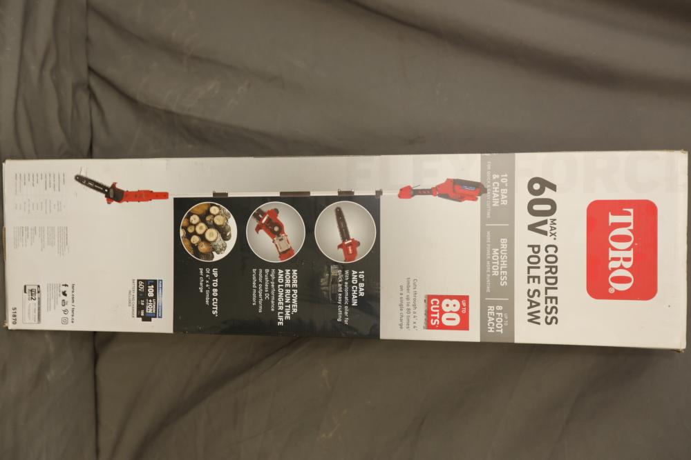 Toro 60V Max cordless 10" electric brushless pole saw with up to 8' reach model 51870 with battery and charger. Appears to be new in box.
