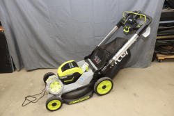 Ryobi 21" AWD walk-behind self-propelled electric mower model RY401021 with two 40-volt batteries, charger and spare front wheels.
