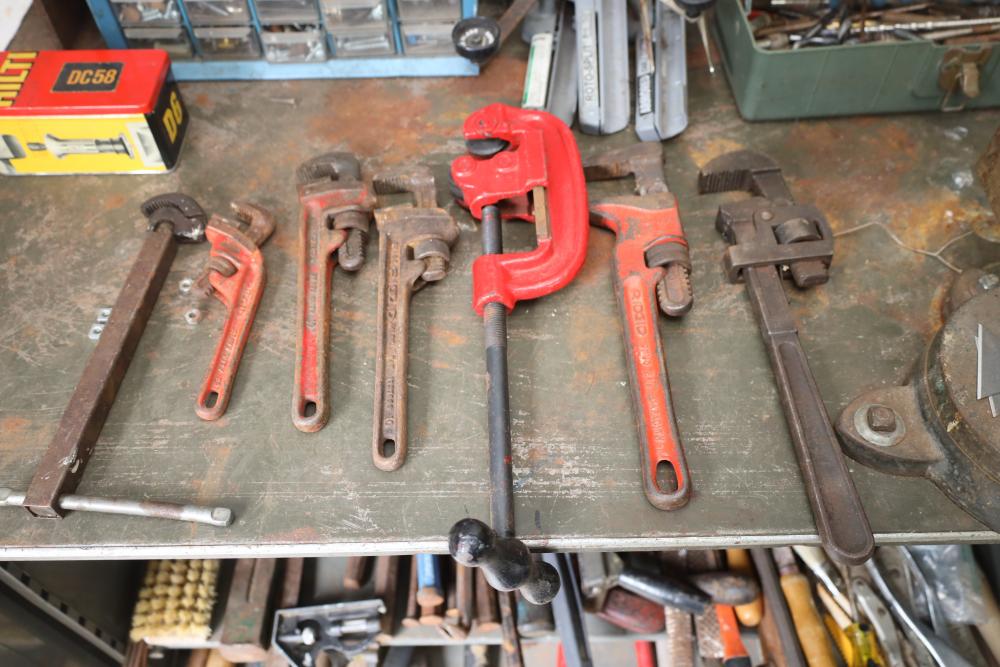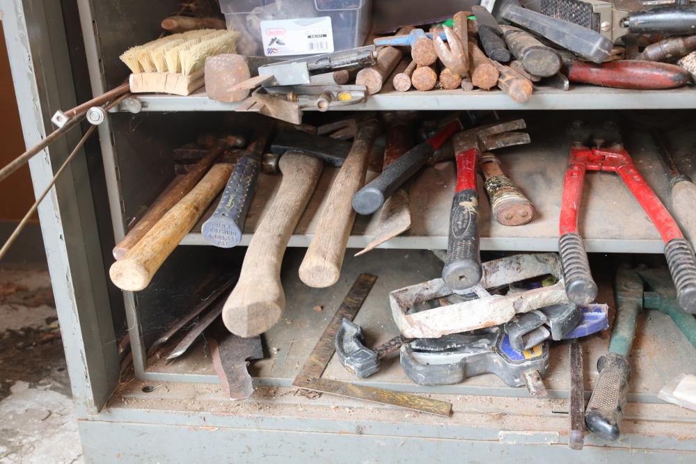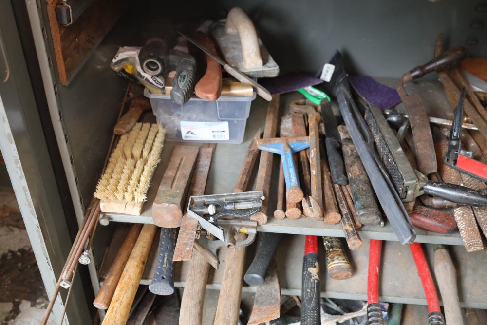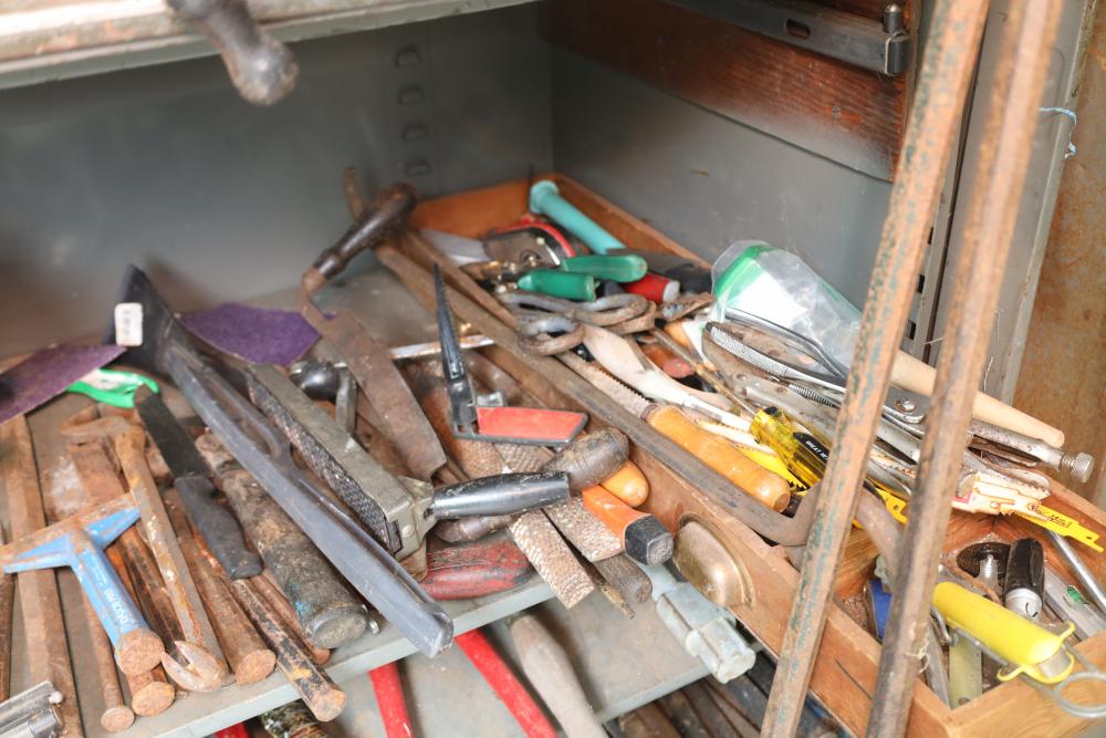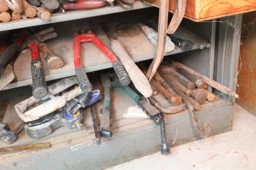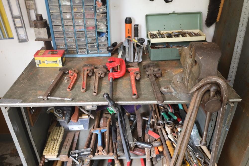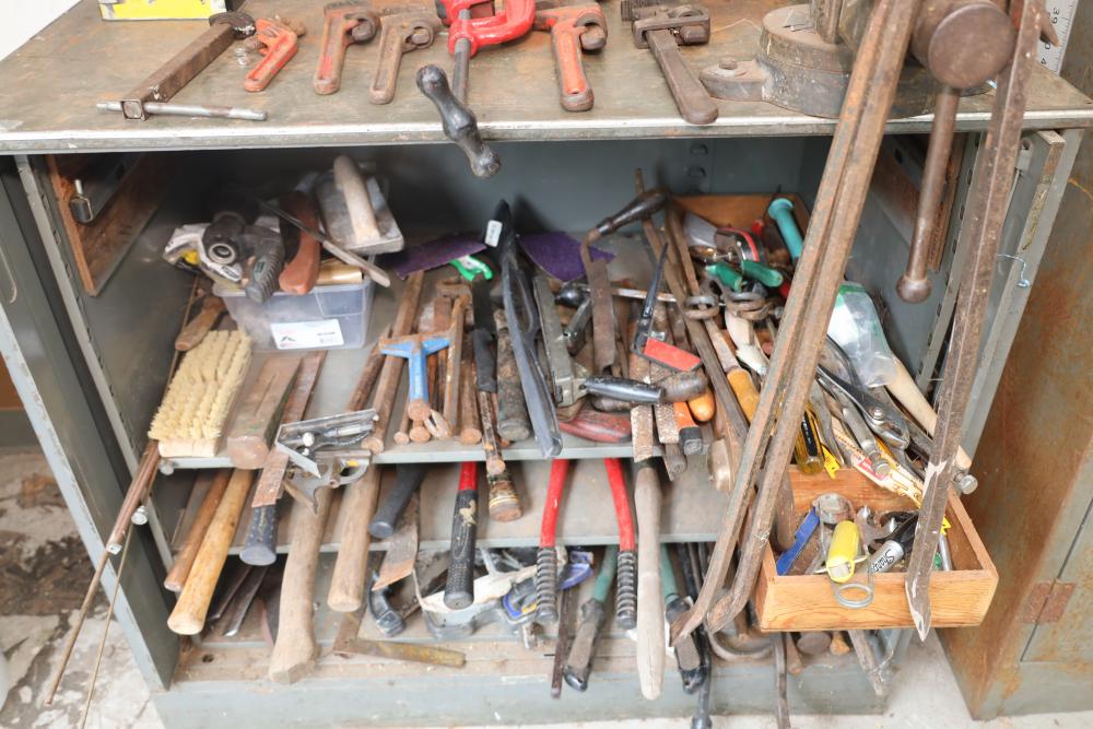 Contents of metal tool bench, wall, and shelves incl; table vice, pliers, chisels, 50 slot hardware drawer, grinding wheels, drill bits, levels, rulers, clamps, plumbing wrenches, hand saws, cable cutters, hammers, pry bars, household cleaners and chemicals, safety glasses, etc. Includes tool bench. Buyer must take all.