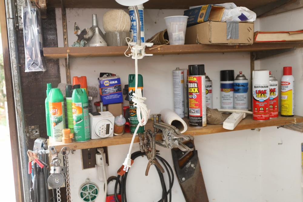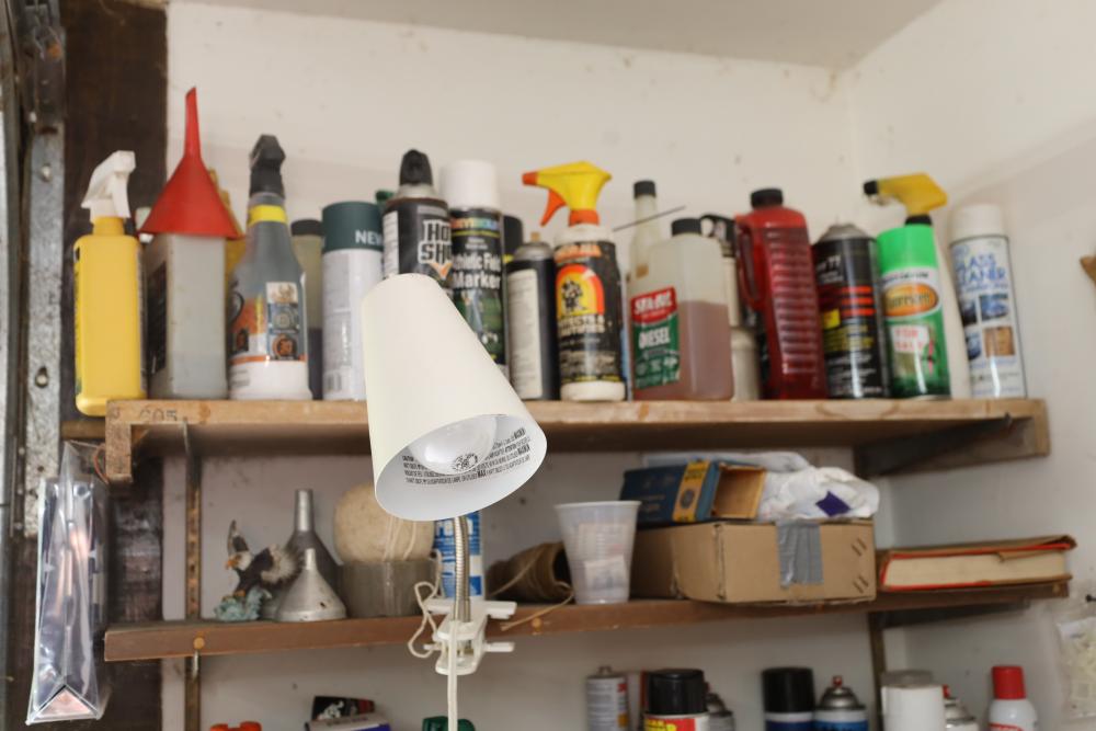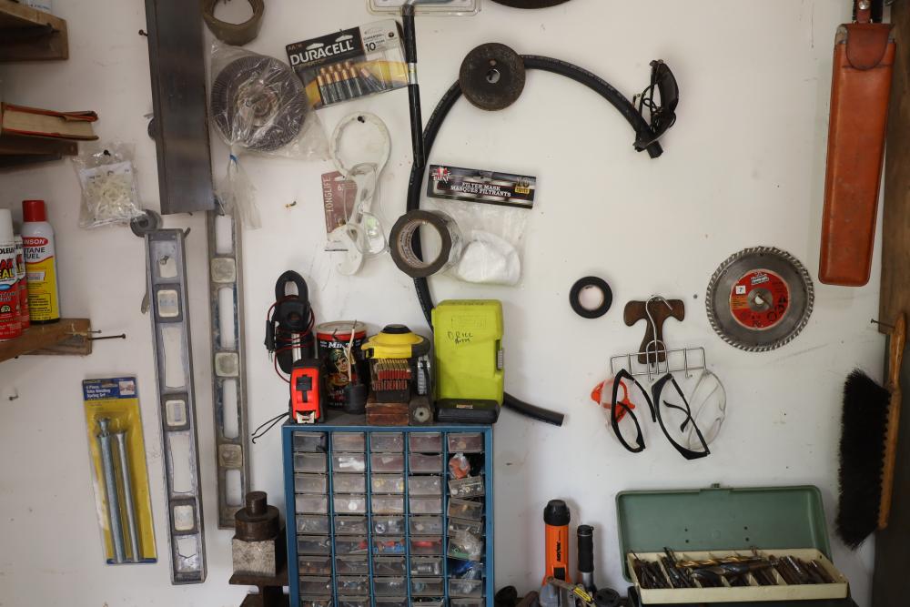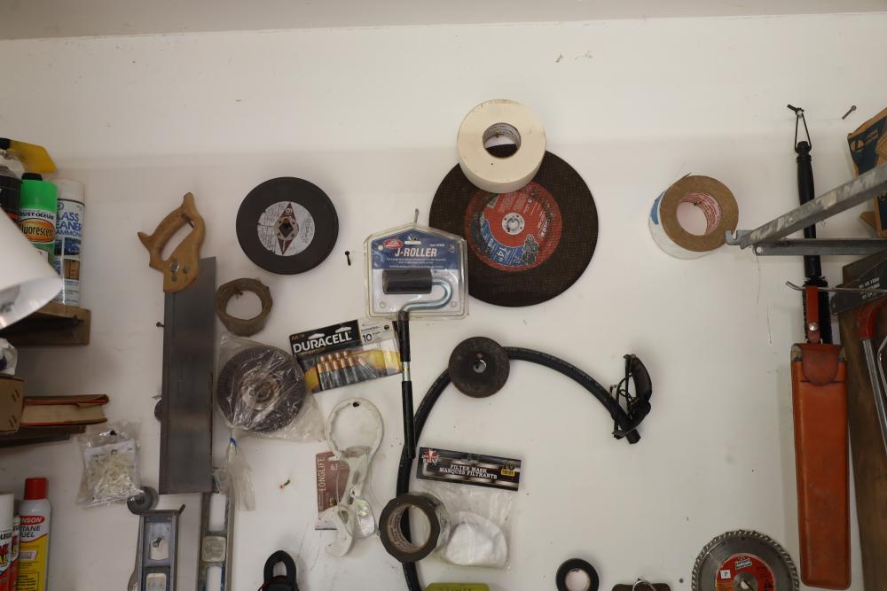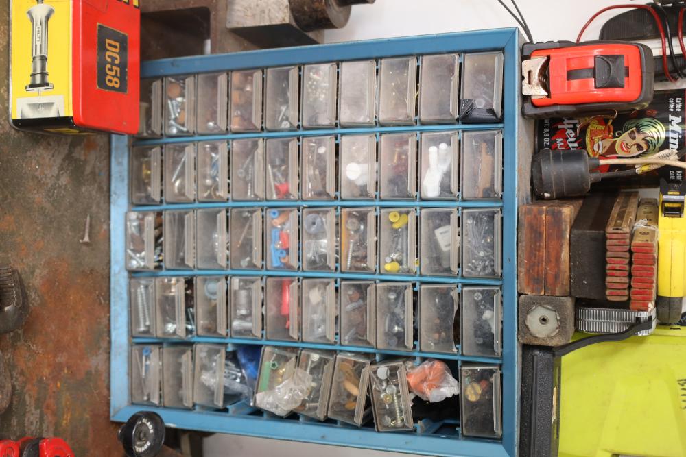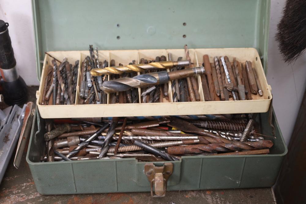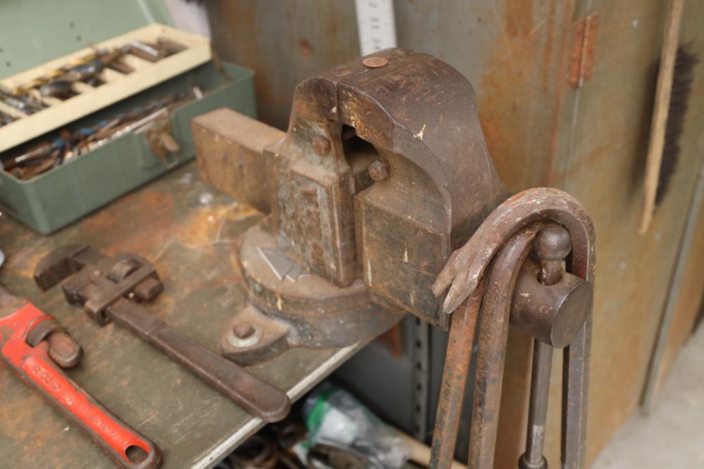 Contents of metal tool bench, wall, and shelves incl; table vice, pliers, chisels, 50 slot hardware drawer, grinding wheels, drill bits, levels, rulers, clamps, plumbing wrenches, hand saws, cable cutters, hammers, pry bars, household cleaners and chemicals, safety glasses, etc. Includes tool bench. Buyer must take all.