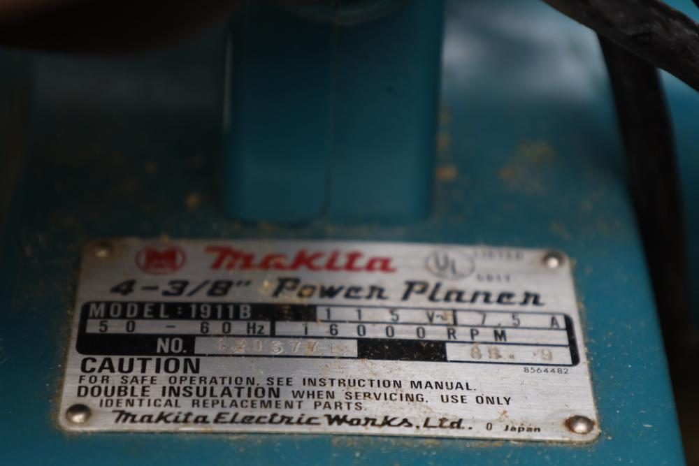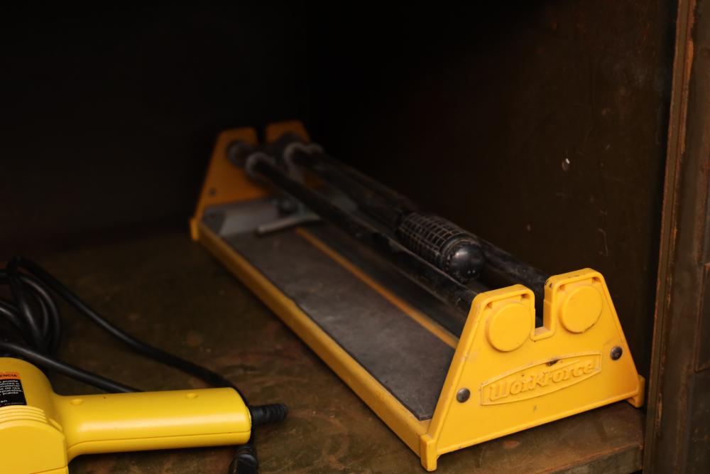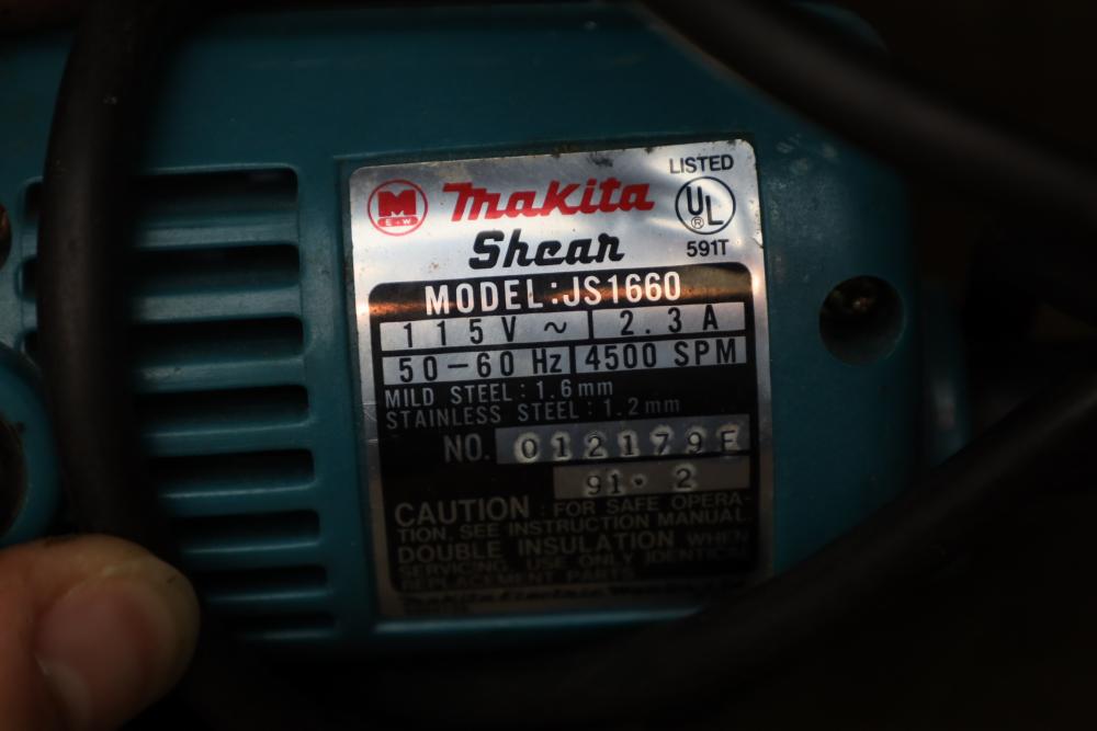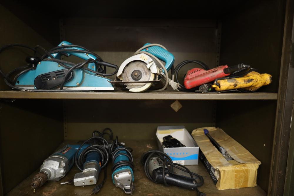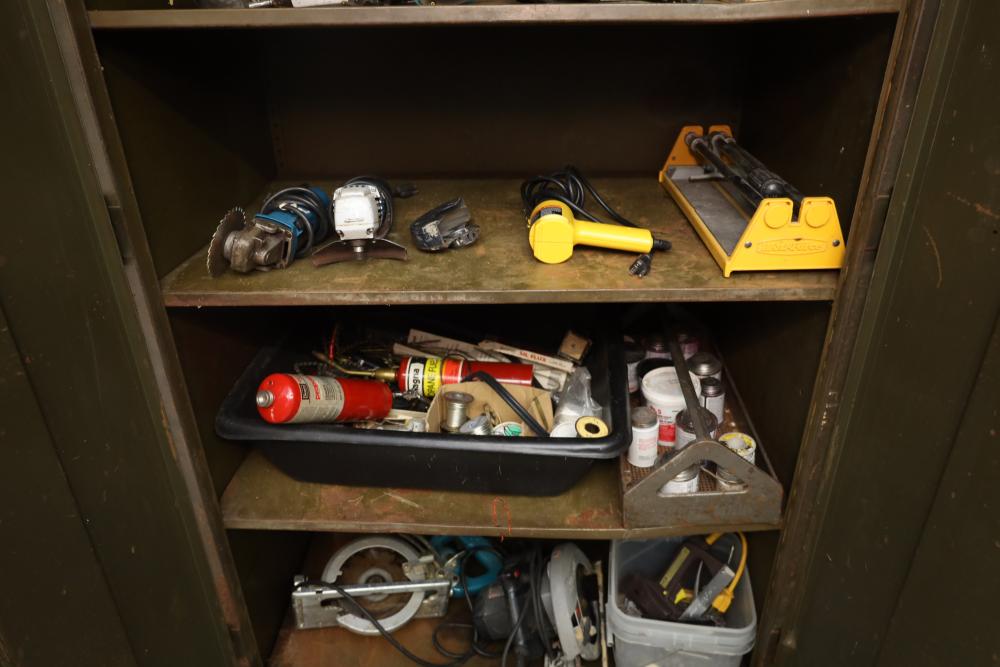 Right side five tier two door metal cabinet and contents incl; 13 corded power tools, Makita shear JS1660, Ryobi 4” angle grinder SG-1000, Makita 4-3/8” power planer 1911B, Makita 110mm circular saw, Conair hair trimmer, Workforce tile cutter, soldering wire, etc. Buyer must take all.