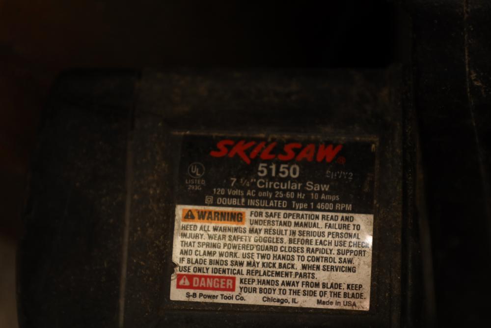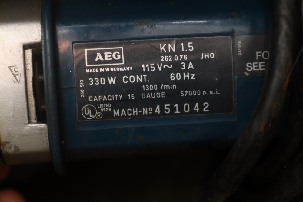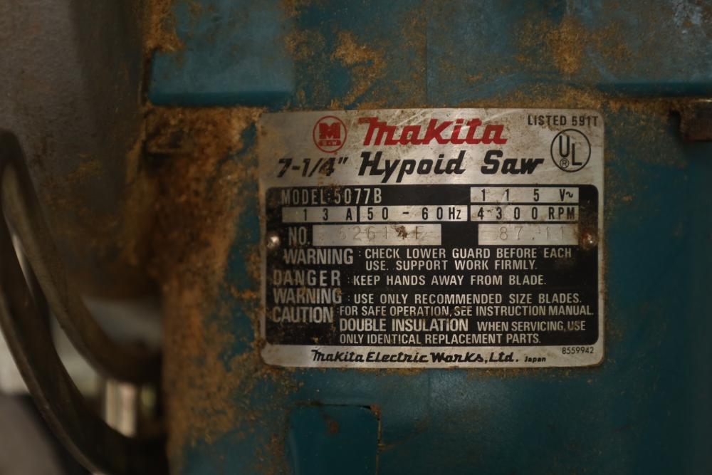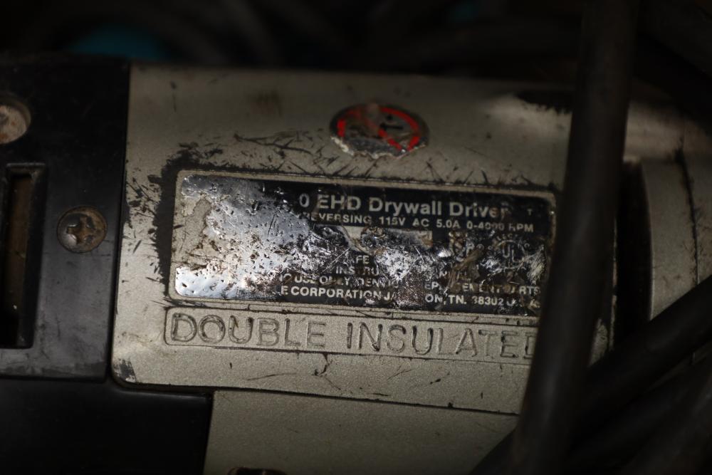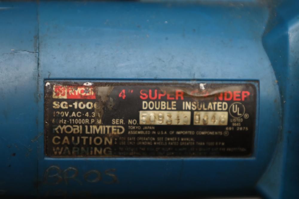 Right side five tier two door metal cabinet and contents incl; 13 corded power tools, Makita shear JS1660, Ryobi 4” angle grinder SG-1000, Makita 4-3/8” power planer 1911B, Makita 110mm circular saw, Conair hair trimmer, Workforce tile cutter, soldering wire, etc. Buyer must take all.