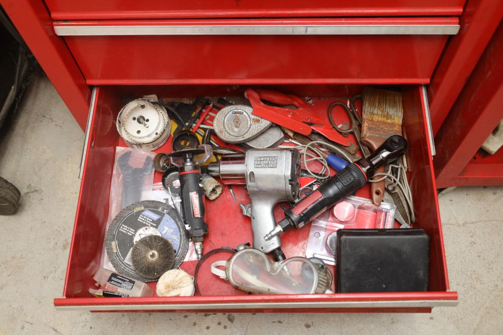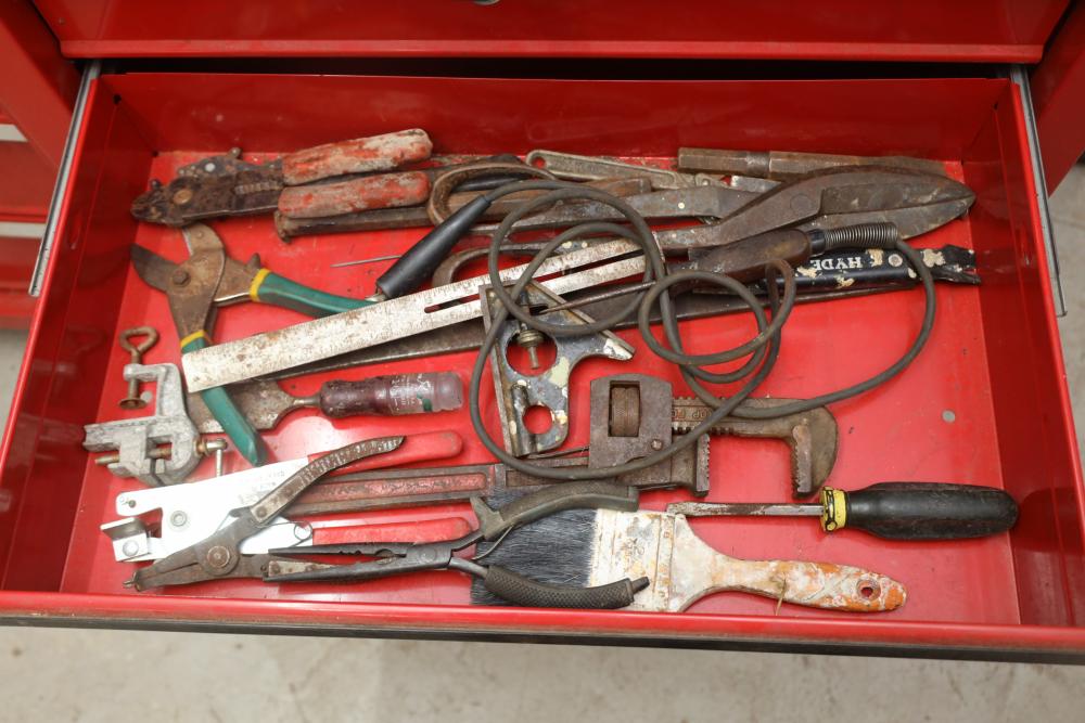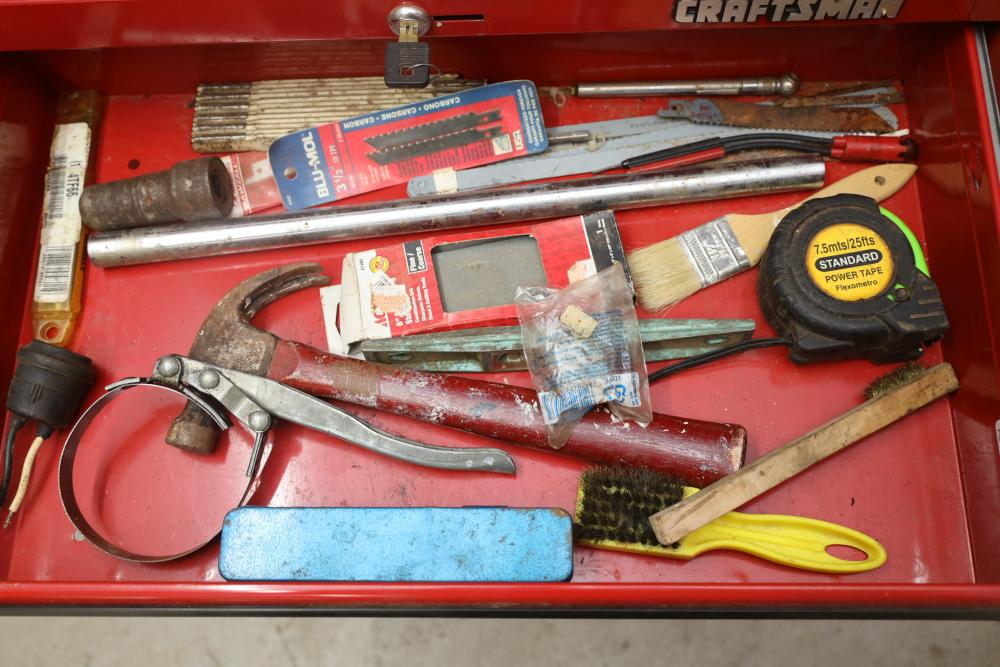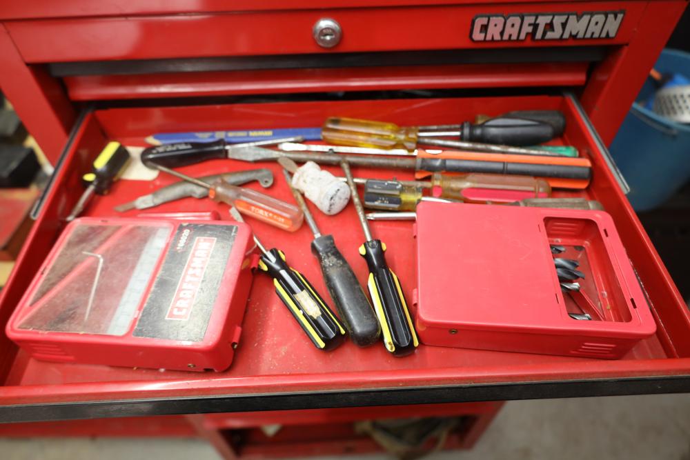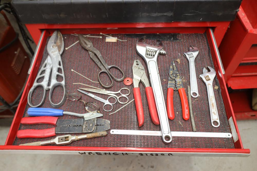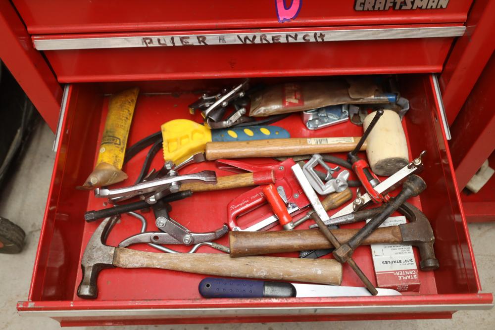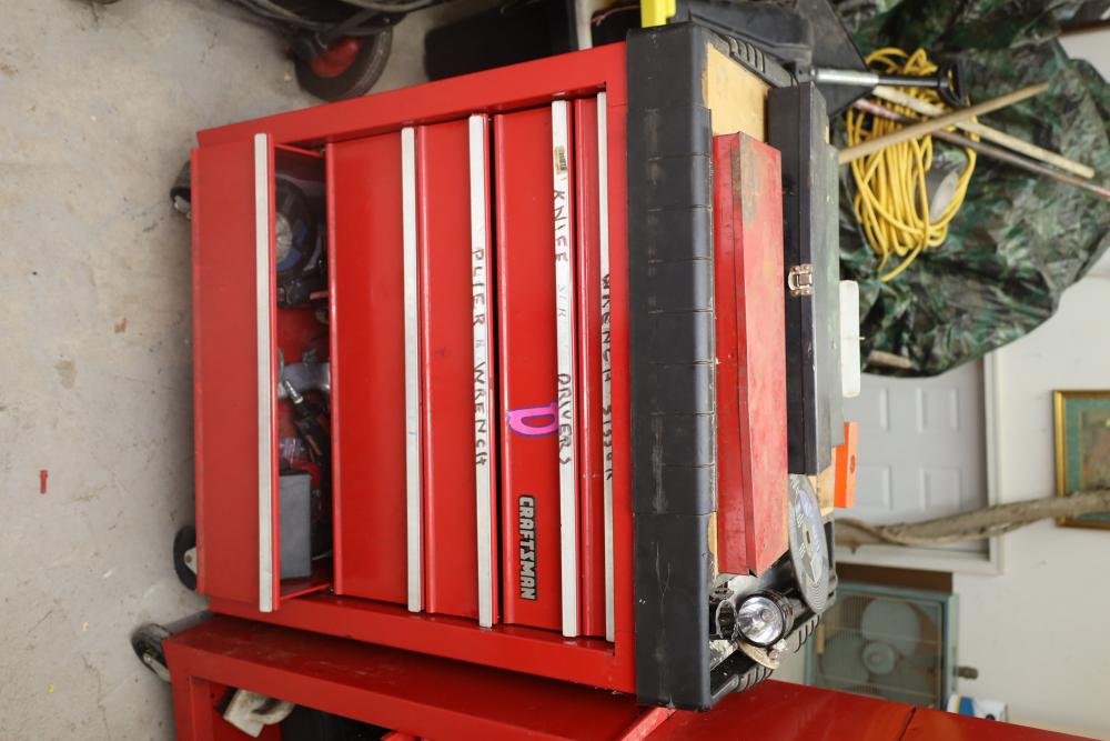 Two Craftsman toolboxes and contents; air tools, hammers, three claw clamp, pliers, plumbing wrenches, needle nose pliers, wire cutters, vice grips, Allen keys, sheers, star screwdrivers, Philips screw drivers, craftsmen wrenches, door knobs, radio, staple gun, etc. Buyer must take all.