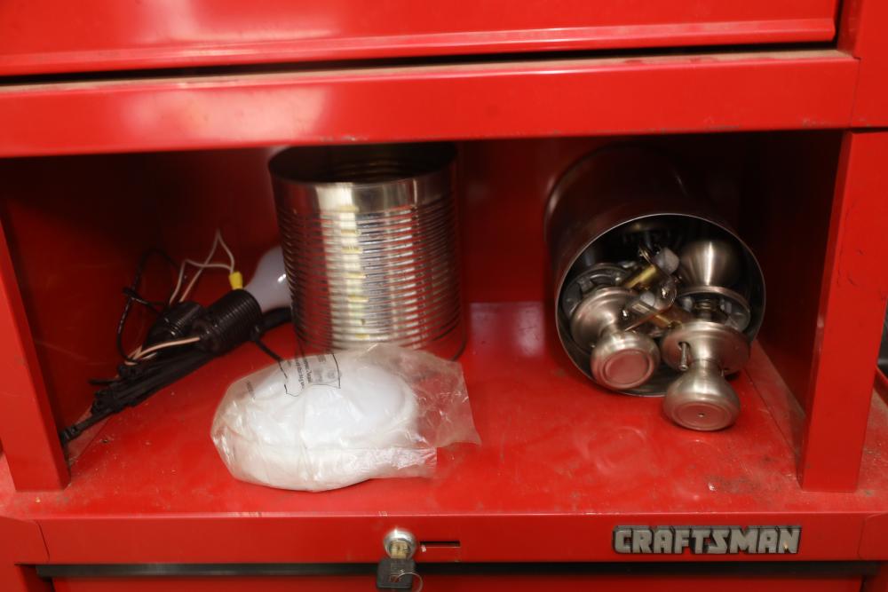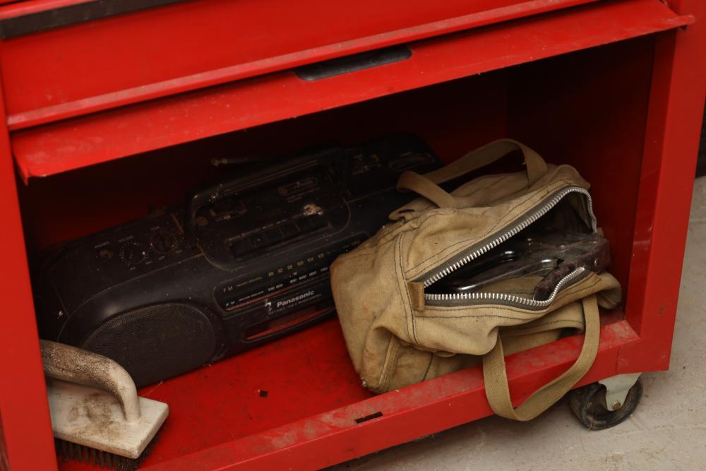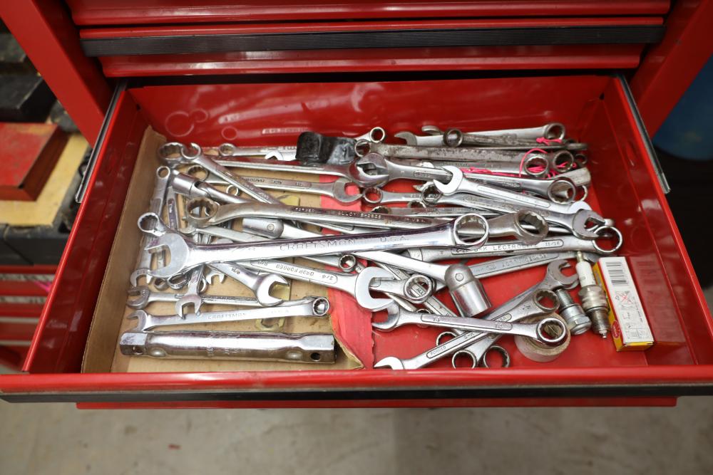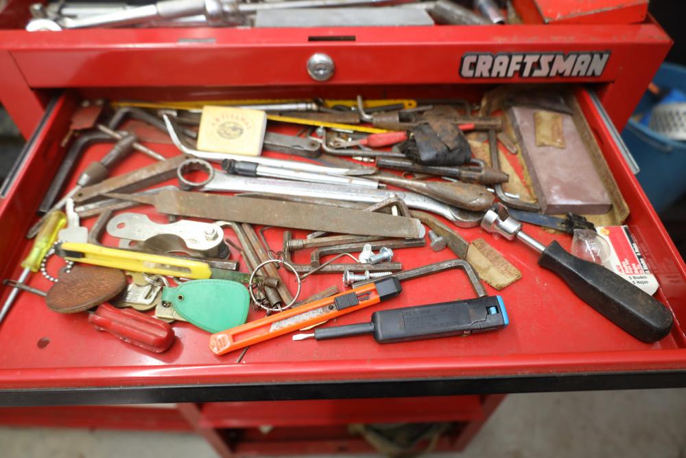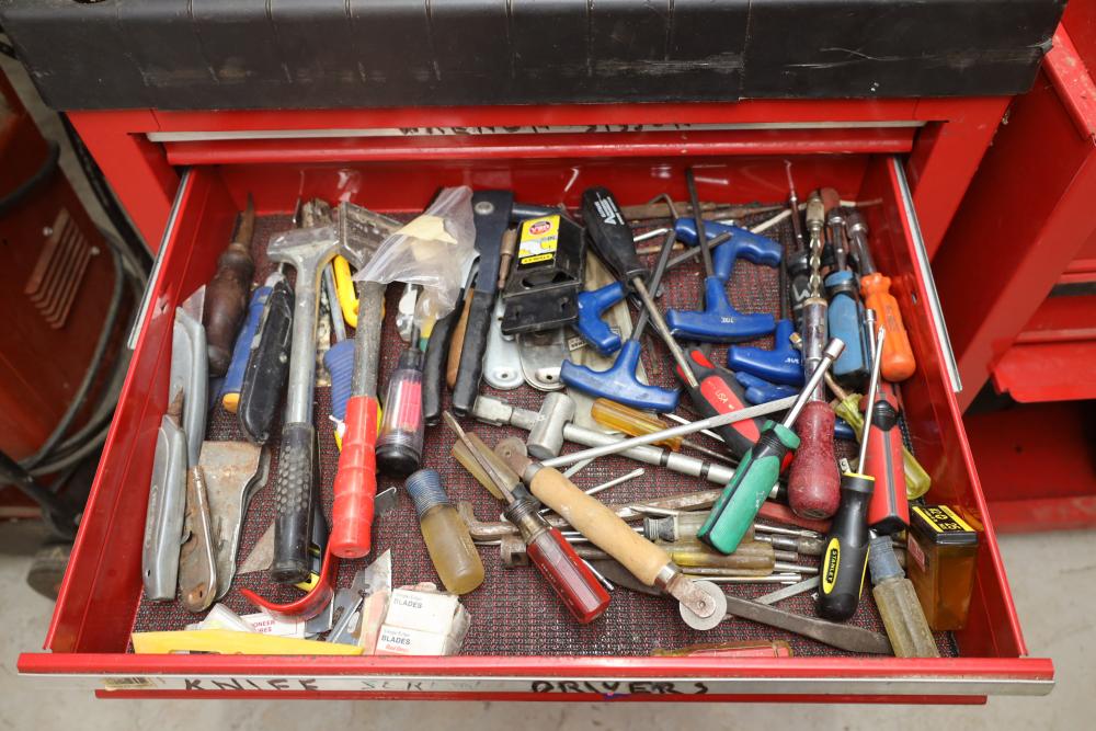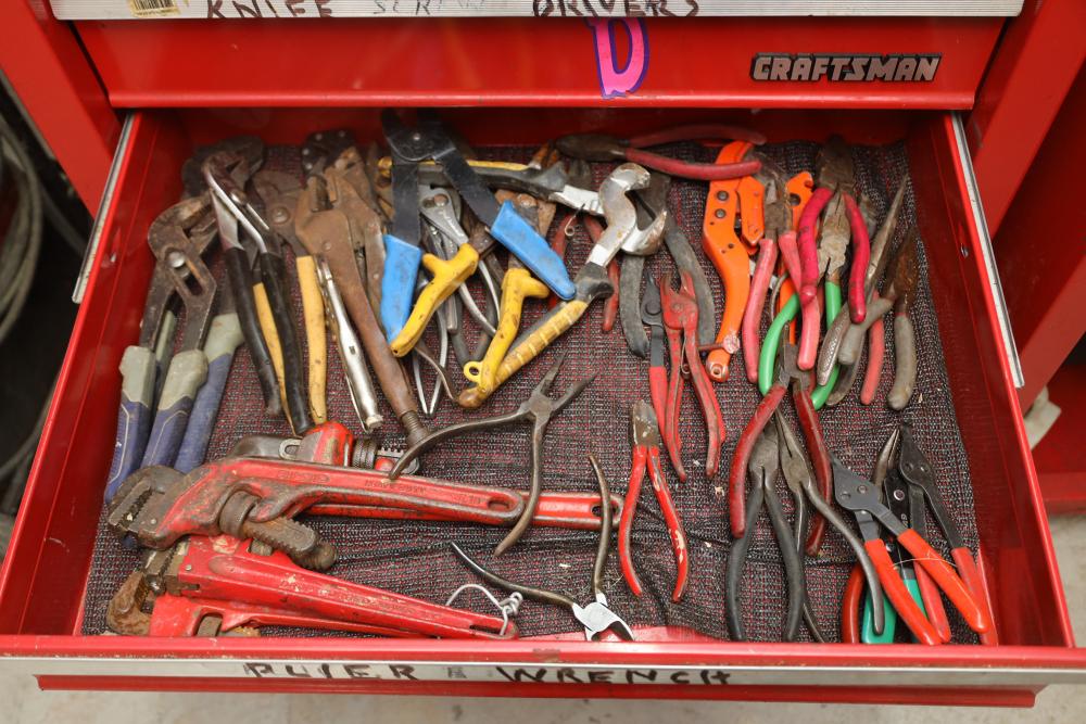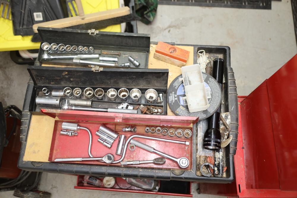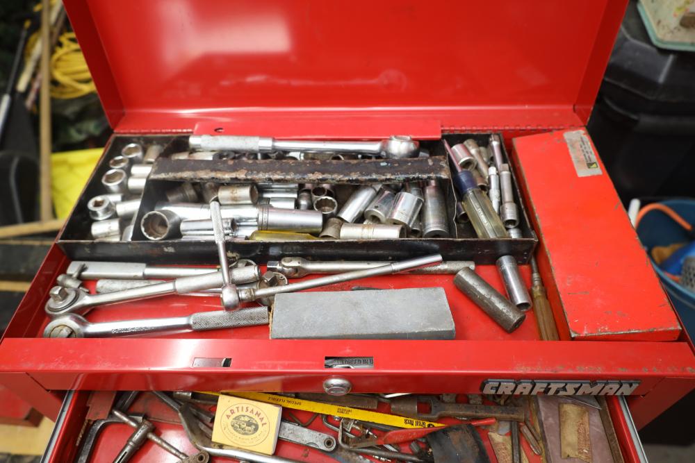 Two Craftsman toolboxes and contents; air tools, hammers, three claw clamp, pliers, plumbing wrenches, needle nose pliers, wire cutters, vice grips, Allen keys, sheers, star screwdrivers, Philips screw drivers, craftsmen wrenches, door knobs, radio, staple gun, etc. Buyer must take all.