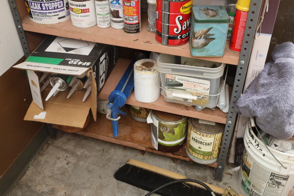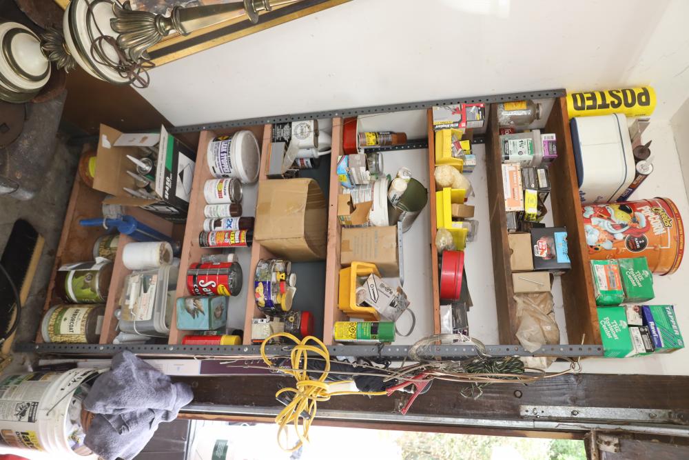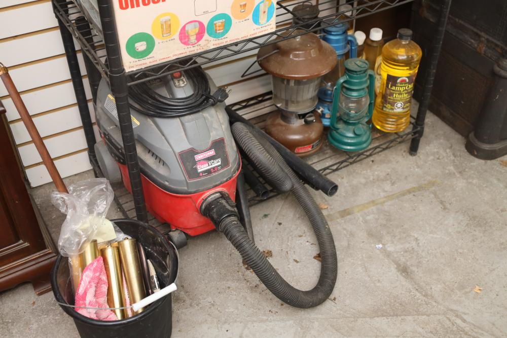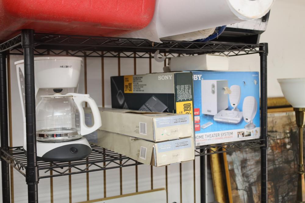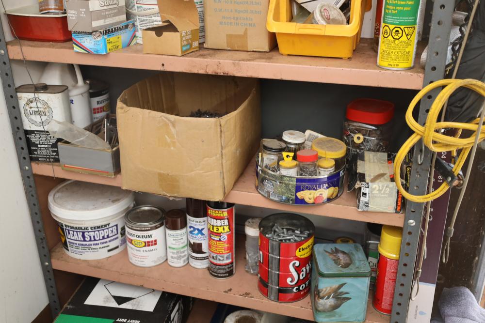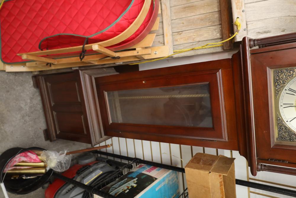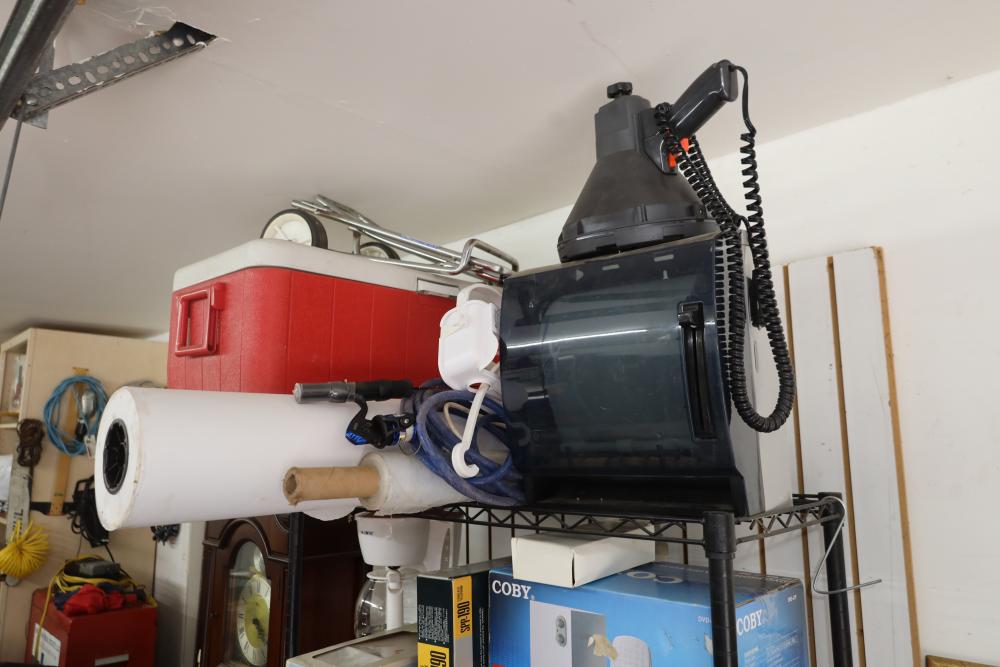 Remaining contents of garage incl; two tall brass table lamps without shades, framed abstract art signed Pradier, five tier metal shelf and contents including Torrison Balance scale, four three packs of starting fire logs, audio system , COBY DVD home theater system, two bob sleds, grandfather clock with weights and pendulum, craftsmen shop vac, camping lamps with lamp oil, paper towel dispenser, handheld foot light, Coleman cooler, nails, screws, jumper cables, eight tier shelf with hardware, chemicals, paint, zip ties, caulk, screws , nails, washers, brackets, jumper cables, small chain, brake line, etc. Buyer must take all.