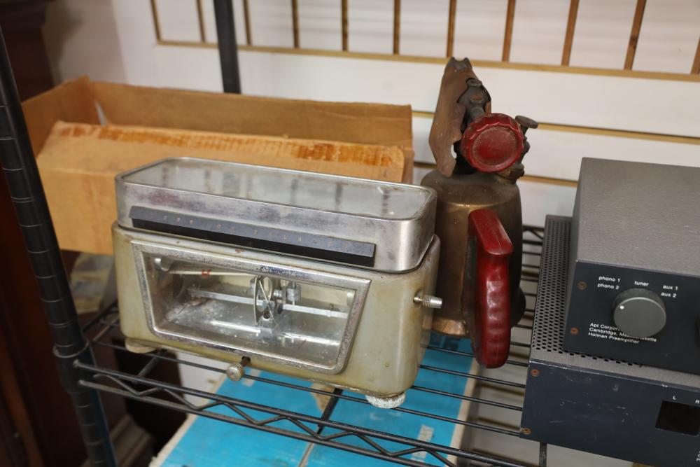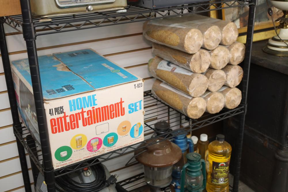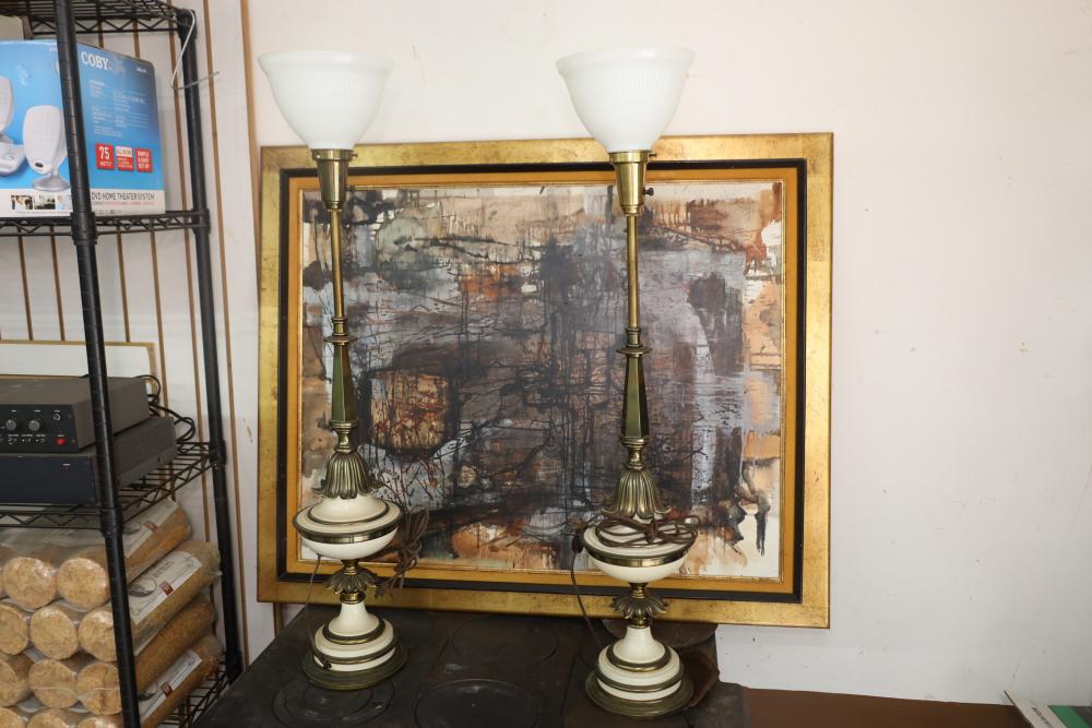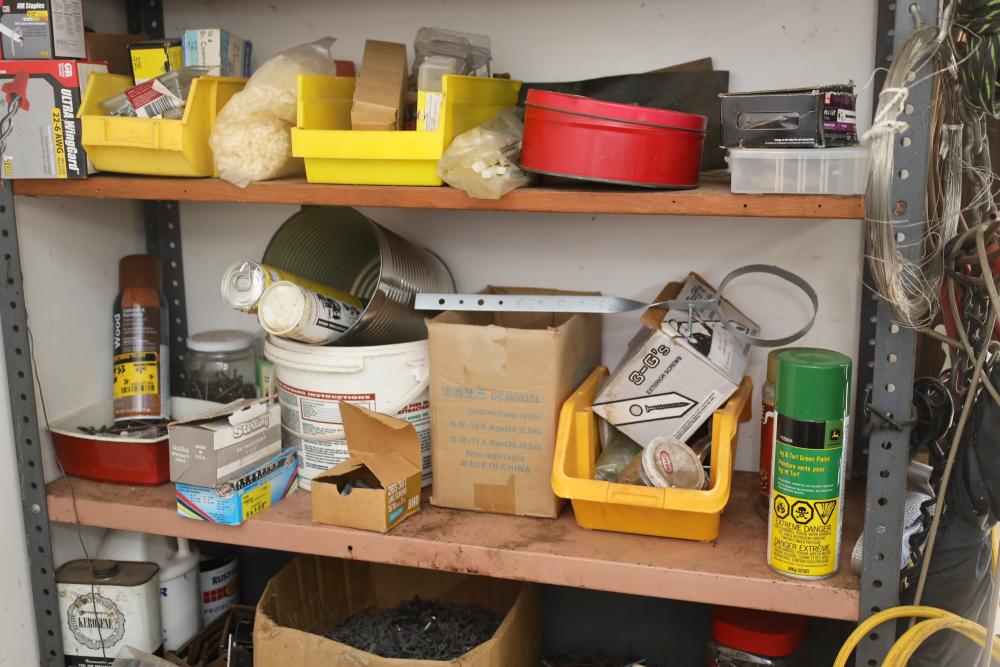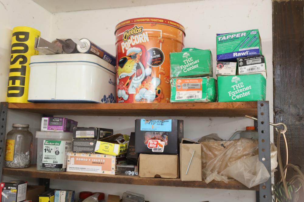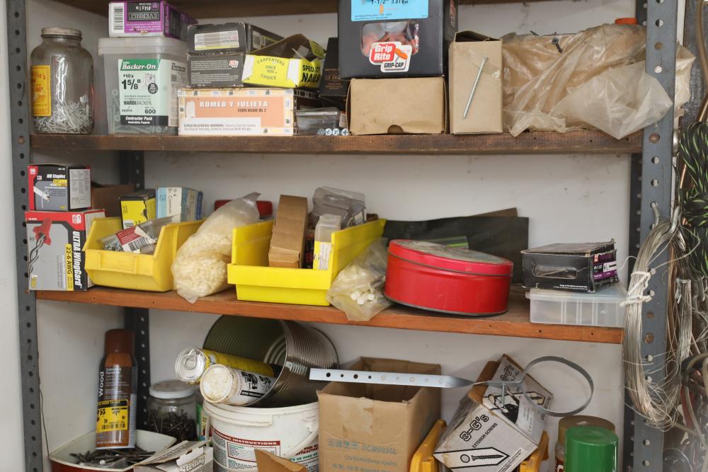 Remaining contents of garage incl; two tall brass table lamps without shades, framed abstract art signed Pradier, five tier metal shelf and contents including Torrison Balance scale, four three packs of starting fire logs, audio system , COBY DVD home theater system, two bob sleds, grandfather clock with weights and pendulum, craftsmen shop vac, camping lamps with lamp oil, paper towel dispenser, handheld foot light, Coleman cooler, nails, screws, jumper cables, eight tier shelf with hardware, chemicals, paint, zip ties, caulk, screws , nails, washers, brackets, jumper cables, small chain, brake line, etc. Buyer must take all.