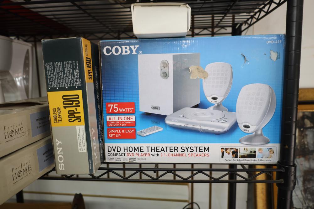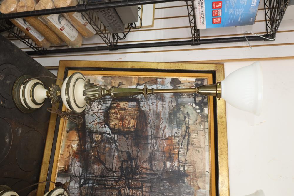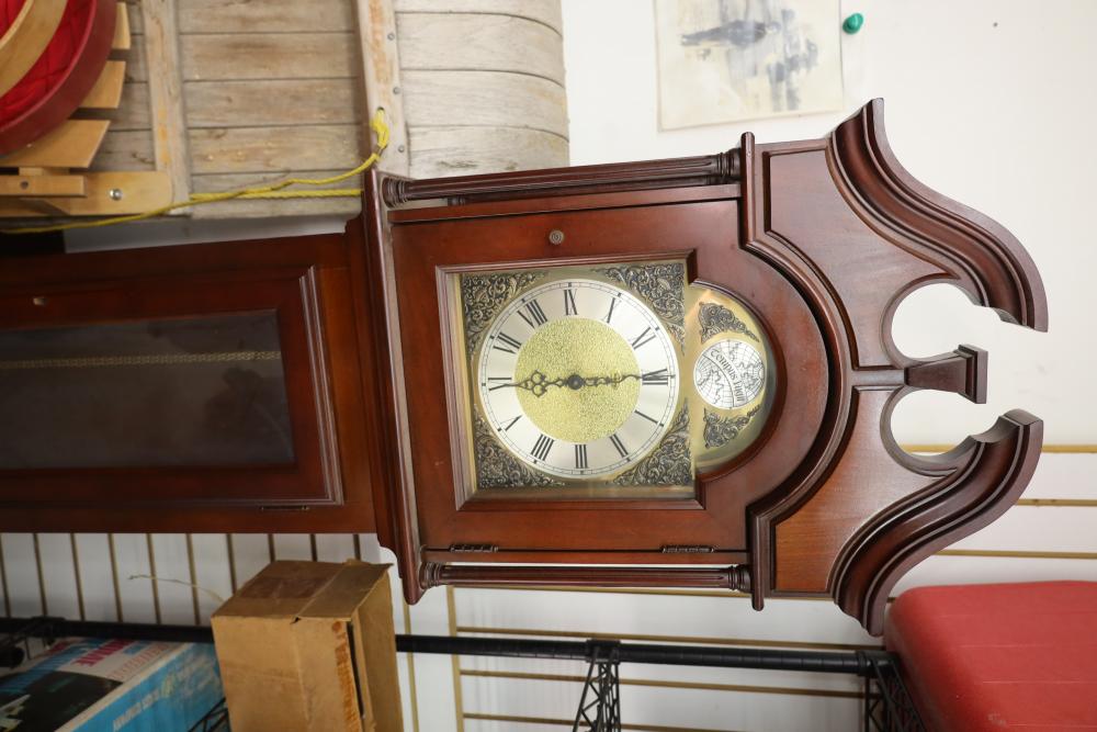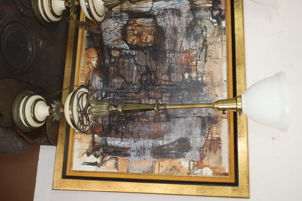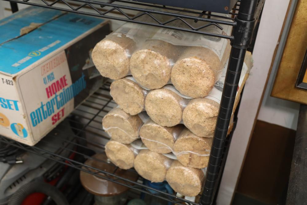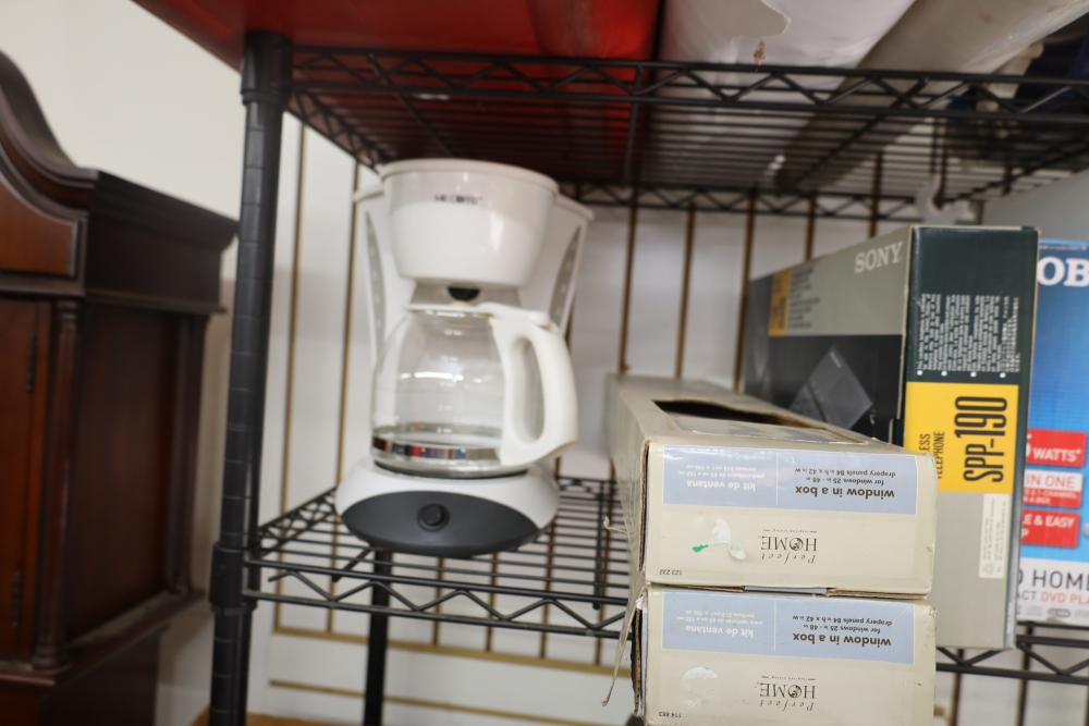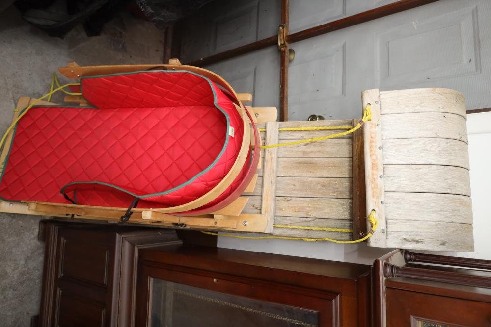 Remaining contents of garage incl; two tall brass table lamps without shades, framed abstract art signed Pradier, five tier metal shelf and contents including Torrison Balance scale, four three packs of starting fire logs, audio system , COBY DVD home theater system, two bob sleds, grandfather clock with weights and pendulum, craftsmen shop vac, camping lamps with lamp oil, paper towel dispenser, handheld foot light, Coleman cooler, nails, screws, jumper cables, eight tier shelf with hardware, chemicals, paint, zip ties, caulk, screws , nails, washers, brackets, jumper cables, small chain, brake line, etc. Buyer must take all.