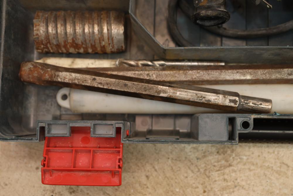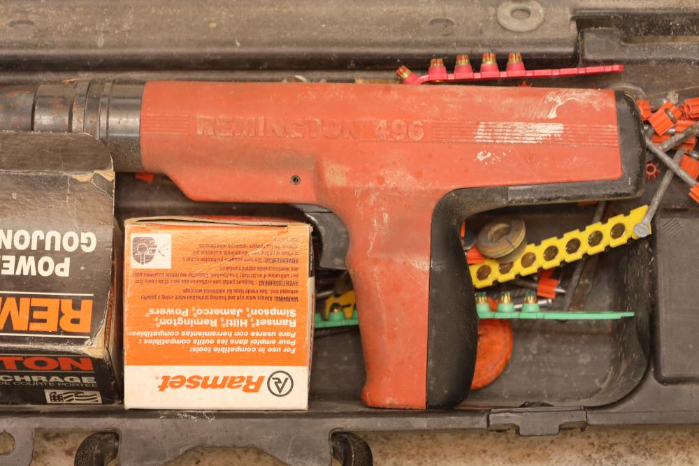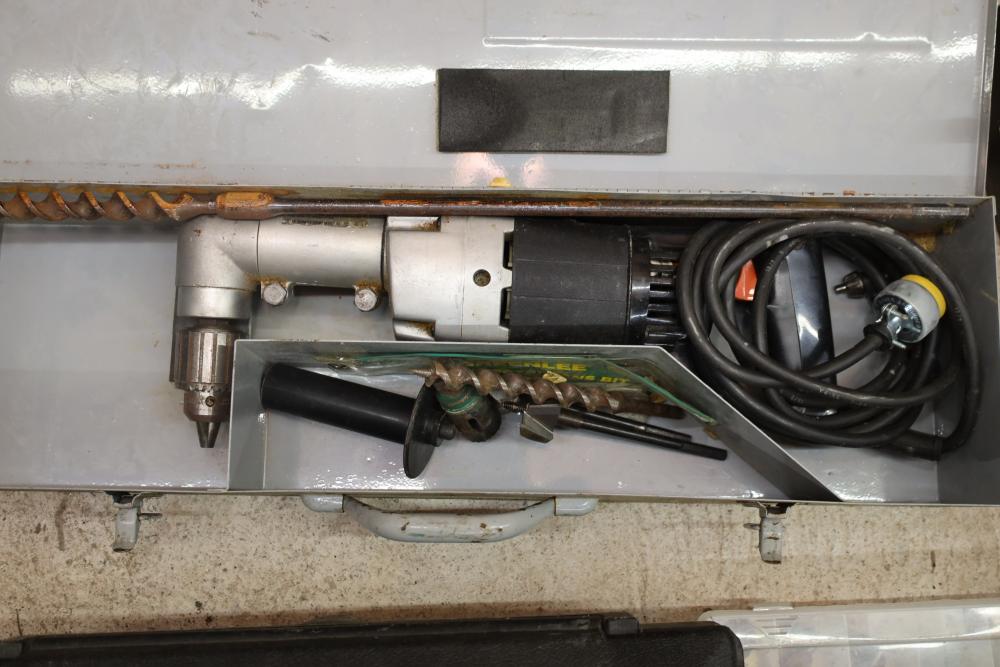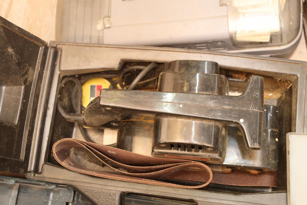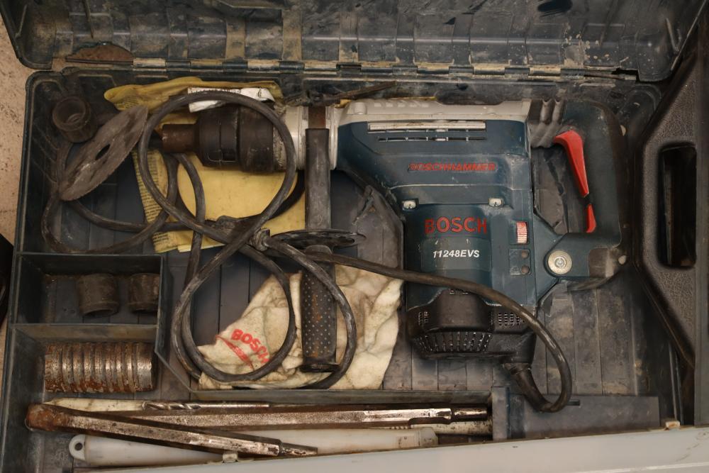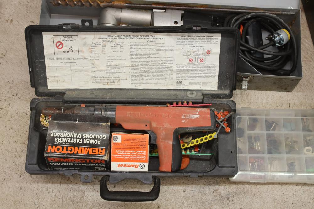 Corded power tools incl; Bosch 112348EVS hammer drill, AEG 1/2” right angle drill Model# D-122R/1, craftsman 3” belt sander Model# 315.11721, Remington powder actuated tool Model# 496 with fasteners, Dremel bits, hand saw, measuring tape, hand drills, etc. Buyer must take all.