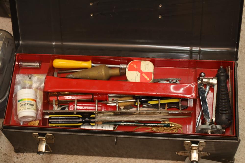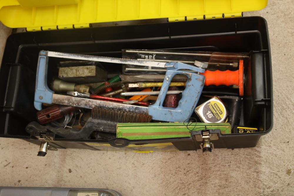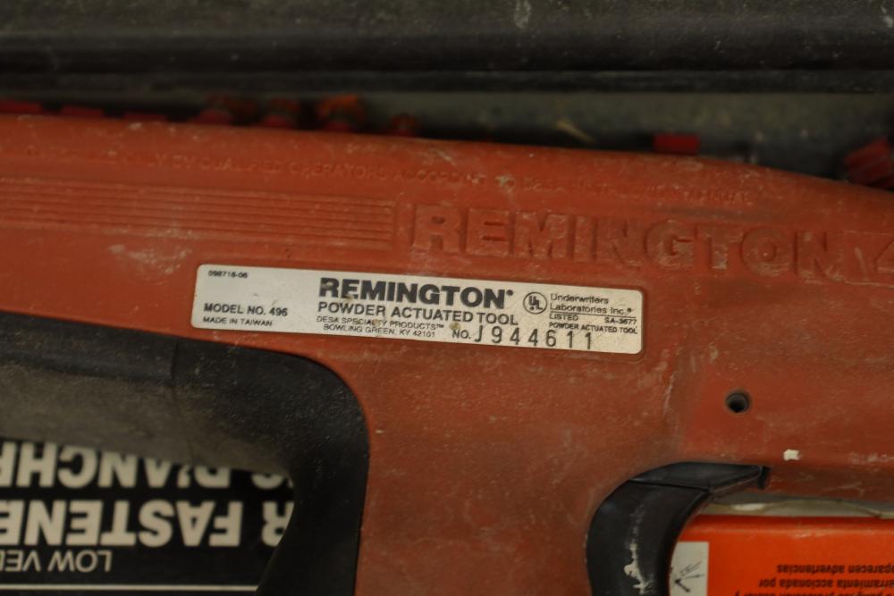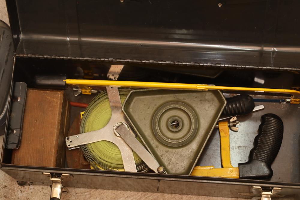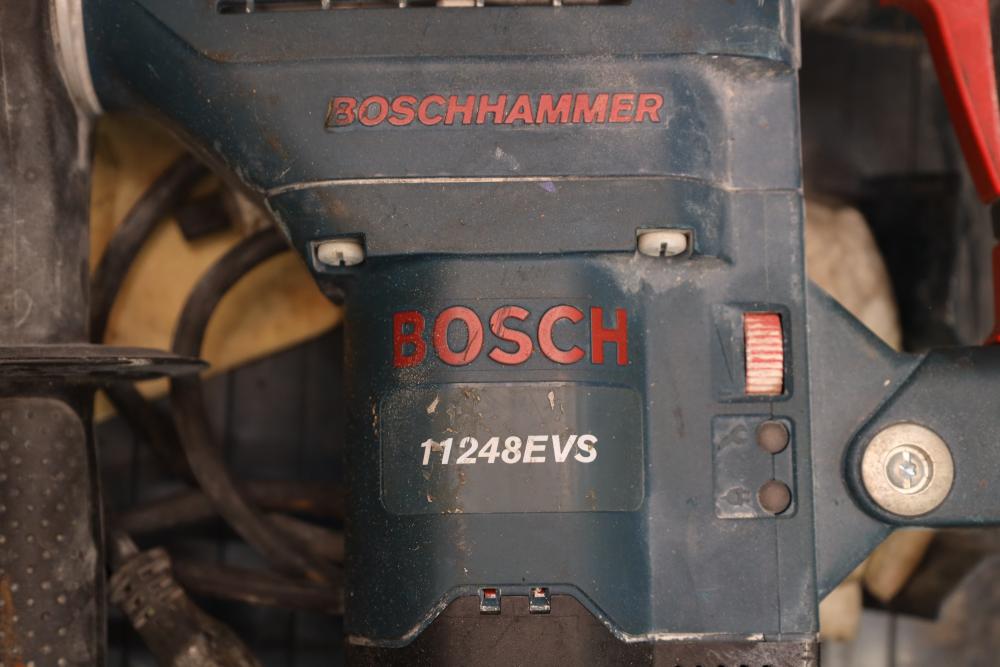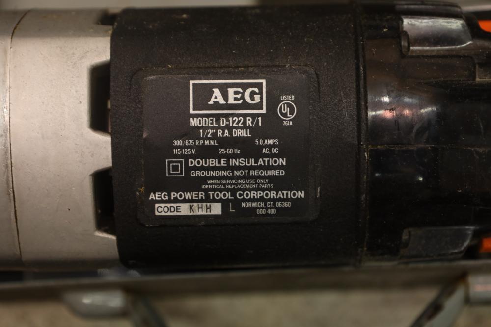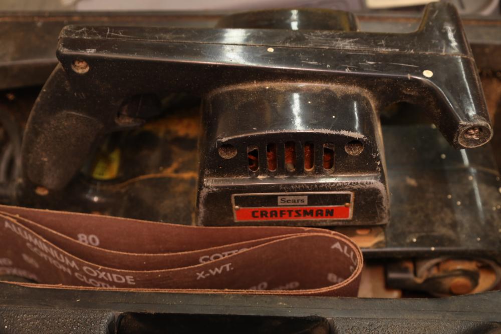 Corded power tools incl; Bosch 112348EVS hammer drill, AEG 1/2” right angle drill Model# D-122R/1, craftsman 3” belt sander Model# 315.11721, Remington powder actuated tool Model# 496 with fasteners, Dremel bits, hand saw, measuring tape, hand drills, etc. Buyer must take all.