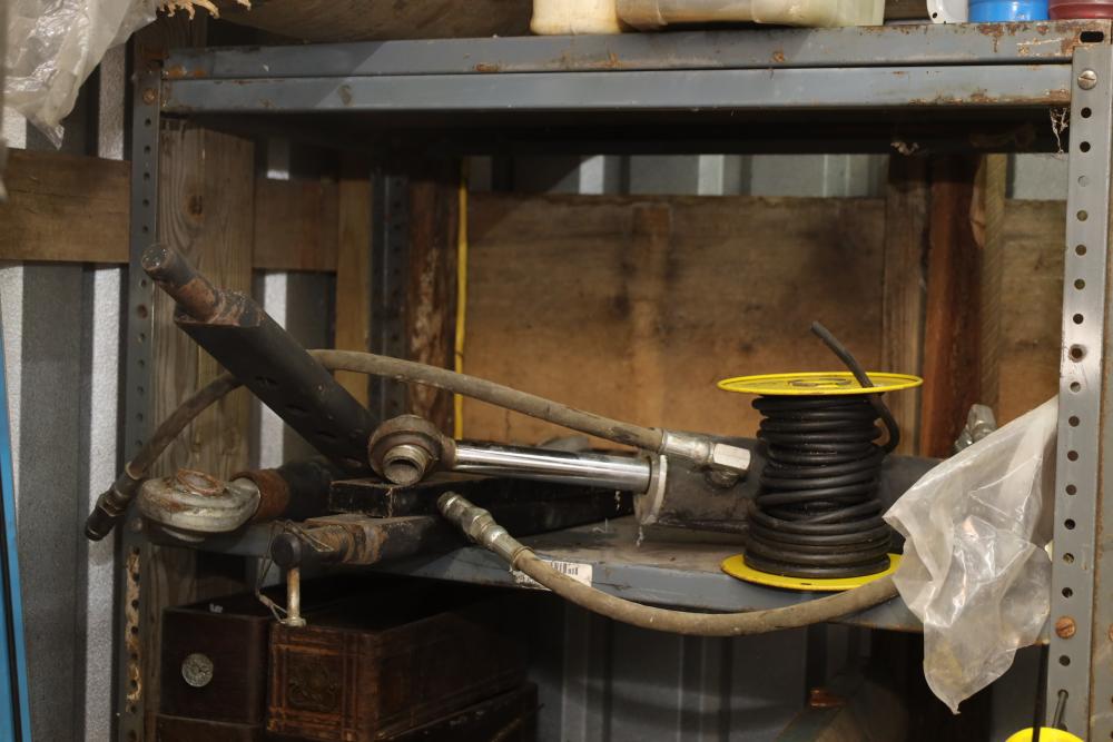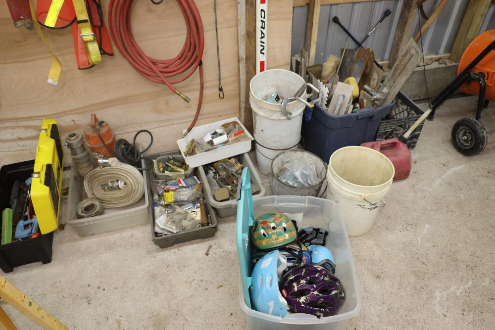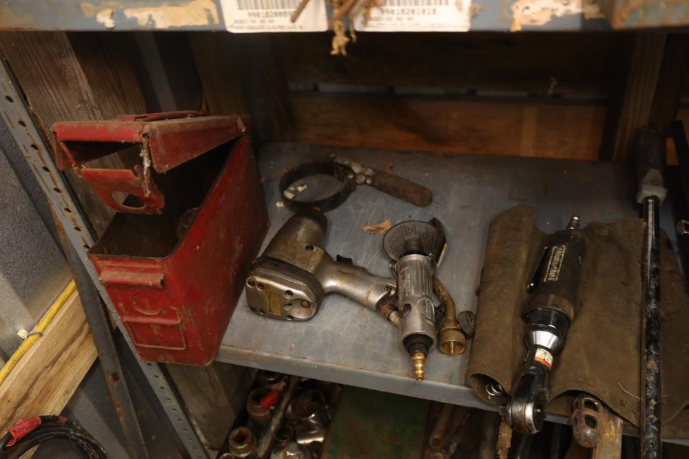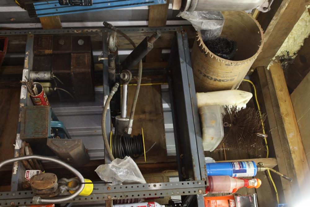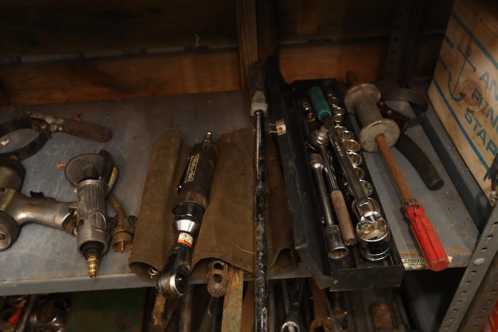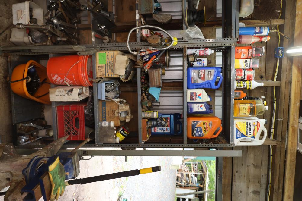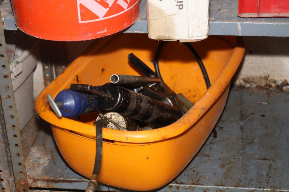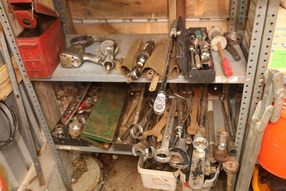 Remaining contents and two six tier metal shelves and contents; grease guns, large gauge socket wrenches and ratchet, sockets, pneumatic air wrench, wire strainers, anchor fence staples, yard nails, fence pole caps, prying bars, air hose fittings, (Large wrenches and sockets, some brands include Snap-On Pittsburgh, great neck, some size include 1-5/8”, 2”, 1-7/8”, 1-3/4”, also including torque wrenches, central pneumatic cutoff tool 07077, pneumatic impact gun, porter cable pneumatic air wrench, hand planers, c clamps, saw blades, tool boxes, Sylvania radios, metal mailbox, electric tone battery charger c60, rubber mallets, brushes, painting materials, tools, straps, braided cable wire, bicycle helmets, hinges, door handles, air hose, athletic field marker, safety harness, have a heart traps, acetylene tanks, extension cords, crowbars, rakes, digger bar, two ground torches, chain, surge protectors, plastic totes, spools of wire, automotive fluids and cleaning supplies, two sawhorses, distilling containers, WINE PRESS LOCATED IN ADJACENT 20FT CONTAINER, etc. Buyer must take all.
