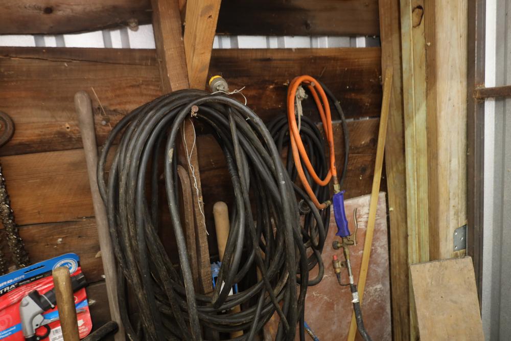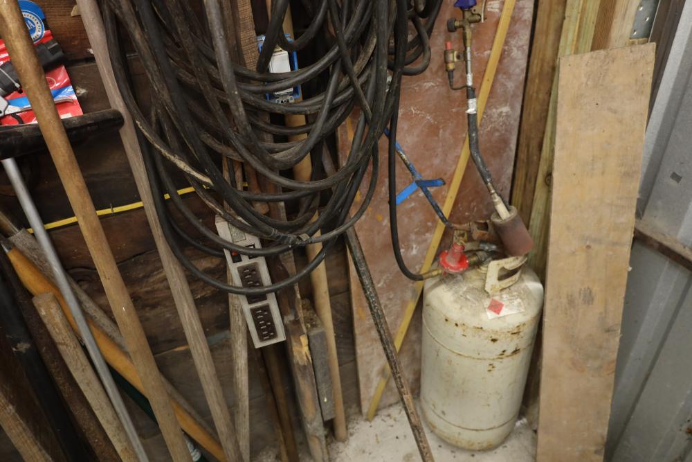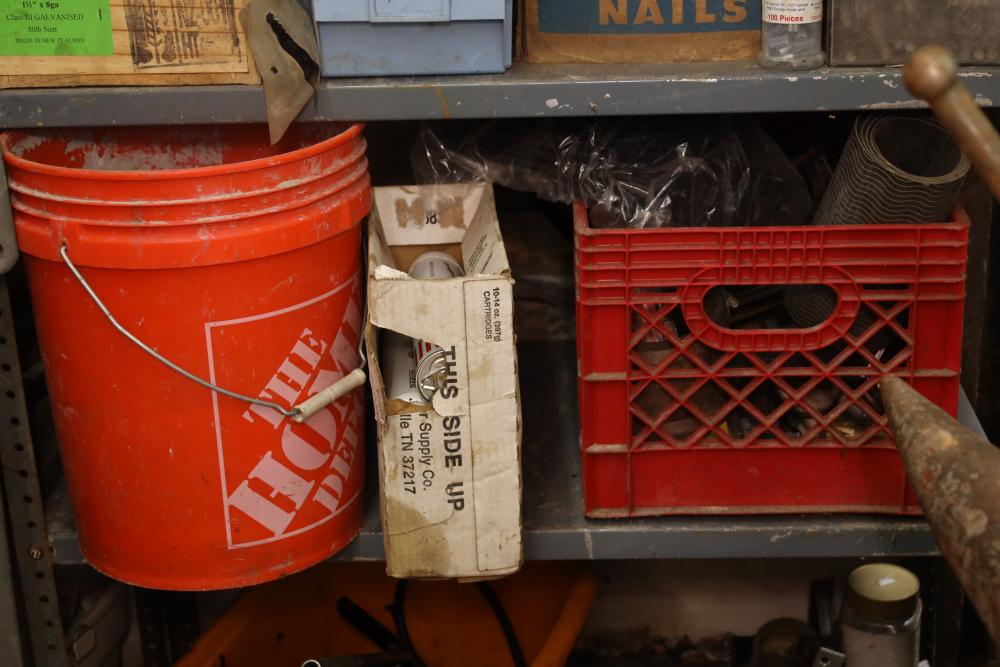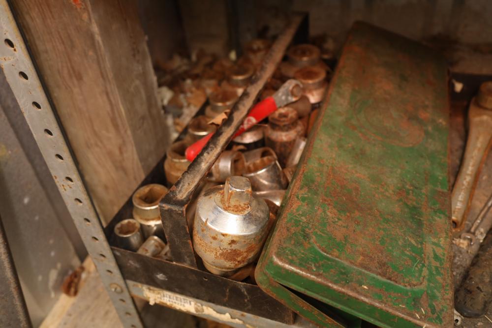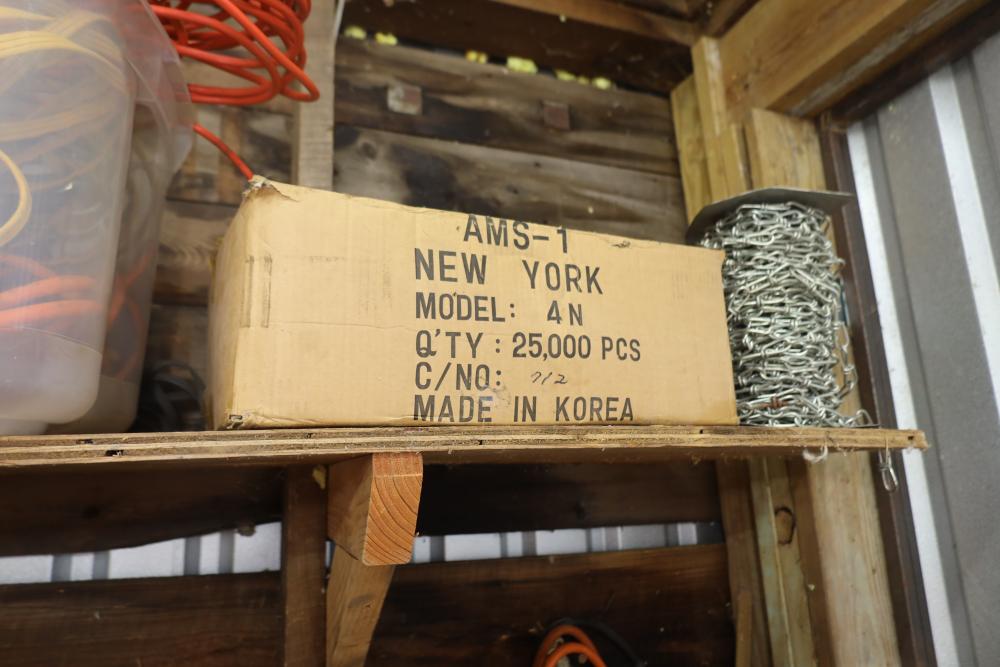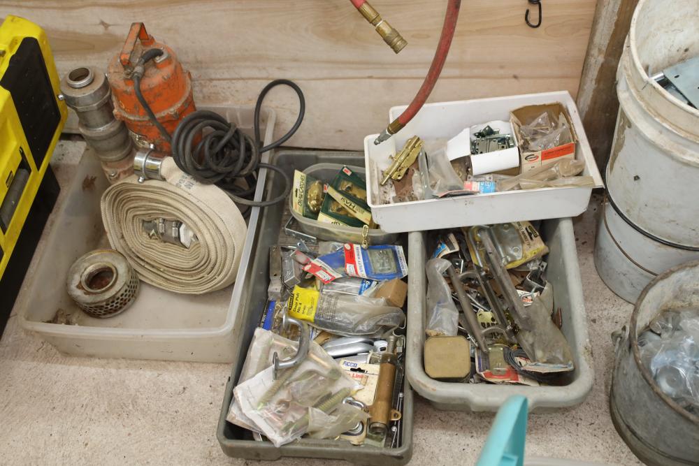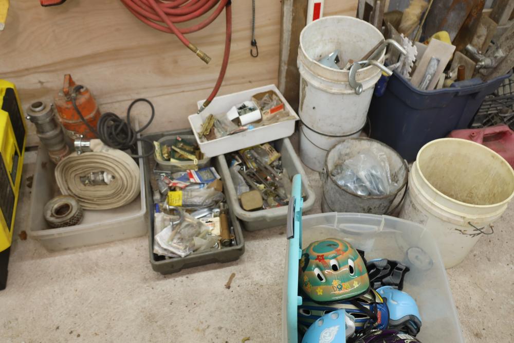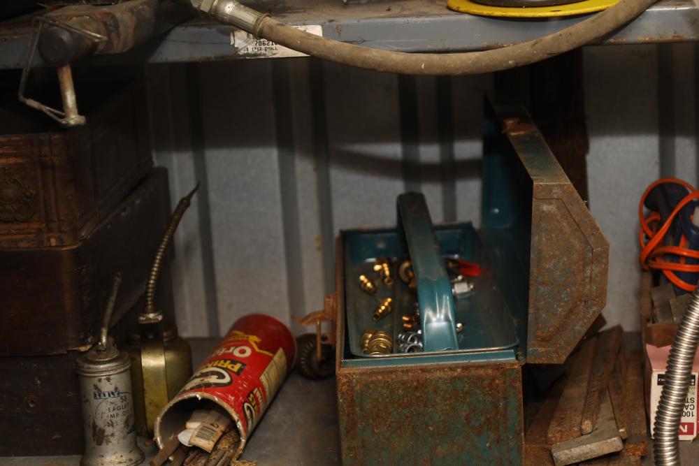 Remaining contents and two six tier metal shelves and contents; grease guns, large gauge socket wrenches and ratchet, sockets, pneumatic air wrench, wire strainers, anchor fence staples, yard nails, fence pole caps, prying bars, air hose fittings, (Large wrenches and sockets, some brands include Snap-On Pittsburgh, great neck, some size include 1-5/8”, 2”, 1-7/8”, 1-3/4”, also including torque wrenches, central pneumatic cutoff tool 07077, pneumatic impact gun, porter cable pneumatic air wrench, hand planers, c clamps, saw blades, tool boxes, Sylvania radios, metal mailbox, electric tone battery charger c60, rubber mallets, brushes, painting materials, tools, straps, braided cable wire, bicycle helmets, hinges, door handles, air hose, athletic field marker, safety harness, have a heart traps, acetylene tanks, extension cords, crowbars, rakes, digger bar, two ground torches, chain, surge protectors, plastic totes, spools of wire, automotive fluids and cleaning supplies, two sawhorses, distilling containers, WINE PRESS LOCATED IN ADJACENT 20FT CONTAINER, etc. Buyer must take all.