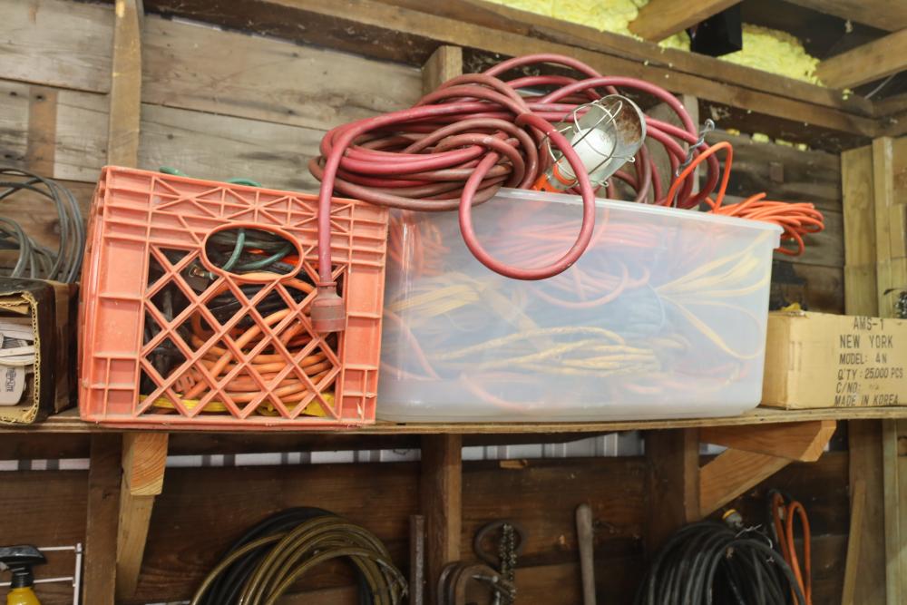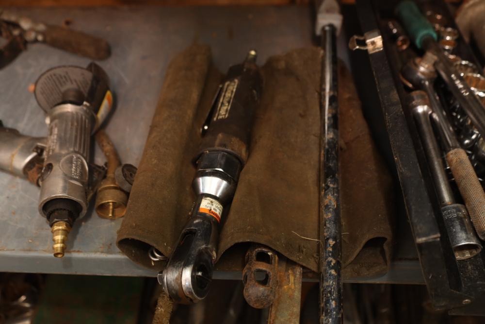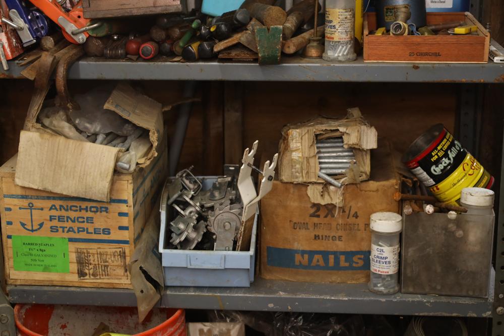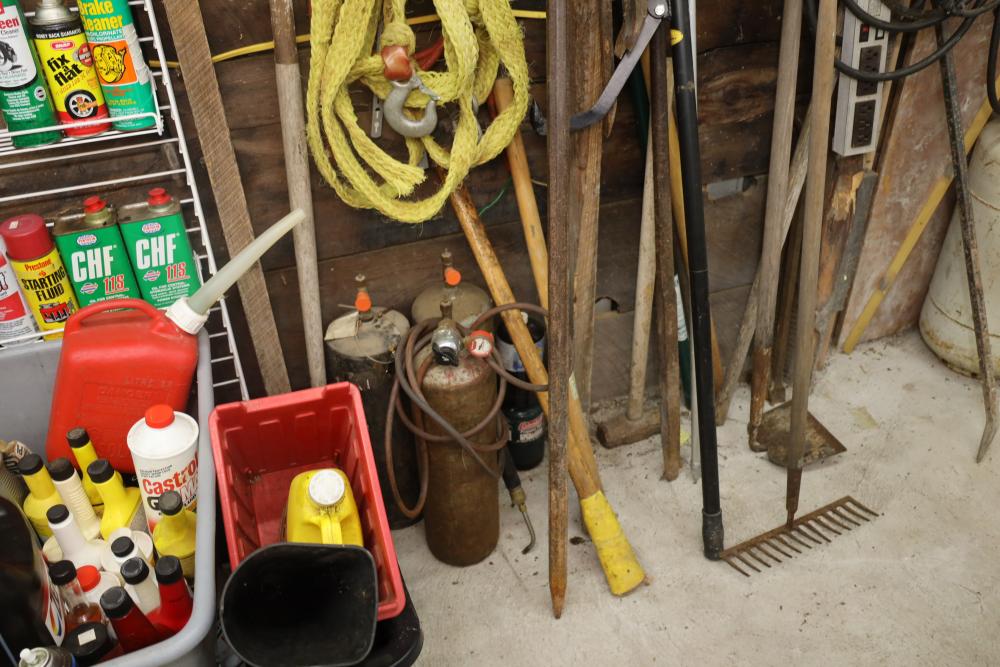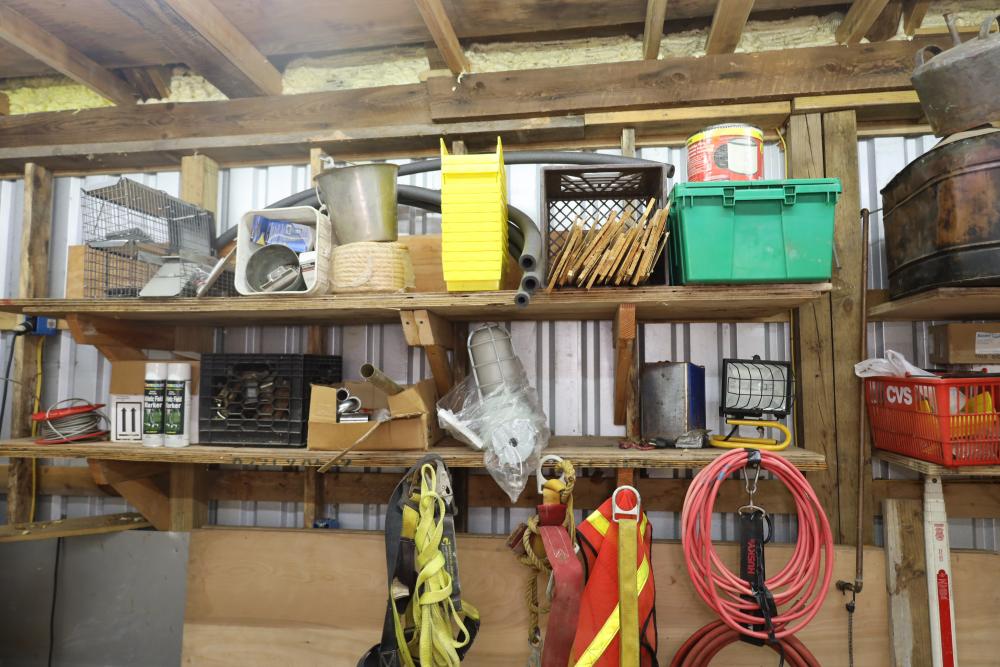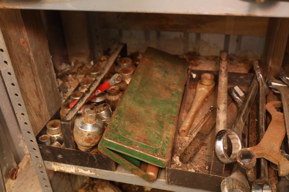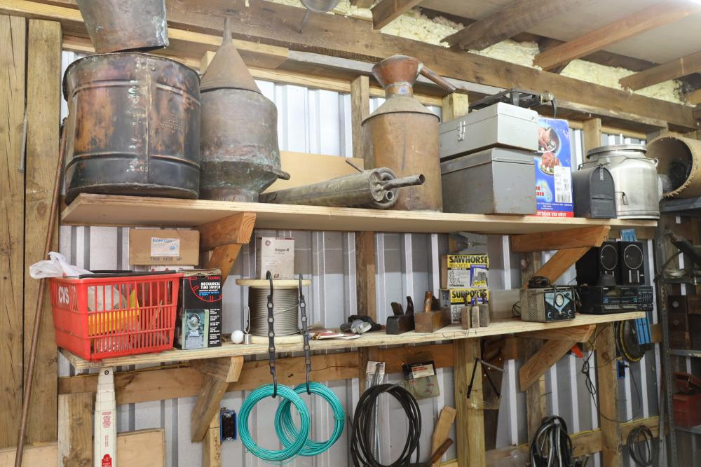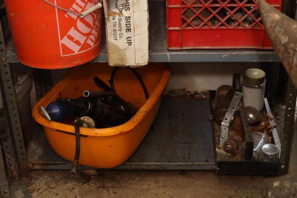 Remaining contents and two six tier metal shelves and contents; grease guns, large gauge socket wrenches and ratchet, sockets, pneumatic air wrench, wire strainers, anchor fence staples, yard nails, fence pole caps, prying bars, air hose fittings, (Large wrenches and sockets, some brands include Snap-On Pittsburgh, great neck, some size include 1-5/8”, 2”, 1-7/8”, 1-3/4”, also including torque wrenches, central pneumatic cutoff tool 07077, pneumatic impact gun, porter cable pneumatic air wrench, hand planers, c clamps, saw blades, tool boxes, Sylvania radios, metal mailbox, electric tone battery charger c60, rubber mallets, brushes, painting materials, tools, straps, braided cable wire, bicycle helmets, hinges, door handles, air hose, athletic field marker, safety harness, have a heart traps, acetylene tanks, extension cords, crowbars, rakes, digger bar, two ground torches, chain, surge protectors, plastic totes, spools of wire, automotive fluids and cleaning supplies, two sawhorses, distilling containers, WINE PRESS LOCATED IN ADJACENT 20FT CONTAINER, etc. Buyer must take all.