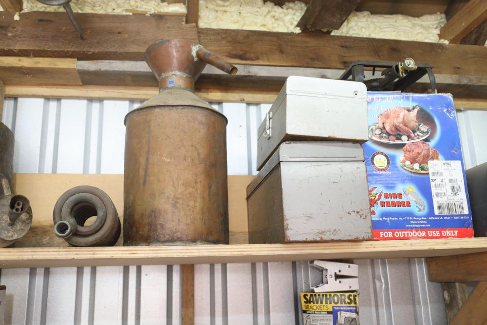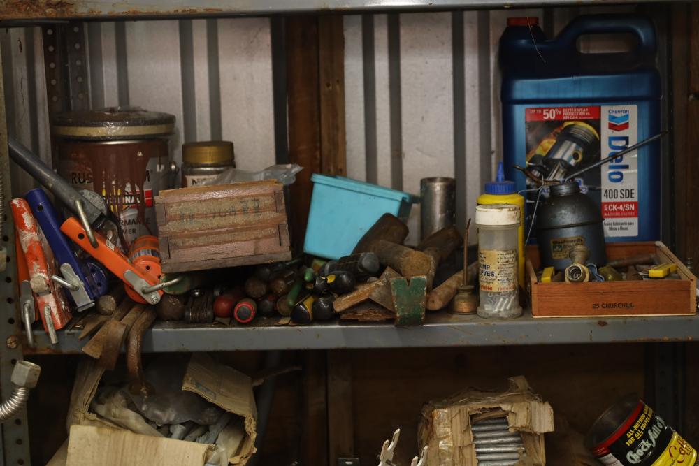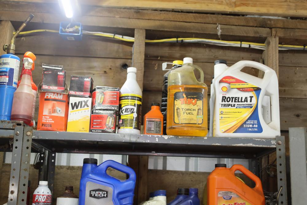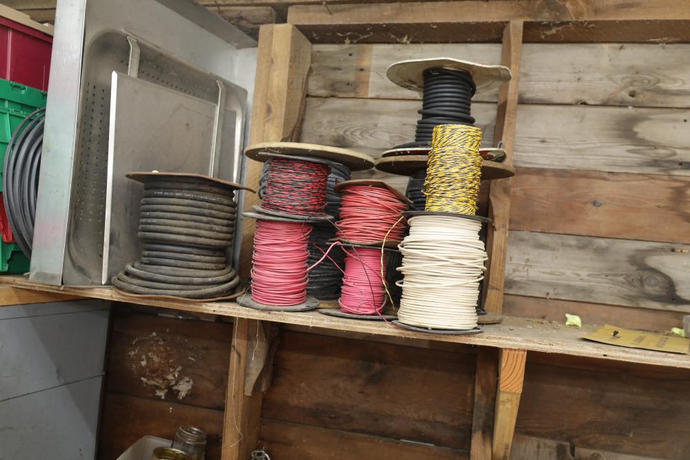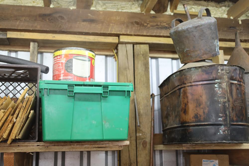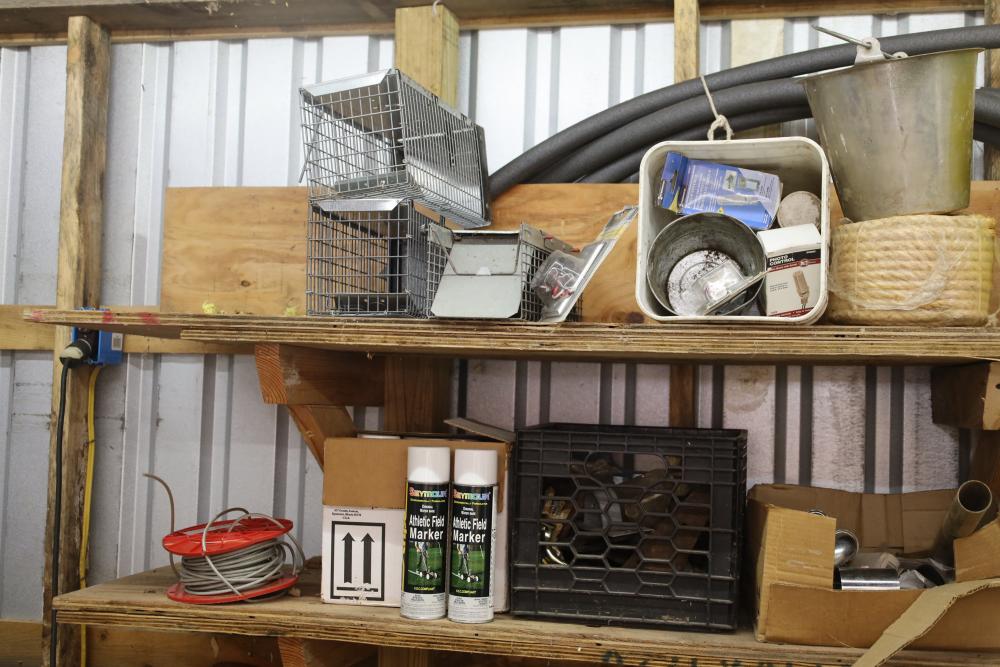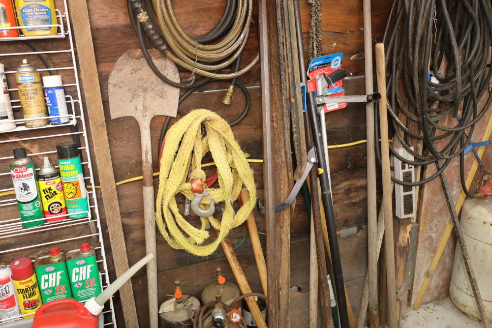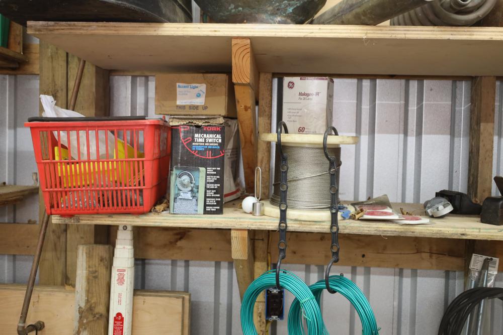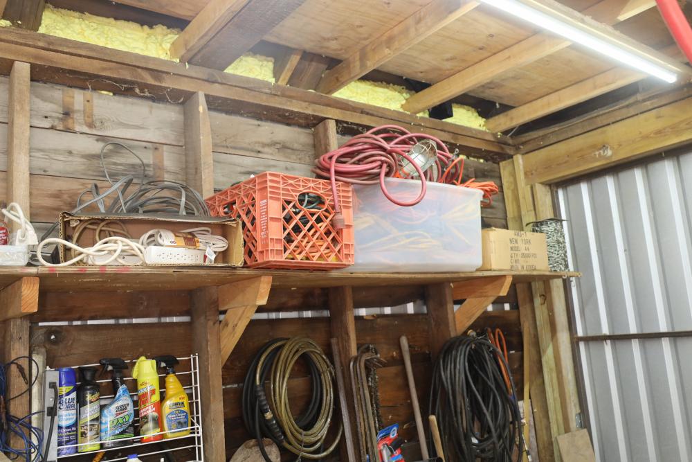 Remaining contents and two six tier metal shelves and contents; grease guns, large gauge socket wrenches and ratchet, sockets, pneumatic air wrench, wire strainers, anchor fence staples, yard nails, fence pole caps, prying bars, air hose fittings, (Large wrenches and sockets, some brands include Snap-On Pittsburgh, great neck, some size include 1-5/8”, 2”, 1-7/8”, 1-3/4”, also including torque wrenches, central pneumatic cutoff tool 07077, pneumatic impact gun, porter cable pneumatic air wrench, hand planers, c clamps, saw blades, tool boxes, Sylvania radios, metal mailbox, electric tone battery charger c60, rubber mallets, brushes, painting materials, tools, straps, braided cable wire, bicycle helmets, hinges, door handles, air hose, athletic field marker, safety harness, have a heart traps, acetylene tanks, extension cords, crowbars, rakes, digger bar, two ground torches, chain, surge protectors, plastic totes, spools of wire, automotive fluids and cleaning supplies, two sawhorses, distilling containers, WINE PRESS LOCATED IN ADJACENT 20FT CONTAINER, etc. Buyer must take all.