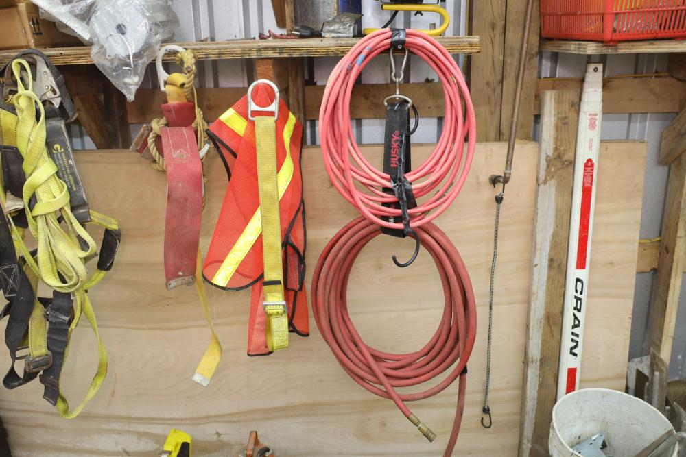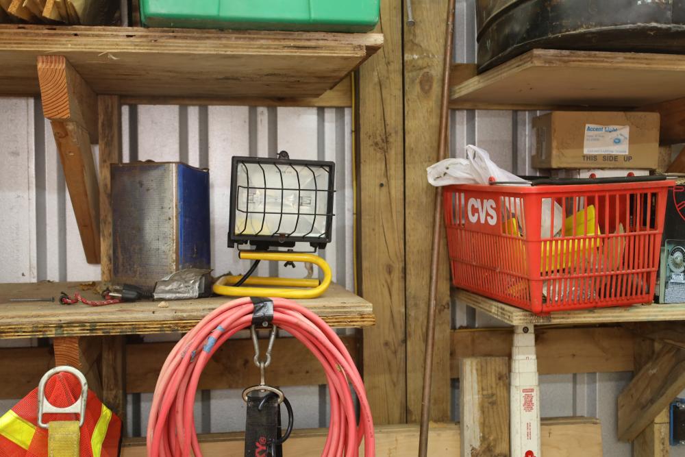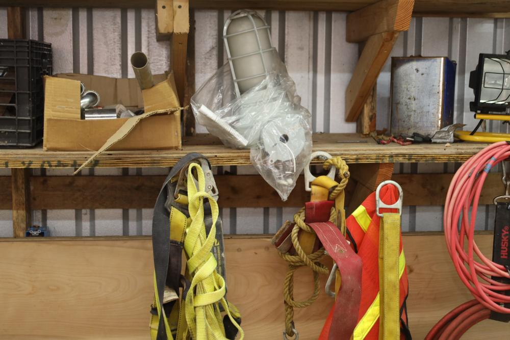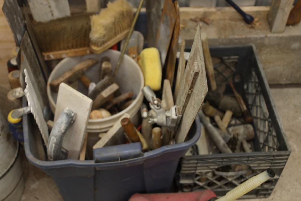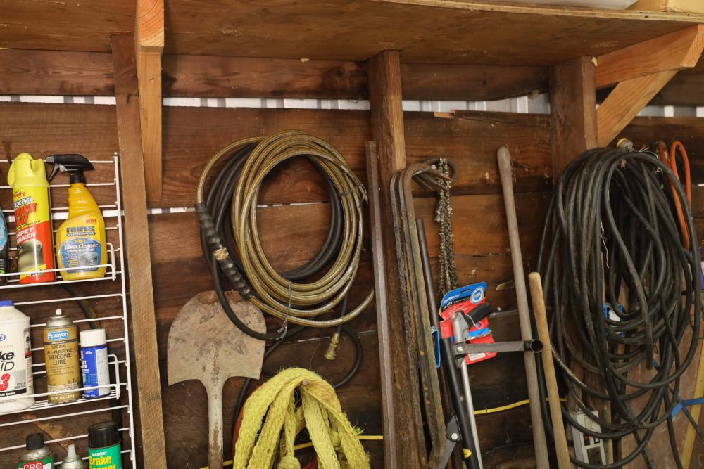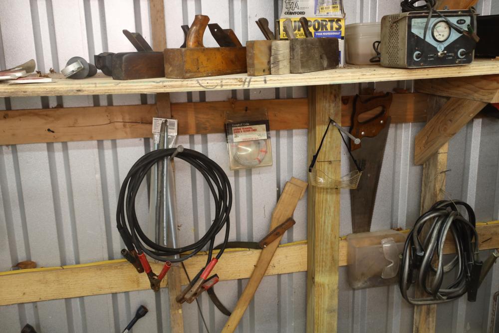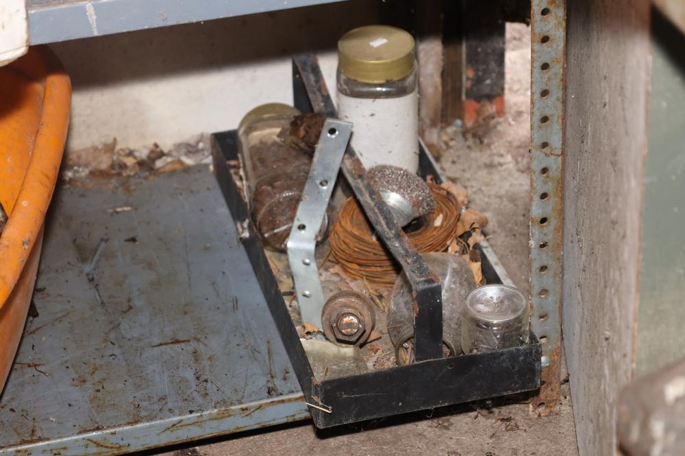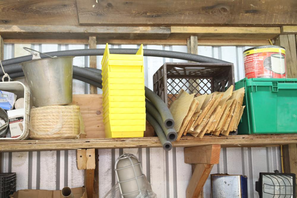 Remaining contents and two six tier metal shelves and contents; grease guns, large gauge socket wrenches and ratchet, sockets, pneumatic air wrench, wire strainers, anchor fence staples, yard nails, fence pole caps, prying bars, air hose fittings, (Large wrenches and sockets, some brands include Snap-On Pittsburgh, great neck, some size include 1-5/8”, 2”, 1-7/8”, 1-3/4”, also including torque wrenches, central pneumatic cutoff tool 07077, pneumatic impact gun, porter cable pneumatic air wrench, hand planers, c clamps, saw blades, tool boxes, Sylvania radios, metal mailbox, electric tone battery charger c60, rubber mallets, brushes, painting materials, tools, straps, braided cable wire, bicycle helmets, hinges, door handles, air hose, athletic field marker, safety harness, have a heart traps, acetylene tanks, extension cords, crowbars, rakes, digger bar, two ground torches, chain, surge protectors, plastic totes, spools of wire, automotive fluids and cleaning supplies, two sawhorses, distilling containers, WINE PRESS LOCATED IN ADJACENT 20FT CONTAINER, etc. Buyer must take all.
