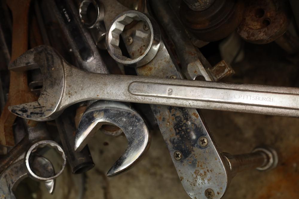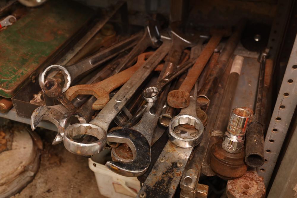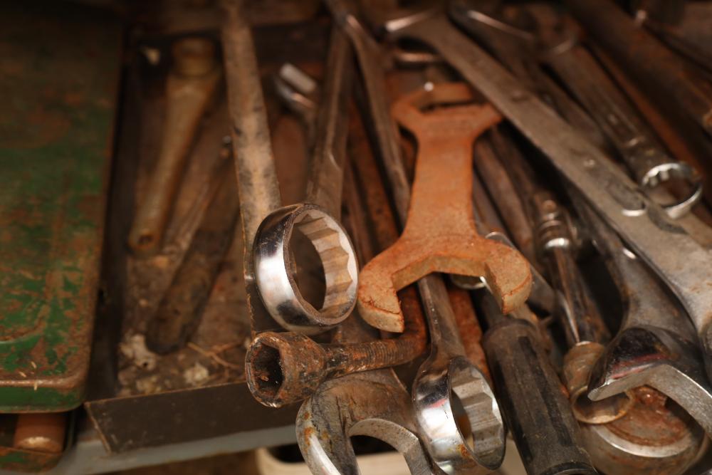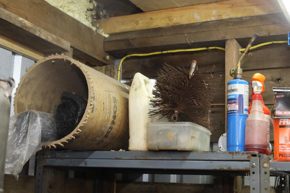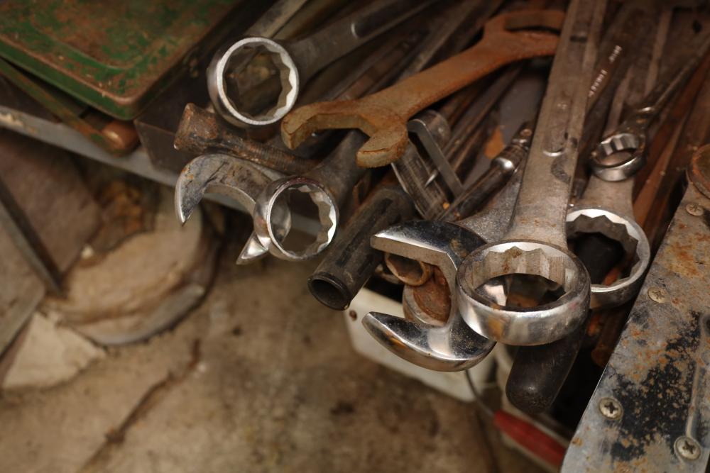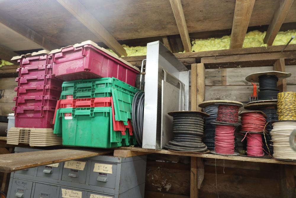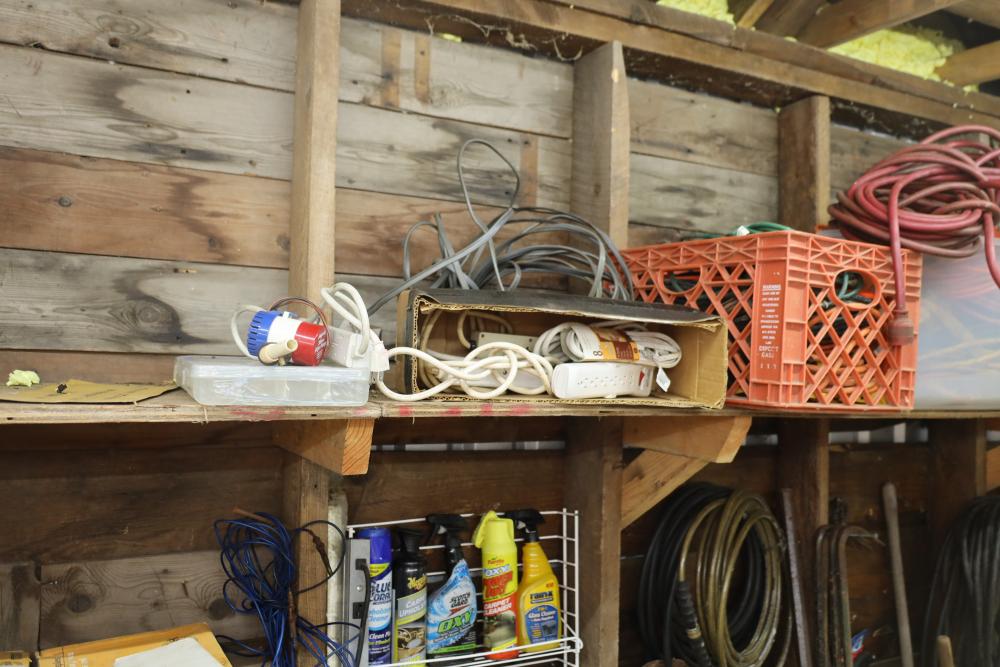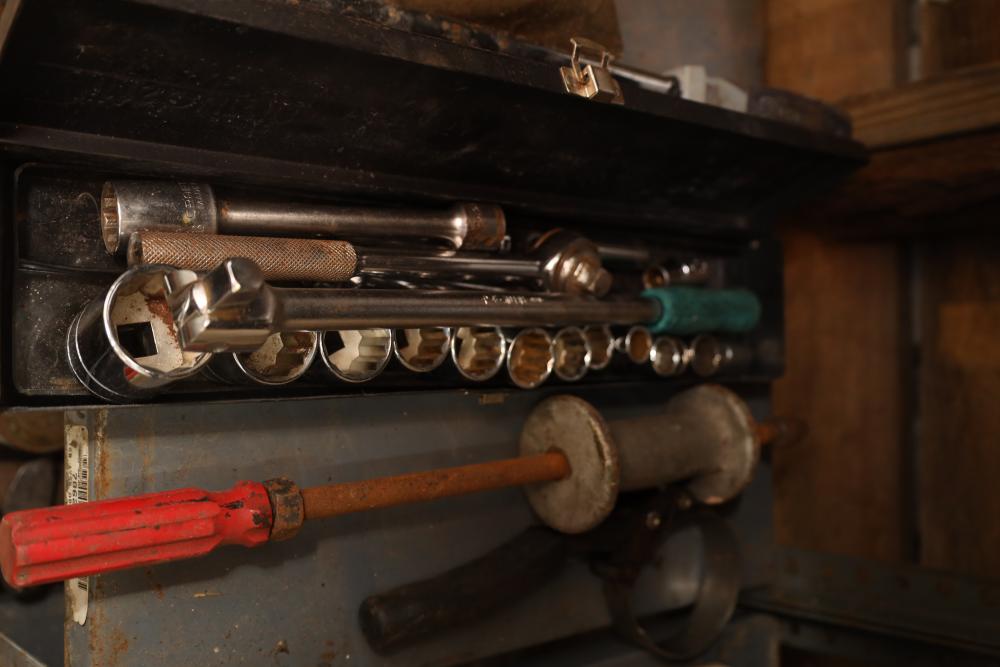 Remaining contents and two six tier metal shelves and contents; grease guns, large gauge socket wrenches and ratchet, sockets, pneumatic air wrench, wire strainers, anchor fence staples, yard nails, fence pole caps, prying bars, air hose fittings, (Large wrenches and sockets, some brands include Snap-On Pittsburgh, great neck, some size include 1-5/8”, 2”, 1-7/8”, 1-3/4”, also including torque wrenches, central pneumatic cutoff tool 07077, pneumatic impact gun, porter cable pneumatic air wrench, hand planers, c clamps, saw blades, tool boxes, Sylvania radios, metal mailbox, electric tone battery charger c60, rubber mallets, brushes, painting materials, tools, straps, braided cable wire, bicycle helmets, hinges, door handles, air hose, athletic field marker, safety harness, have a heart traps, acetylene tanks, extension cords, crowbars, rakes, digger bar, two ground torches, chain, surge protectors, plastic totes, spools of wire, automotive fluids and cleaning supplies, two sawhorses, distilling containers, WINE PRESS LOCATED IN ADJACENT 20FT CONTAINER, etc. Buyer must take all.
