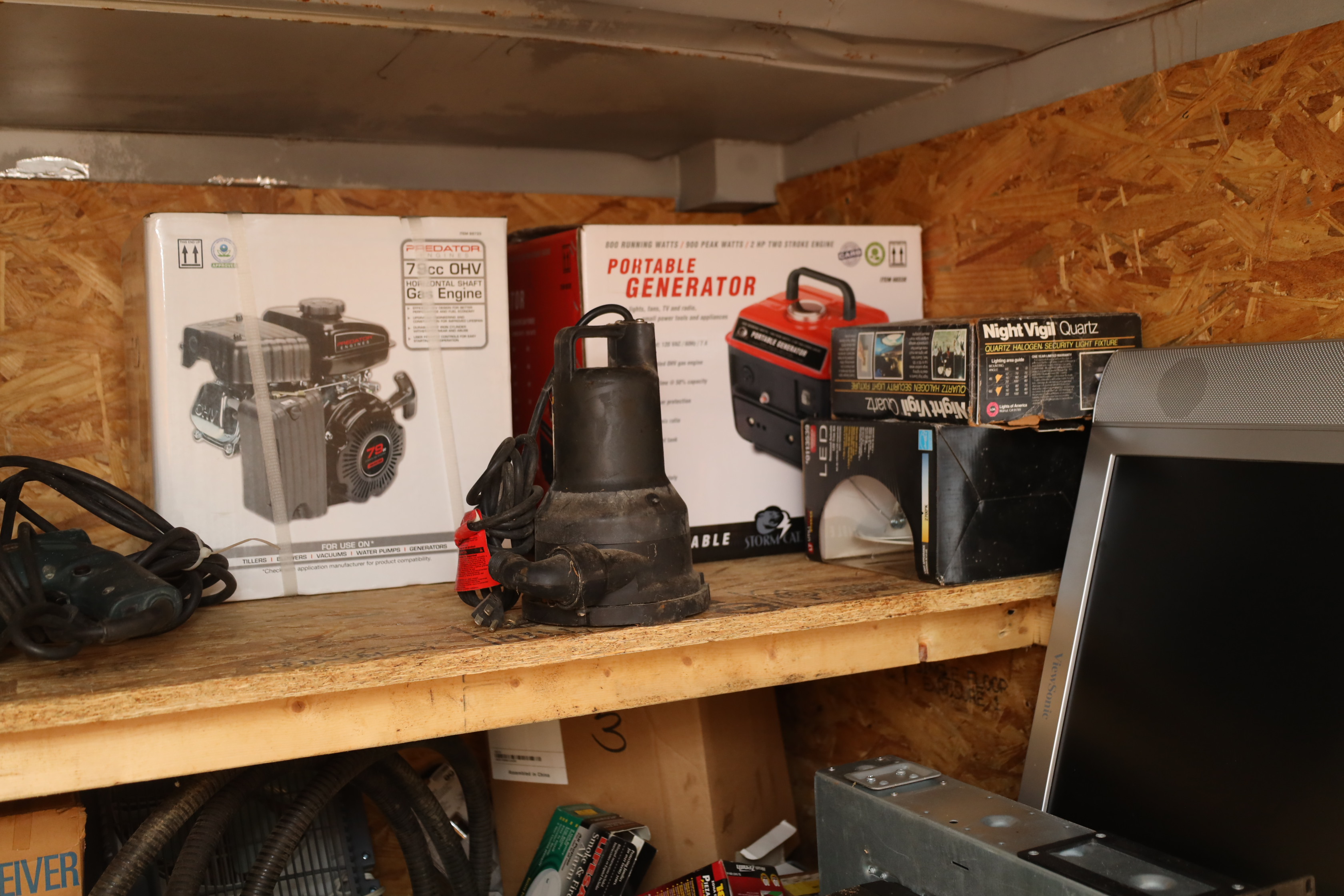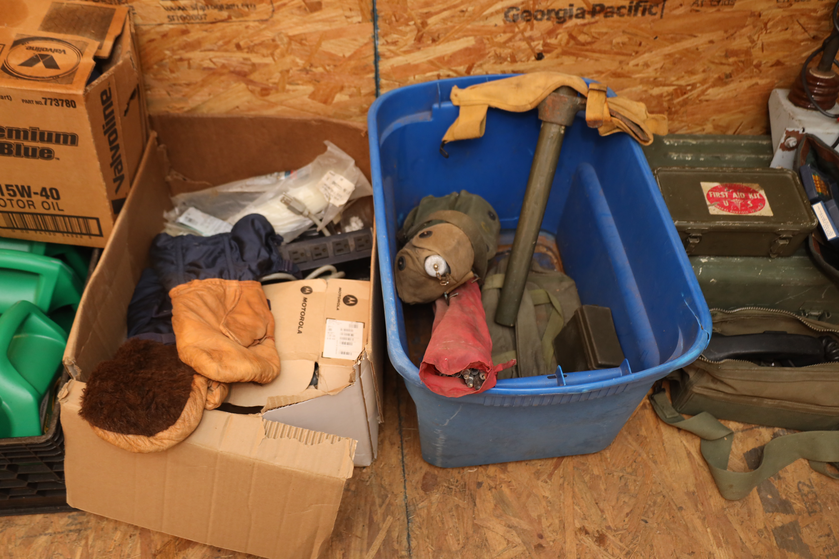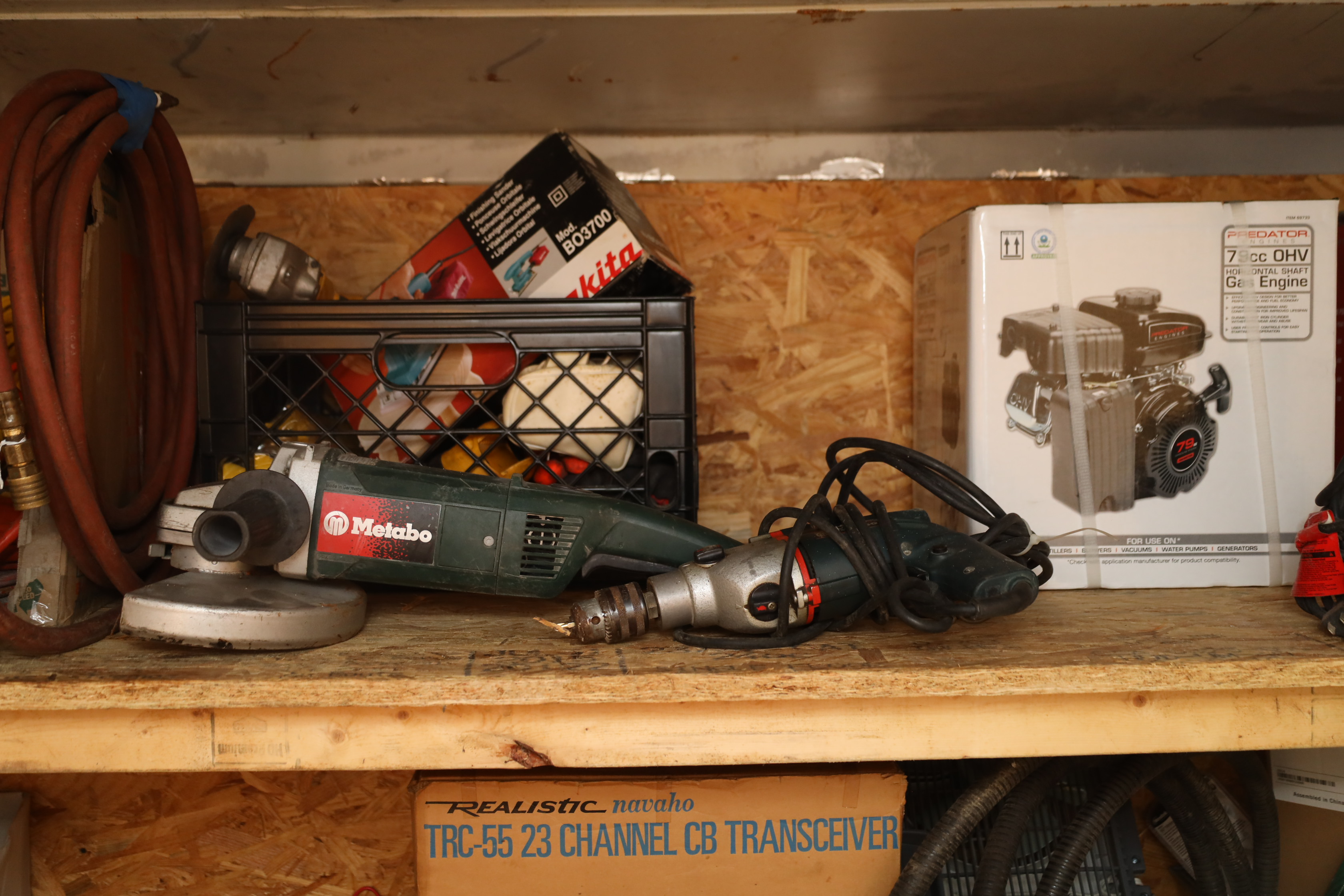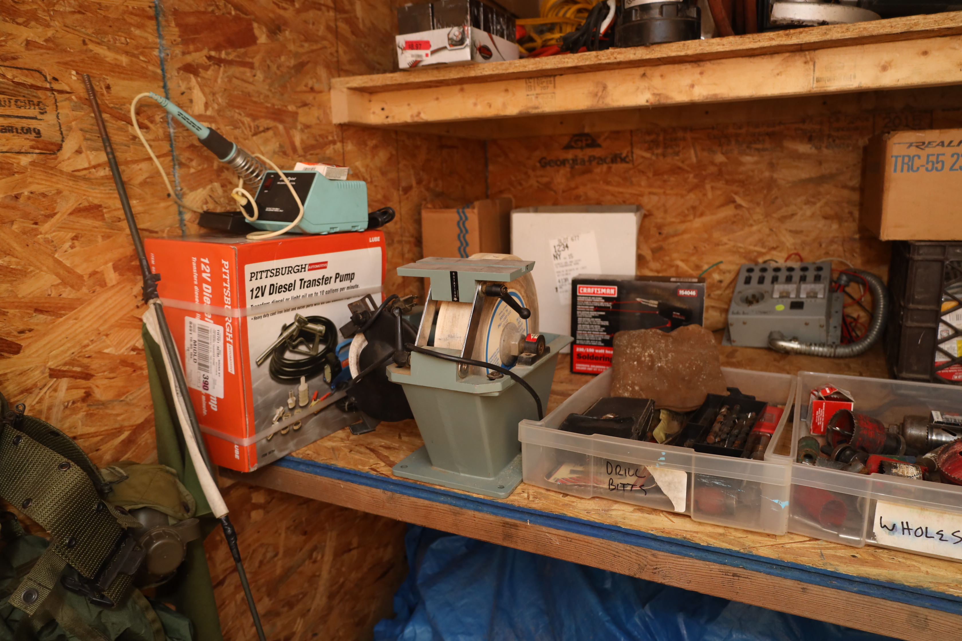 Container contents incl; motor oil, reproduction Luger pistol, US bayonet MK2 with wooden handle, three military helmets, military bags and harnesses, submersible pump, Metabo angle grinder MN 02230420, light fixtures, corded hand drill Model had14, Predator horizontal shaft gas engine 79CC IN#69733, Makita finishing sander mo b03700, Portable generator 800 running W, 1.1G fuel tank in original box, Pittsburgh 12v diesel transfer pump new and in original box, delta universal wet/dry grinder mo23-700 single phase, craftsmen 230/150W heavy duty soldering gun, drill bits, hole saw bits, probe, Allen keys, Sawzall blades, hacksaw blades, APC server equipment, vhs player, smoke detector, batteries, pesticide, radio from 1950’s Jeep, etc. DOES NOT INCLUDE WINE PRESS AND MATERIALS. Buyer must take all.