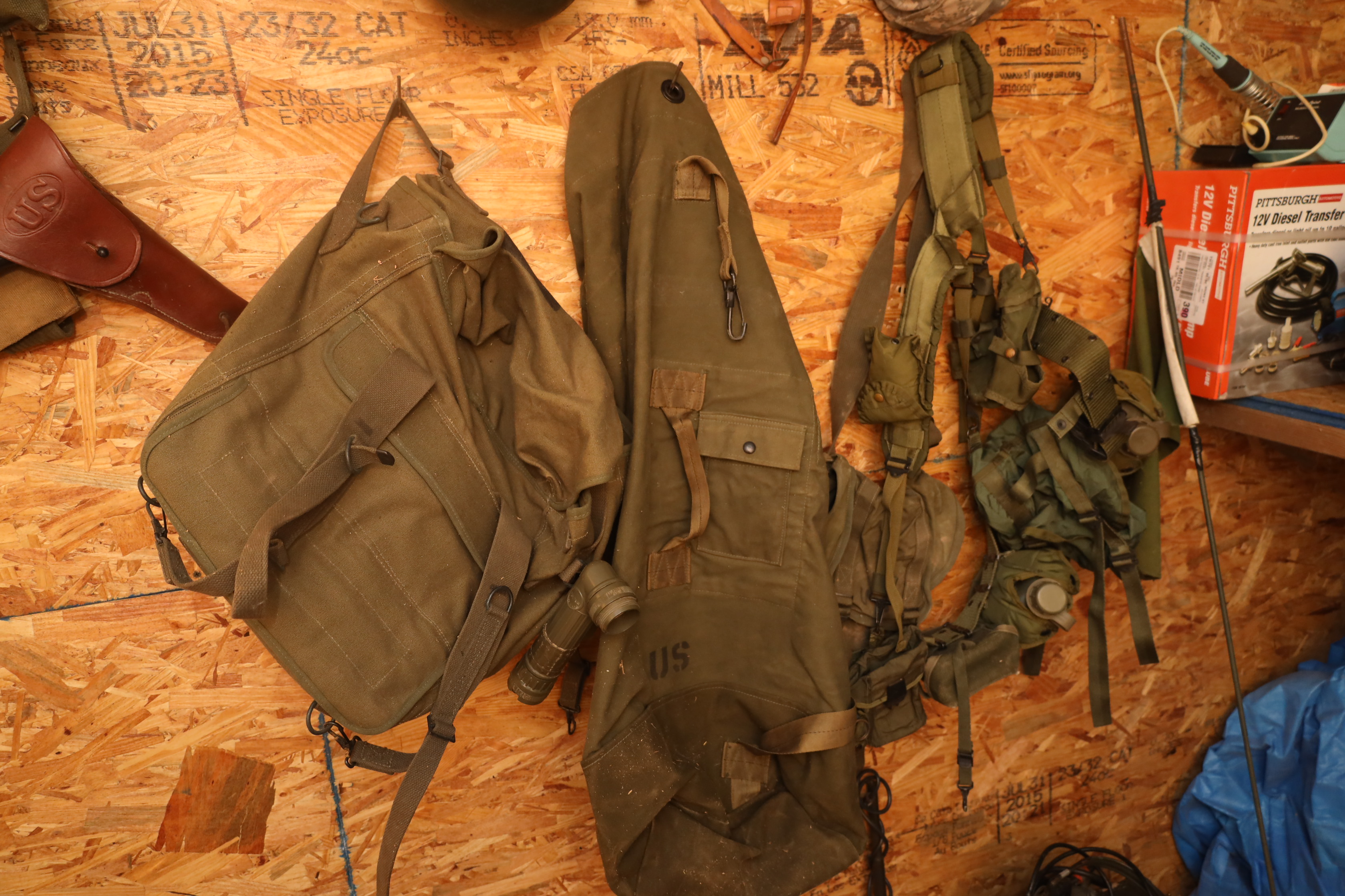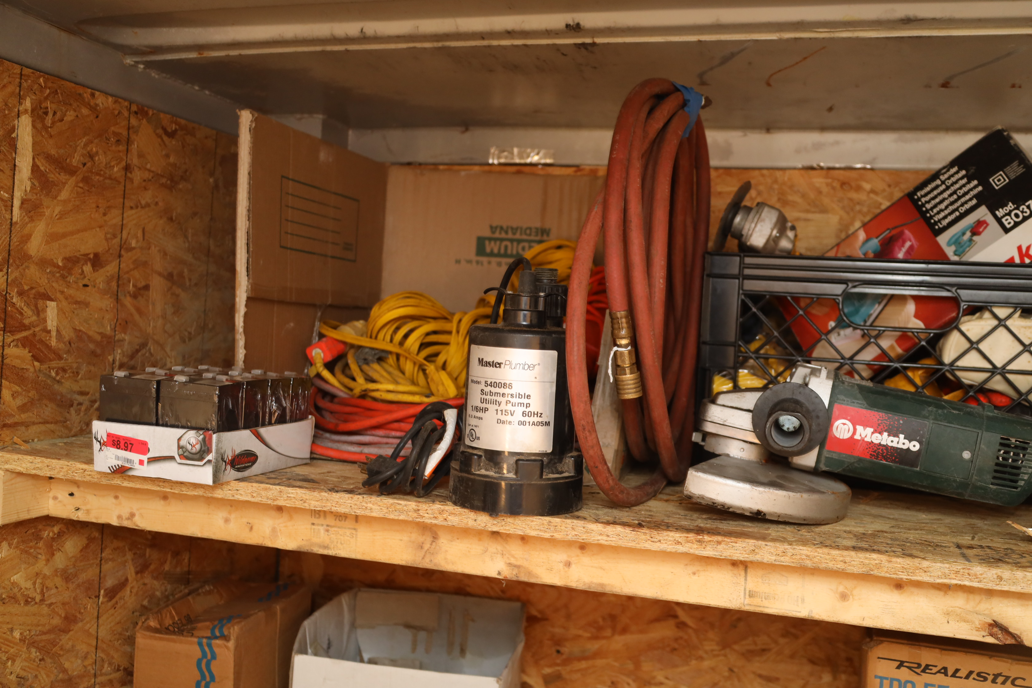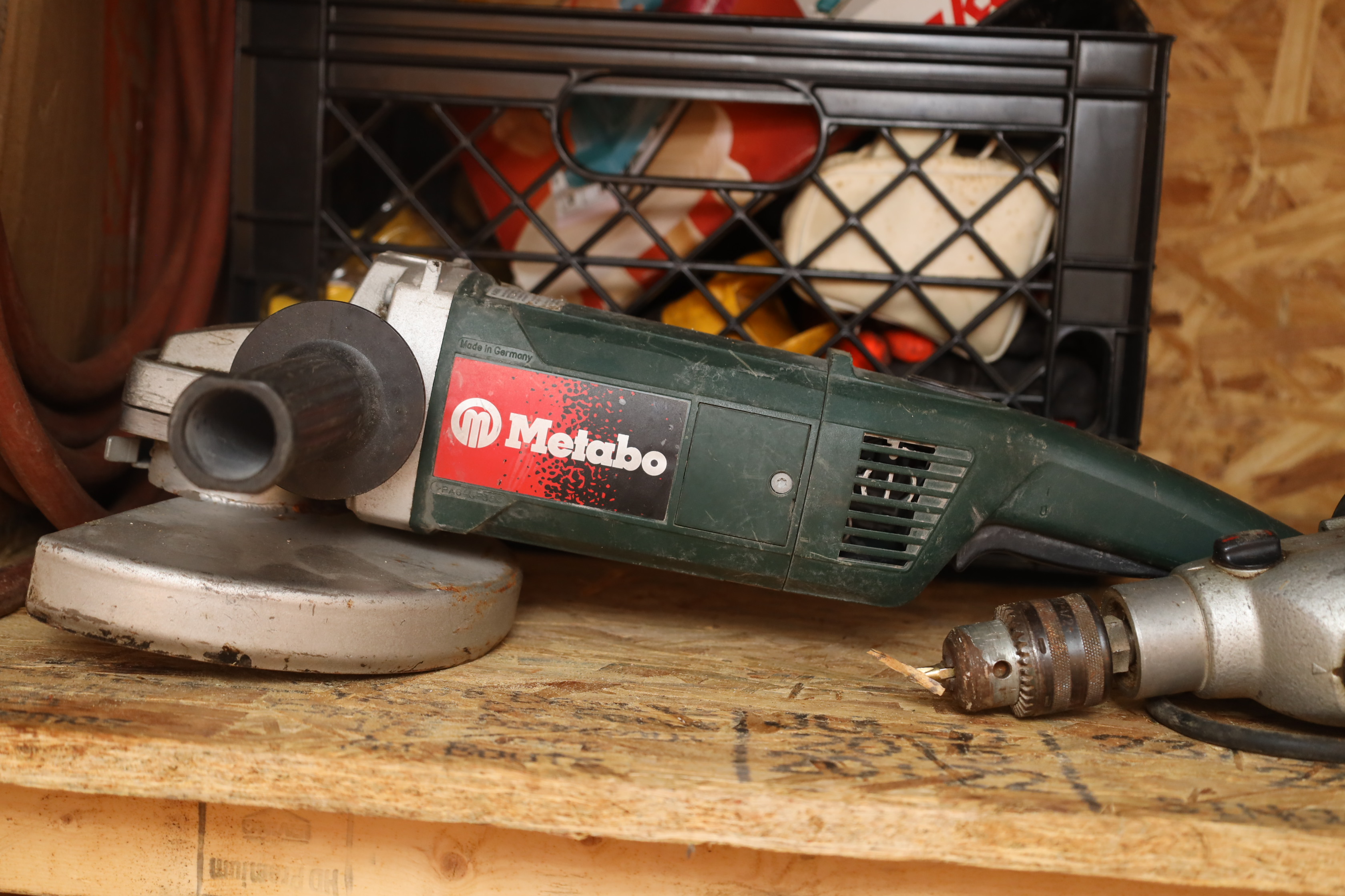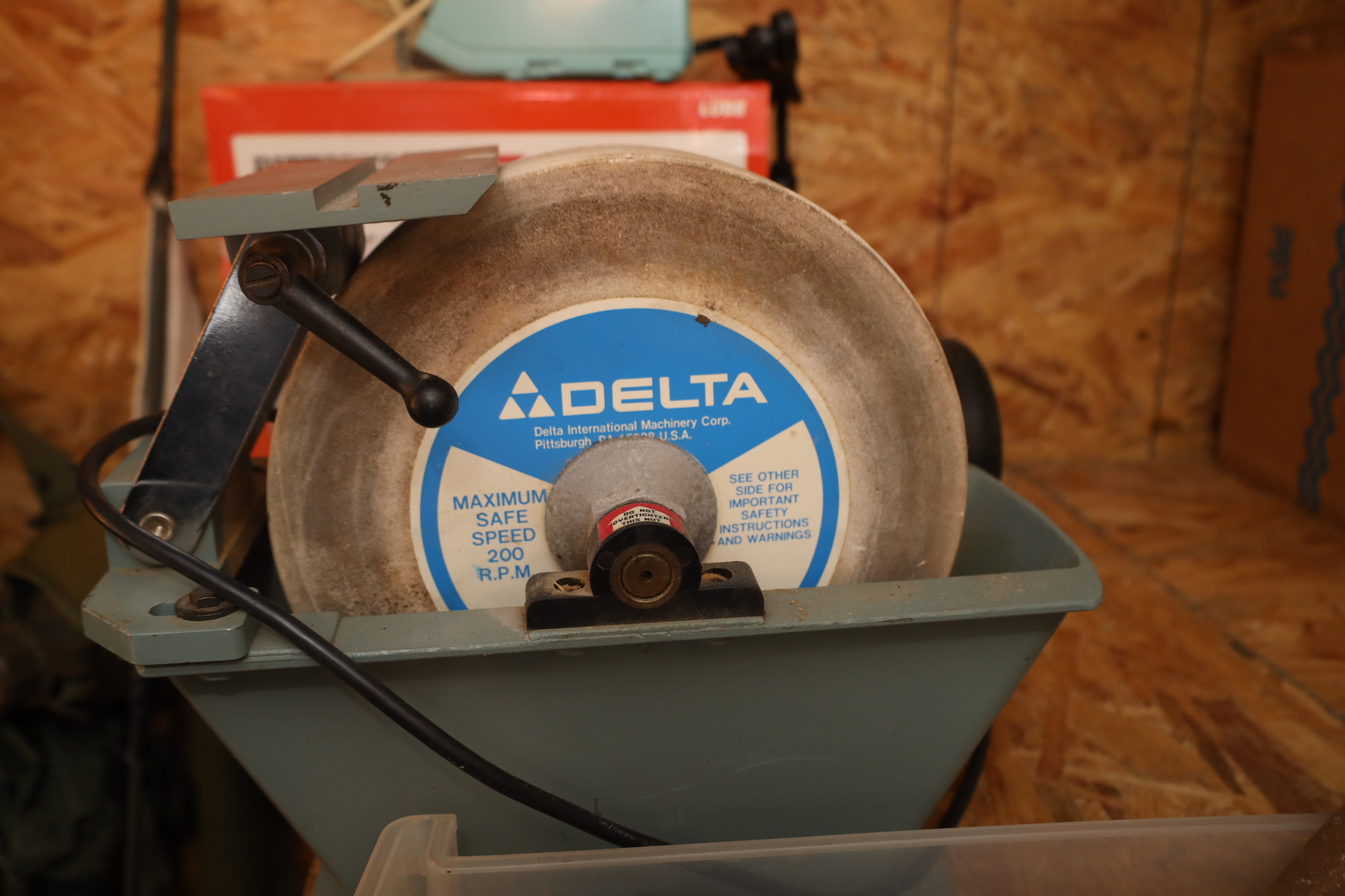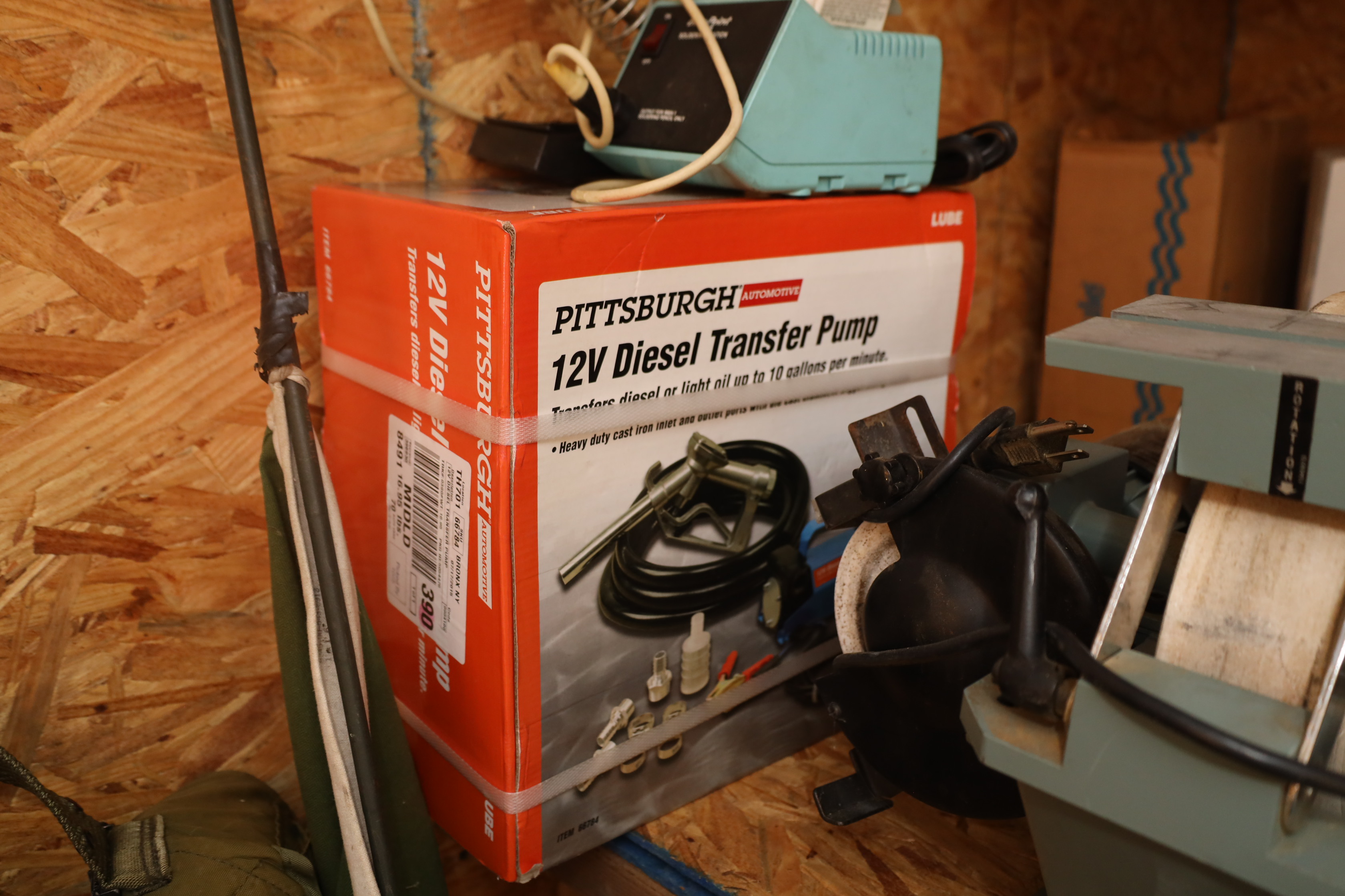 Container contents incl; motor oil, reproduction Luger pistol, US bayonet MK2 with wooden handle, three military helmets, military bags and harnesses, submersible pump, Metabo angle grinder MN 02230420, light fixtures, corded hand drill Model had14, Predator horizontal shaft gas engine 79CC IN#69733, Makita finishing sander mo b03700, Portable generator 800 running W, 1.1G fuel tank in original box, Pittsburgh 12v diesel transfer pump new and in original box, delta universal wet/dry grinder mo23-700 single phase, craftsmen 230/150W heavy duty soldering gun, drill bits, hole saw bits, probe, Allen keys, Sawzall blades, hacksaw blades, APC server equipment, vhs player, smoke detector, batteries, pesticide, radio from 1950’s Jeep, etc. DOES NOT INCLUDE WINE PRESS AND MATERIALS. Buyer must take all.