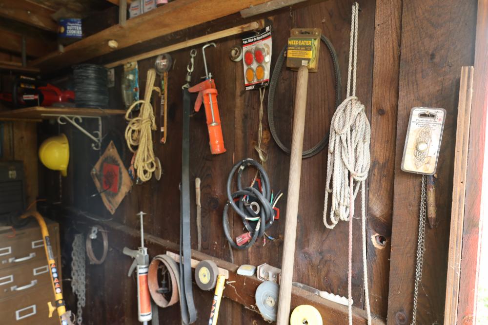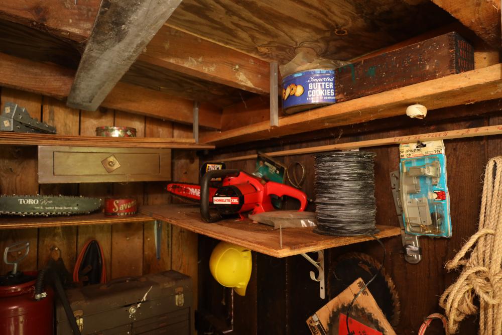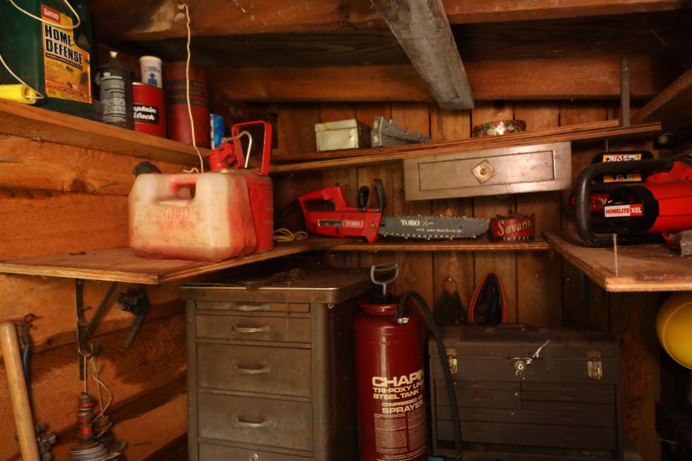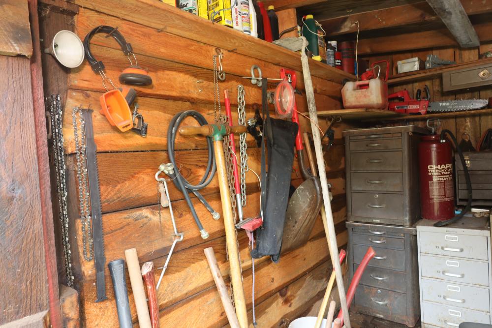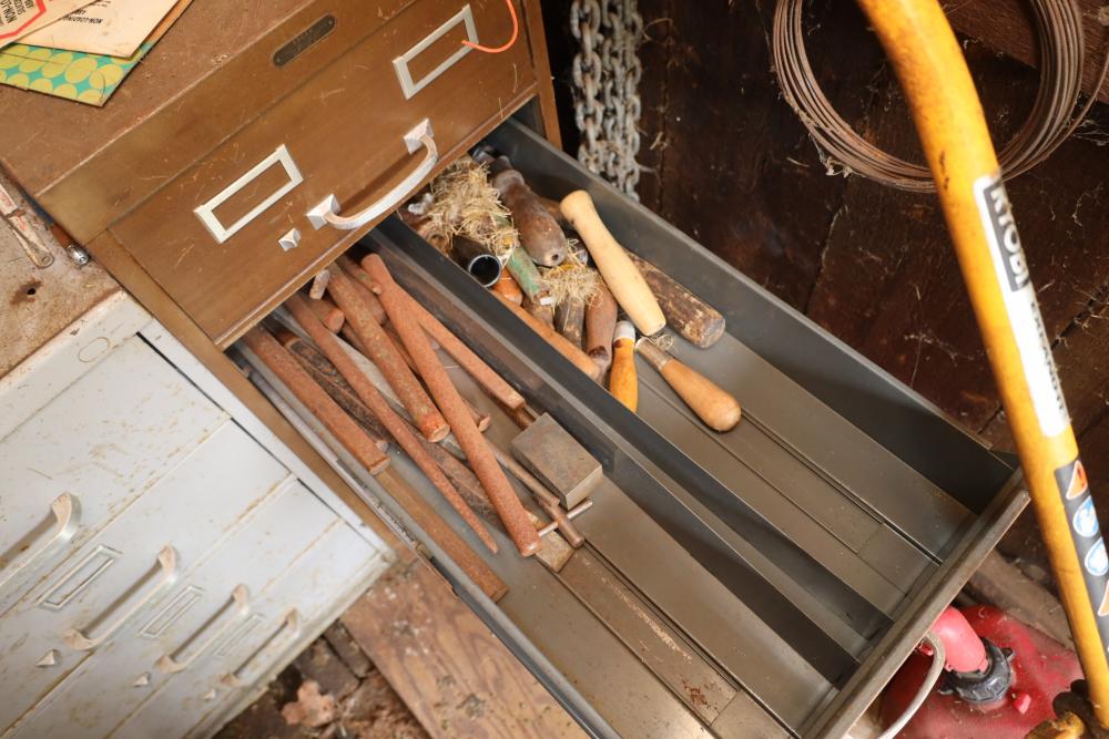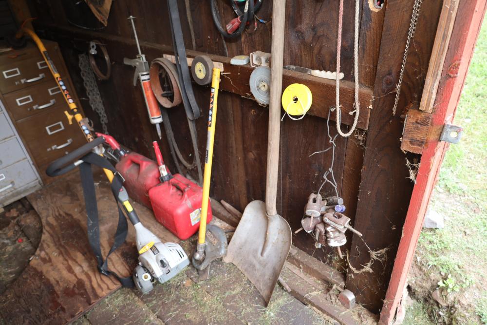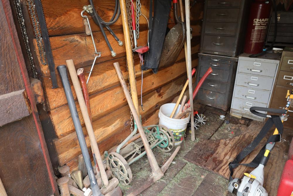 Backyard shed; yard tools, shovels, pick, caulk gun, rope, three filing cabinets, Ryobi weed whacker, hoe, work gloves, hammers, corded drills, sockets, various grit sandpaper, gas canisters, wrenches, wooden handles, clamps, screwdrivers, pliers, drill bits, Allen keys, files, vintage lawn mower, etc. Buyer must take all.