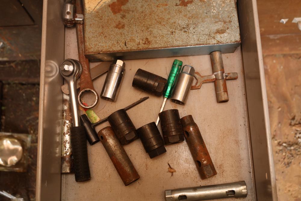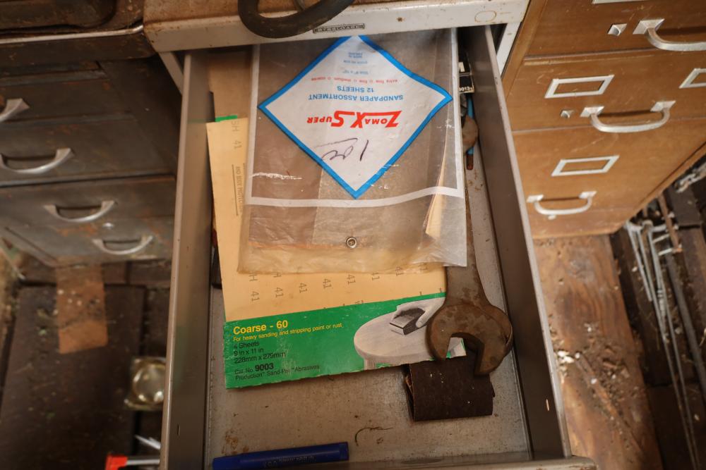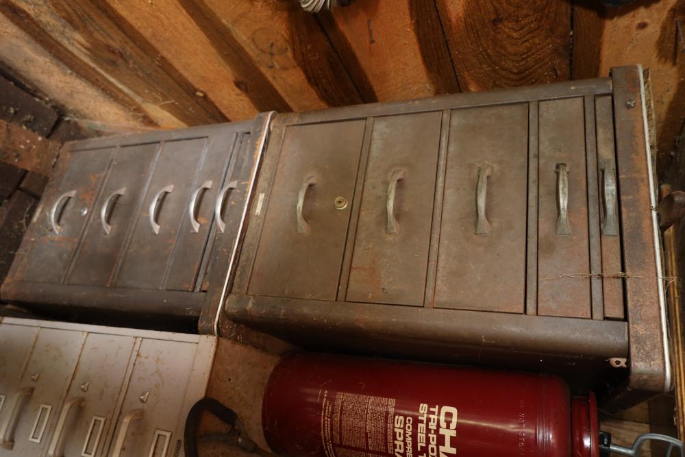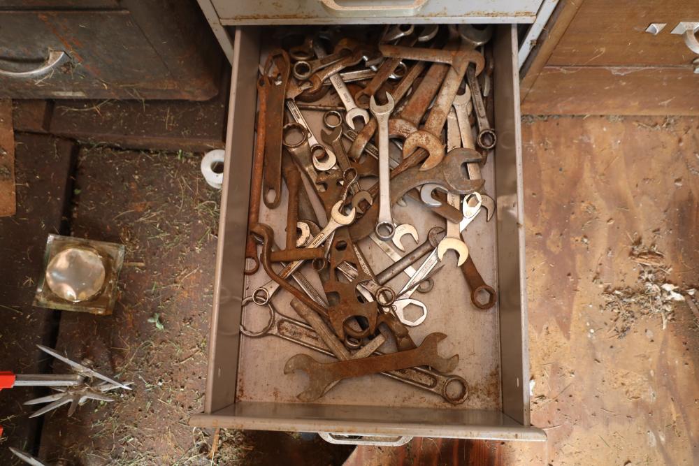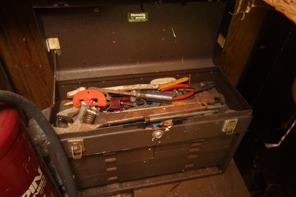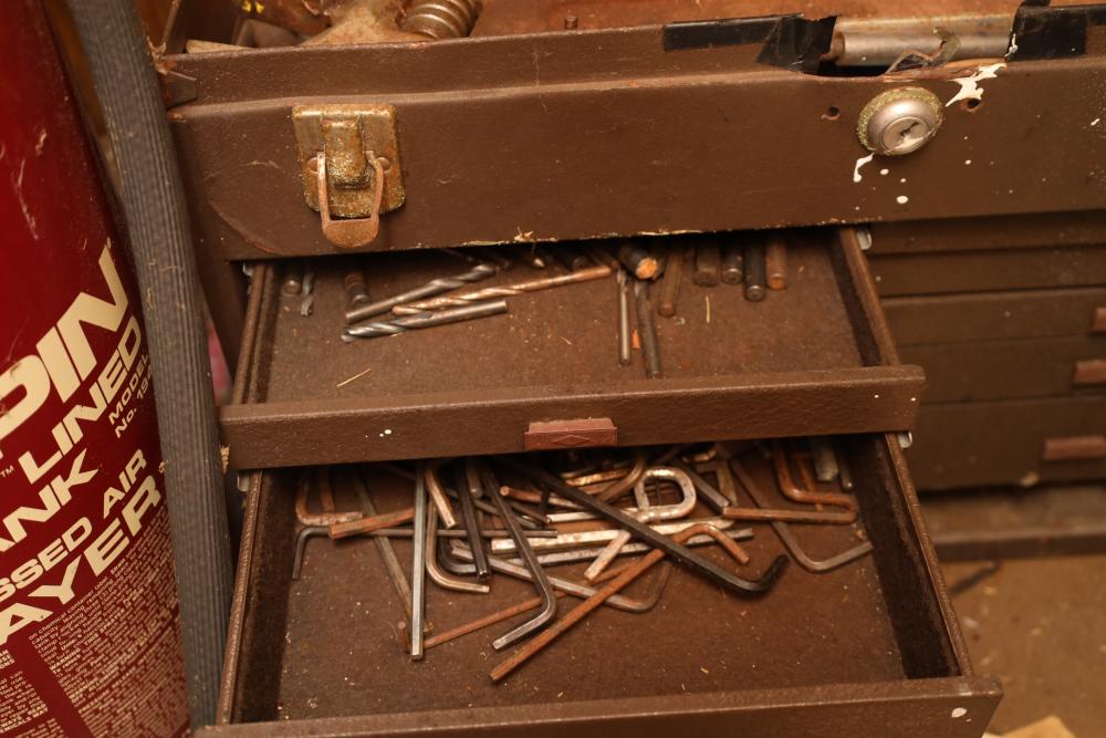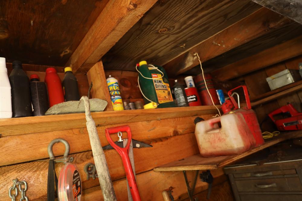 Backyard shed; yard tools, shovels, pick, caulk gun, rope, three filing cabinets, Ryobi weed whacker, hoe, work gloves, hammers, corded drills, sockets, various grit sandpaper, gas canisters, wrenches, wooden handles, clamps, screwdrivers, pliers, drill bits, Allen keys, files, vintage lawn mower, etc. Buyer must take all.