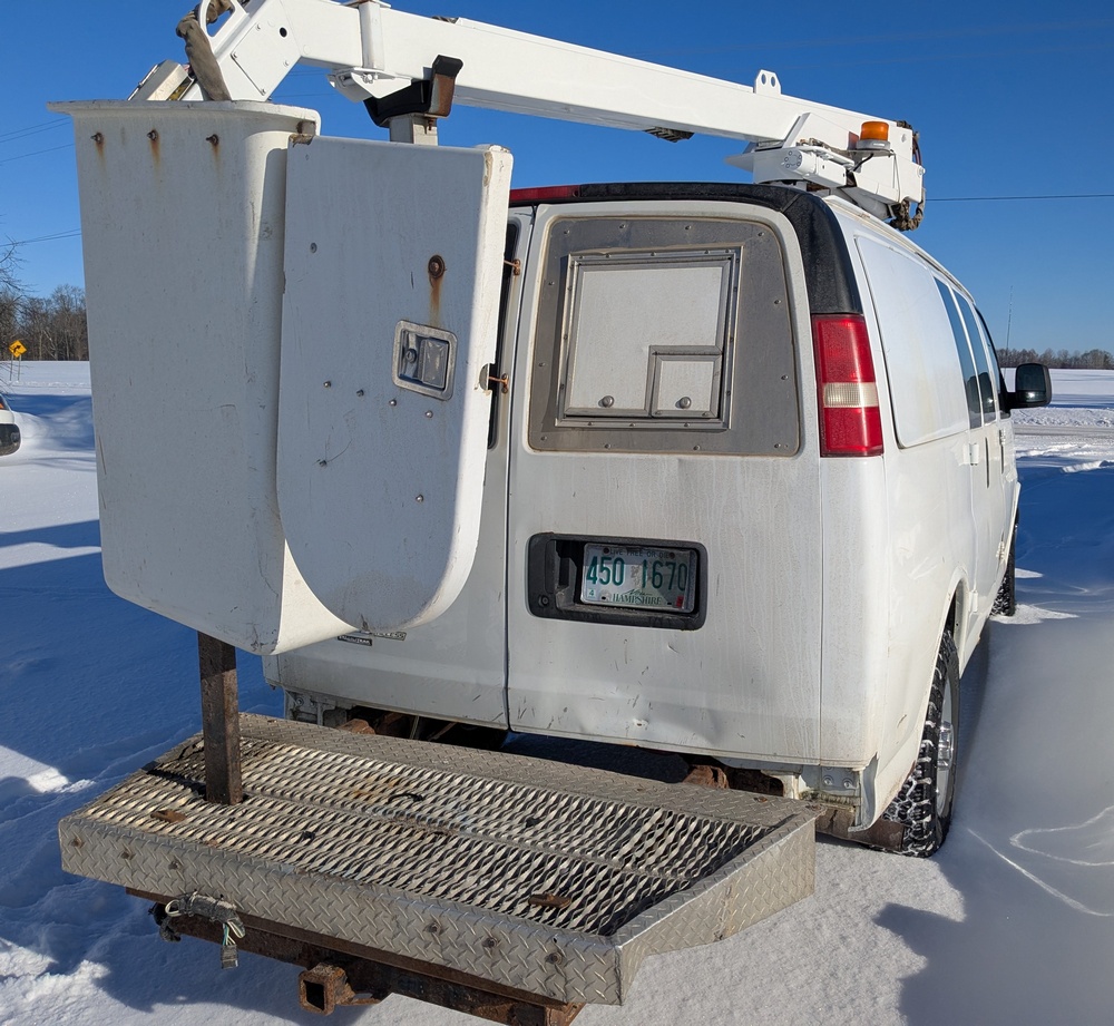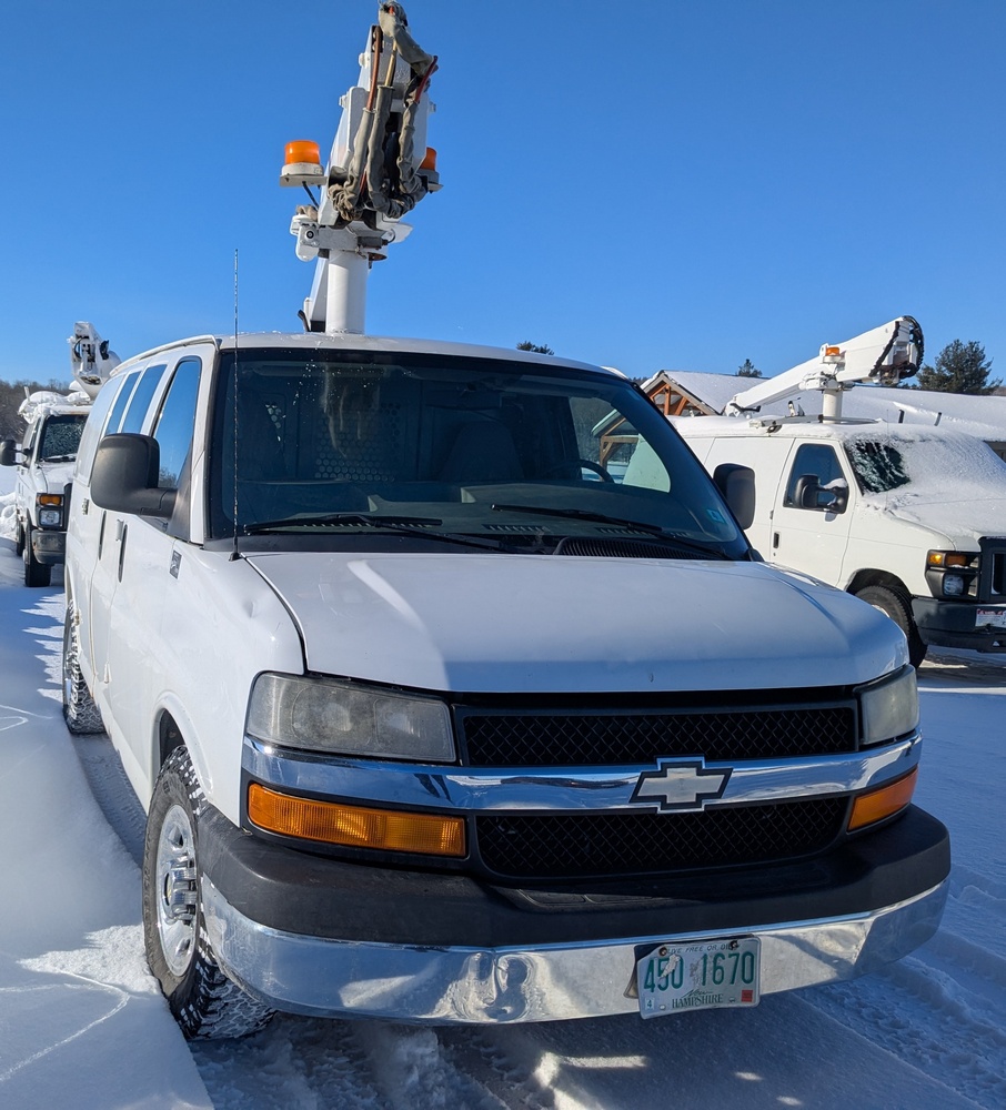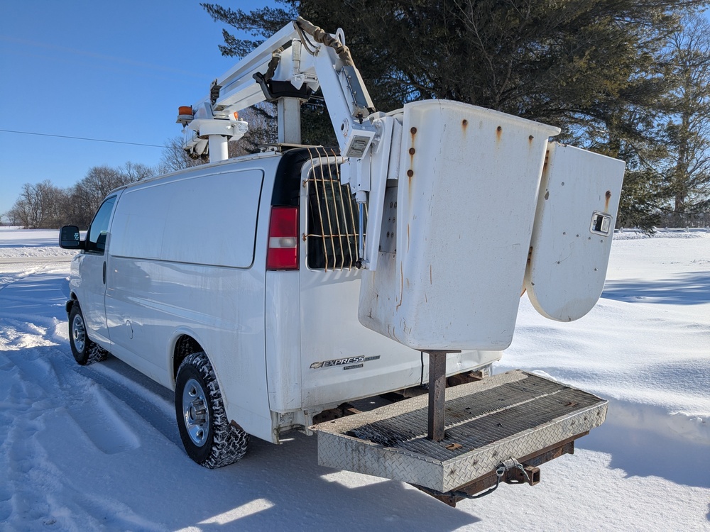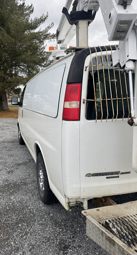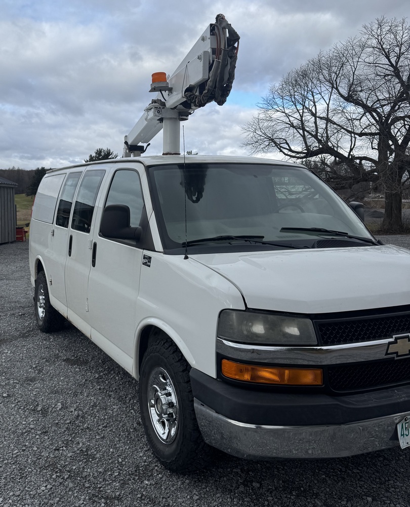 2014 Chevrolet Cargo Bucket Van. VIN: 1GCZGTCGXE1154388. Model G33405, Dur-A-Lift Model V34 32ft Uninsulated boom, odometer reading: 171,183. Runs, drives and operates as intended, key and Clear Title on hand.