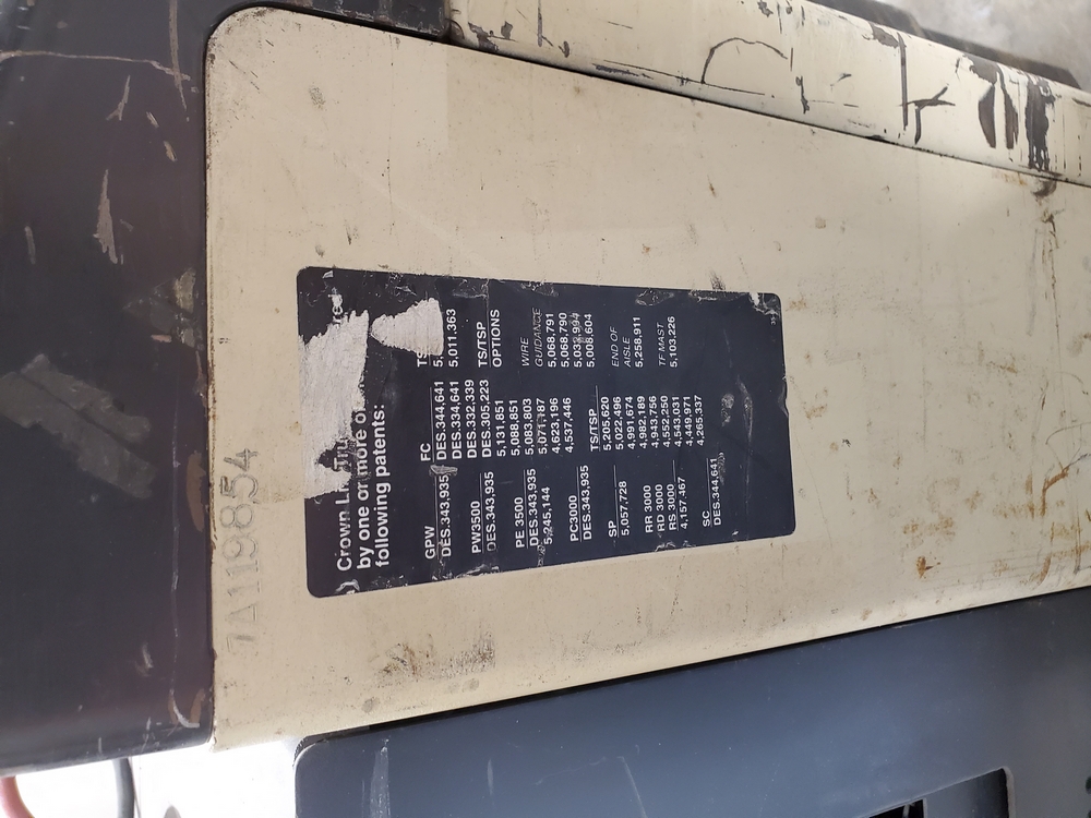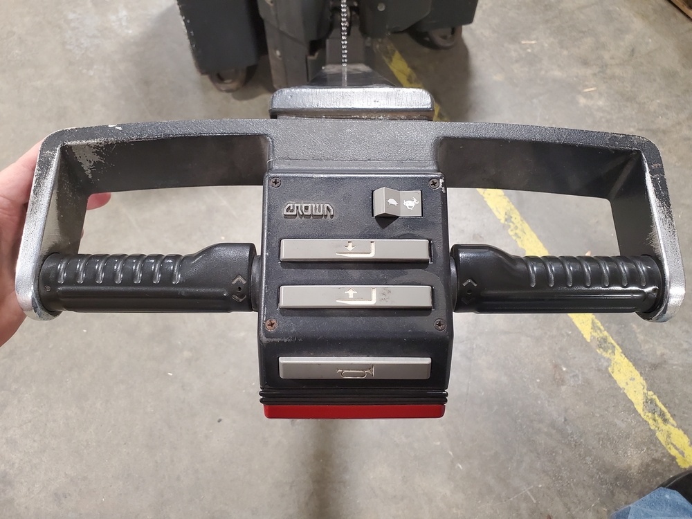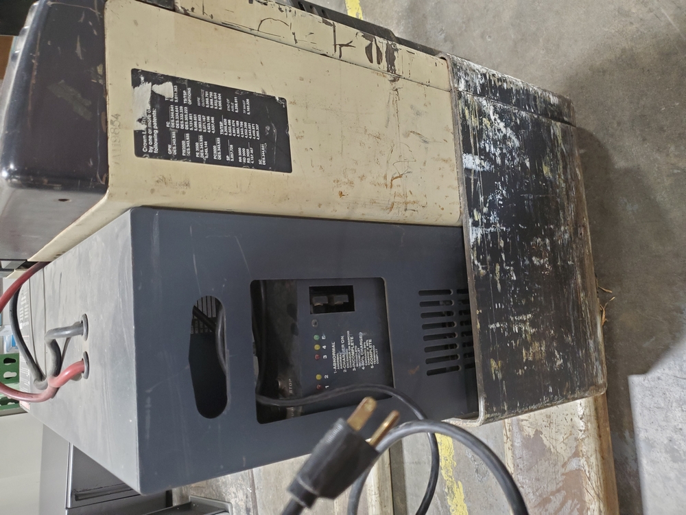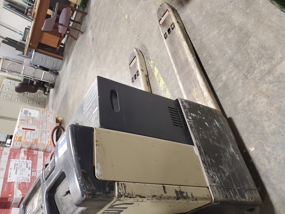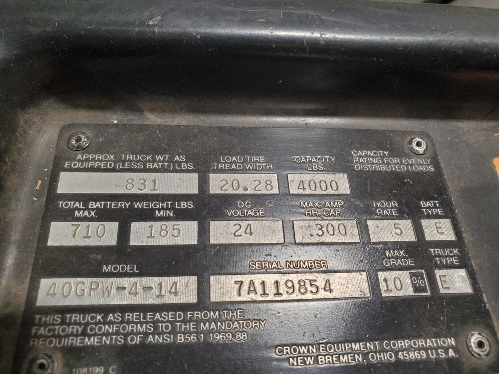Crown Walkie Electric Pallet jack with Built in Charger. Model 40GPW-4-14. Serial # 7A119854 Item work well before removed From Service Batteries are Completely dead and will need to be replaced. Purchased in 1996. Location: Central Services.