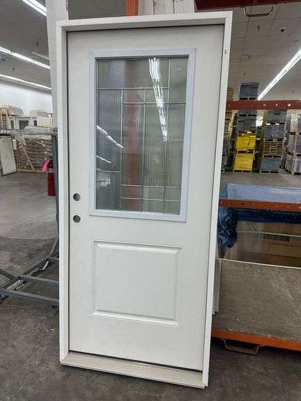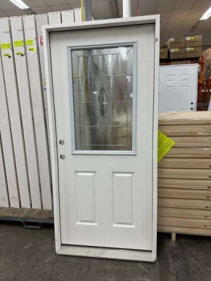 Fiberglass Decorative Entrance Door 36"x80" Right Hand. 22"x36" Decorative Glass, Actual Size: 37 1/4"x81", 4 9/16", Pre Hung, Grade: B Weight: x. Sold by: Door. Sold as: Price x Quantity.