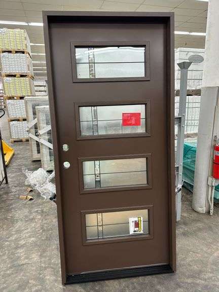 Dark Walnut, Exterior Fiberglass, 114A 4 Lite Deco Glass A, 36"x80", LH. By Sure Rock, 4-9/16" Jamb, BK Hardware, Net Frame: 37-1/4"x81"x4-9/16", Single, Oak Grain, Pre-Hung, Grade:2 Weight: 95. Sold by: Door. Sold as: Price x Quantity.