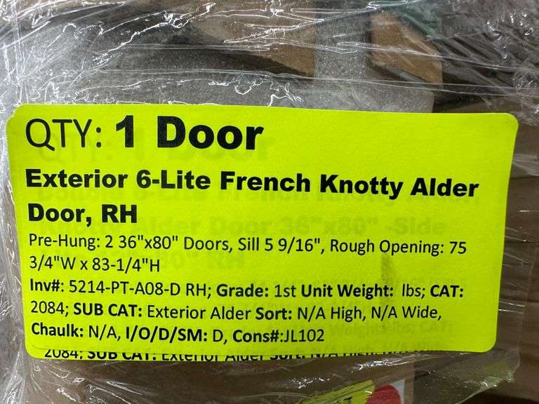 Exterior 6-Lite French Knotty Alder Door RH. Pre-Hung: 2 36"x80" Doors, Sill 5 9/16", Rough Opening: 75 3/4"Wx 83 1/4"H, Grade: 1st Weight: x. Sold by: Door. Sold as: Price x Quantity.