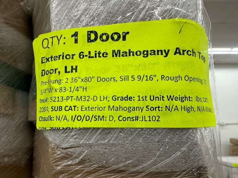 Exterior 6-Lite Mahogany Arch Top Door LH. Pre-Hung: 2 36"x80" Doors, Sill 5 9/16", Rough Opening: 75 3/4"Wx 83 1/4"H, Grade: 1st Weight: x. Sold by: Door. Sold as: Price x Quantity.