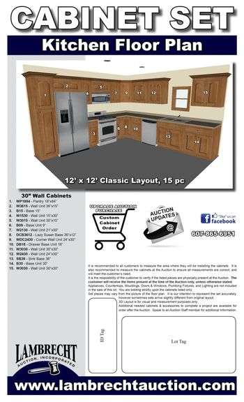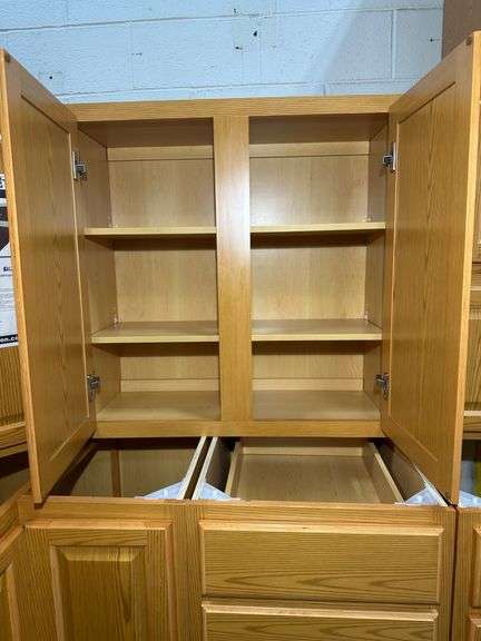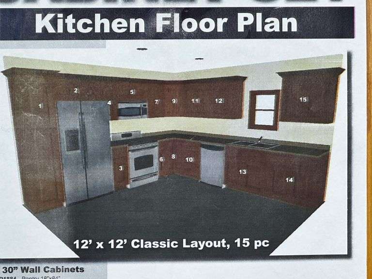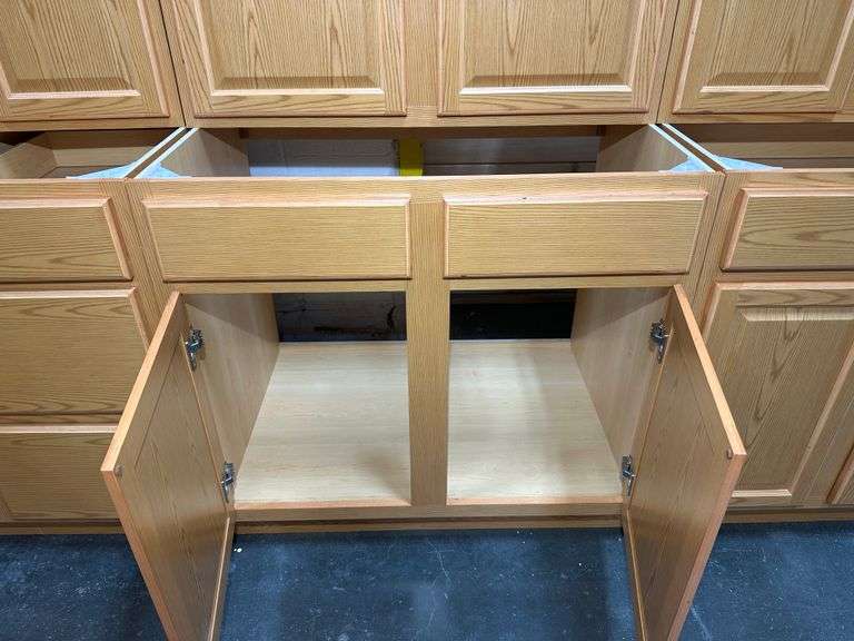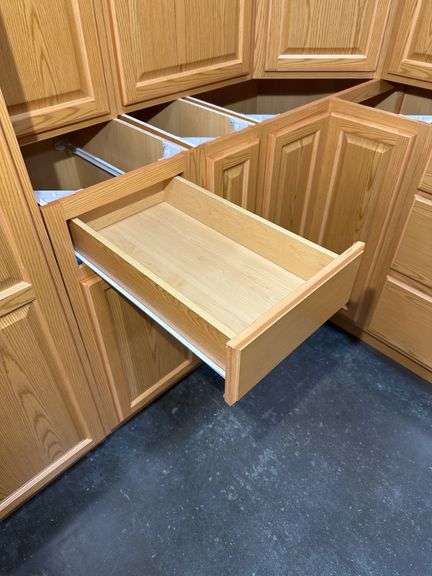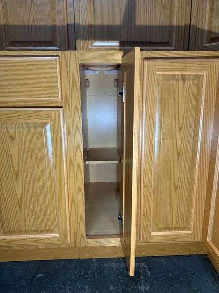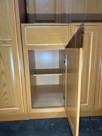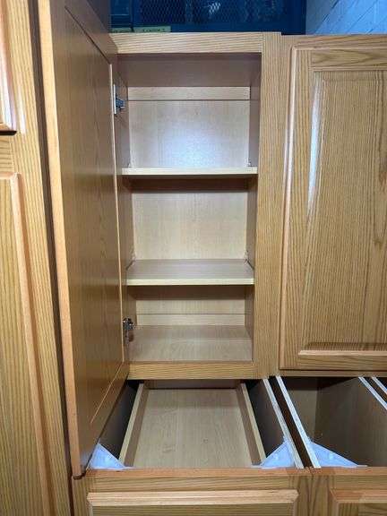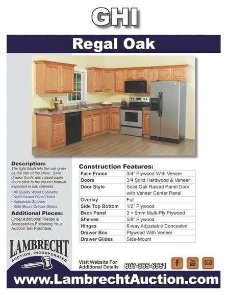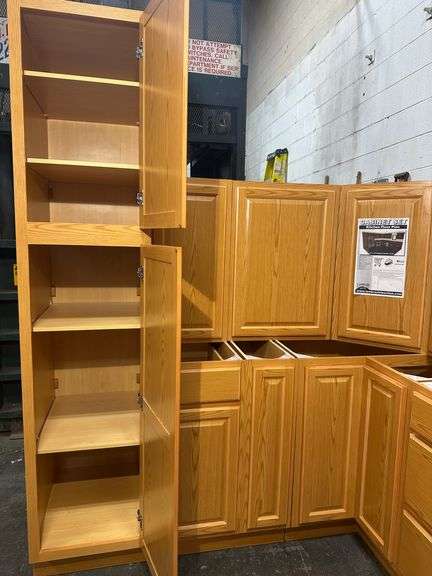 Regal Oak Kitchen Cabinet Set 12'x12'. Classic Layout, 30" Walls, By GHI, Additional pieces may be available for order to the high bidder. Additional cabinets ship boxed, ready to assemble. -All Wood Construction -3/4” Plywood with Veneer Oak Face Frame -Solid Oak Raised Panel Door with Veneer Center Panel -1/2” Plywood Box Construction -5/8” Plywood Shelf -Side Mount Glides and Plywood Drawer Box -Concealed Hinges. Enclosed in each cabinet set will be a Build Sheet which lists the individual cabinets in each set. As the cabinets are palletized each cabinet will be checked off and signed by our staff member to ensure that the set is complete at the time of pick-up. Please keep this Build Sheet on hand because it will be required if there is an issue with your cabinet set. Cabinet issues will not be addressed without this build sheet. Weight: x. Sold by: Set. Sold as: Price x Quantity.