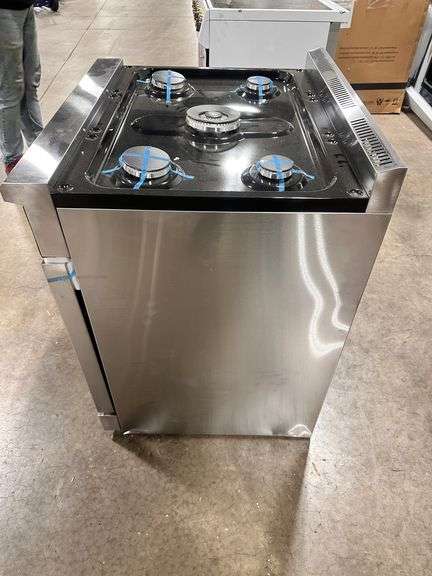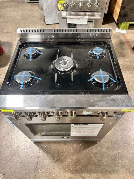 Forno Gas Range FFSGS6276-30 Stainless Steel 30". Missing grates, This is a Forno gas range, model FFSGS6276-30, featuring a stainless steel finish and a 30-inch width. It includes five control knobs for varying burner sizes, a built-in oven with a glass window, and a temperature gauge on the front panel. The unit is designed for natural gas or LPG with specific injector sizes and outputs detailed on the label. The range shows some grade B cosmetic imperfections including dirt, dents on the sides, small dents on the kick plate, and a dent on the rear support. The unit is new but untested. This gas range offers powerful cooking options with burners rated up to 19,000 BTU for wok cooking and an oven rated at 16,000 BTU, making it suitable for home or commercial kitchens looking for versatility and reliability. The stainless steel construction provides durability and an attractive finish that fits modern kitchen designs. This is a liquidated product. The Auction Company makes no express or implied representations or warranties of any kind regarding the Product. Any pre-existing retail, wholesale or manufacturer warranties will not transfer with the sale of this Product unless expressly stated otherwise on this page. The Buyer accepts the Product in as-is condition, with all faults. Weight: . Sold by: Piece. Sold as: Price x Quantity.