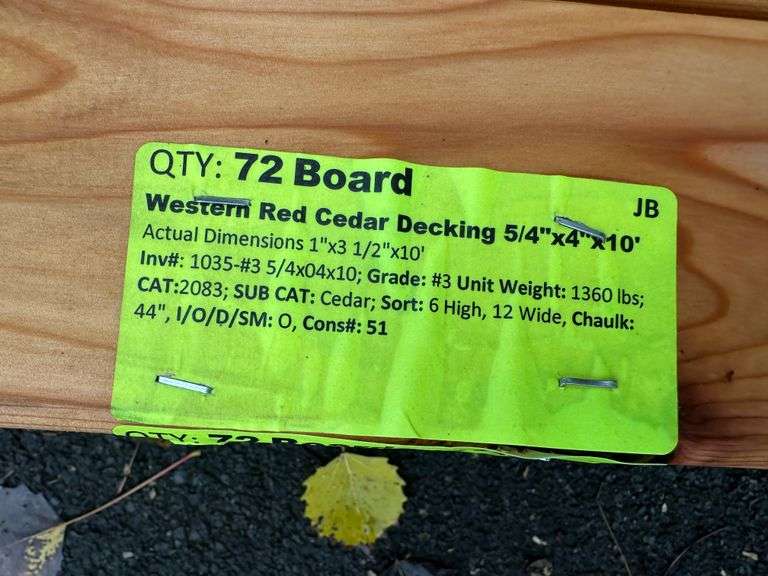 Western Red Cedar Decking 5/4"x4"x10'. Actual Dimensions: 1"x3 1/2"x10', Grade: #3 Weight: 1360. Sold by: Board. Sold as: Price x Quantity.