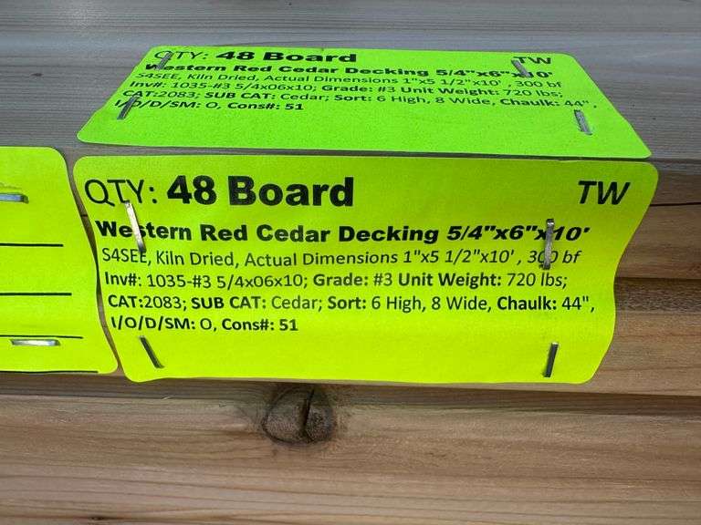 Western Red Cedar Decking 5/4"x6"x10'. S4SEE, Kiln Dried, Actual Dimensions: 1"x5 1/2"x10', 300 Board Foot, Grade: #3 *Condition Note: Splits and Cracks, Punky, Please See Photos* Weight: 720. Sold by: Board. Sold as: Price x Quantity.
