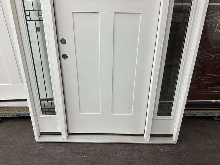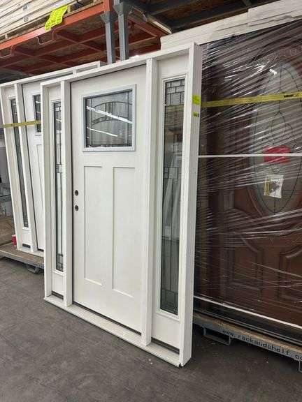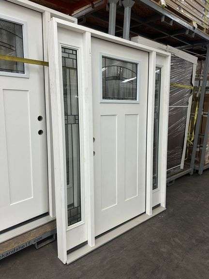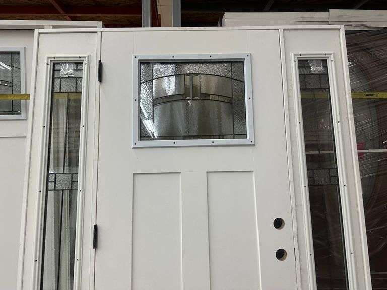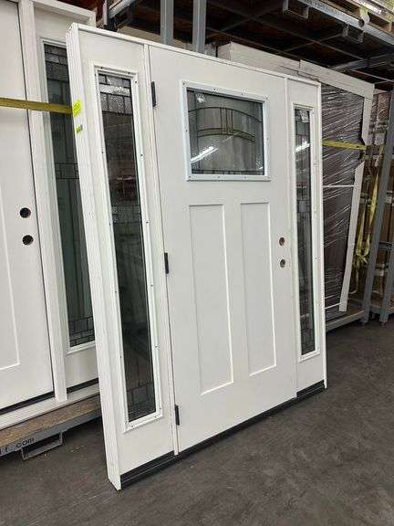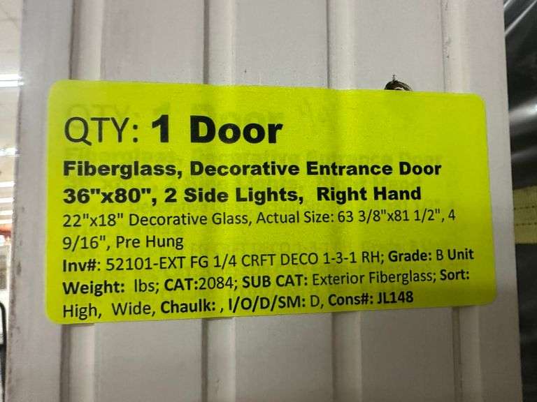 Fiberglass Decorative Entrance Door 2 Side Lights 36"x80" Right Hand. 22"x18" Decorative Glass, Actual Size: 63 3/8"x81 1/2", 4 9/16", Prehung, White, Grade: B Weight: x. Sold by: Door. Sold as: Price x Quantity.