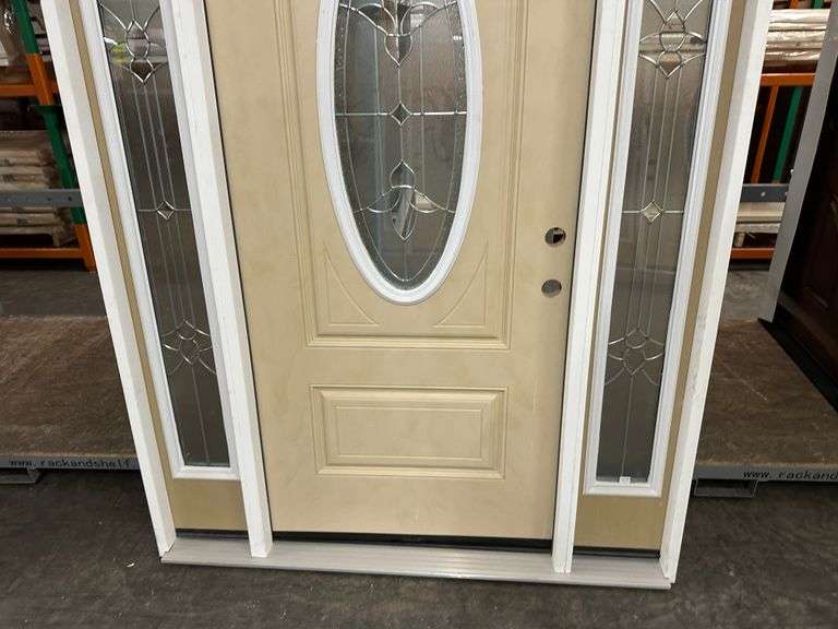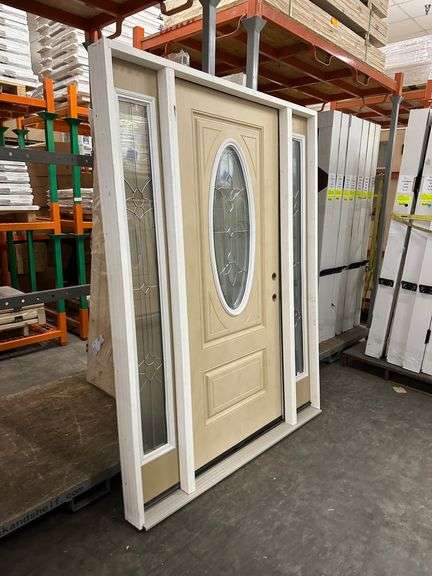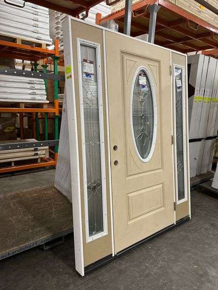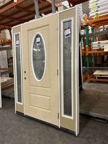 Fiberglass Decorative Entrance Door 2 Side Lights 36"x80" Left Hand. Oval Decorative Glass, Actual Size: 63 3/8"x81 1/2", 4 9/16", Prehung, Light Brown, Grade B Weight: x. Sold by: Door. Sold as: Price x Quantity.
