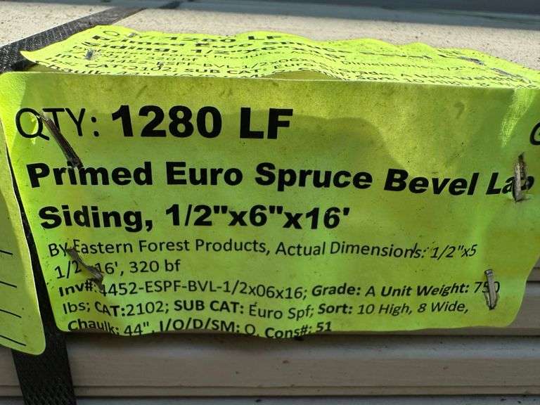 Primed Euro Spruce Bevel Lap Siding 1/2"x6"x16'. By Eastern Forest Products, Actual Dimensions: 1/2"x5 1/2"x16' 320 Board Foot, Grade: A *Condition Note: Fork Damage, Please See Photos* Weight: 750. Sold by: Linear Foot. Sold as: Price x Quantity.