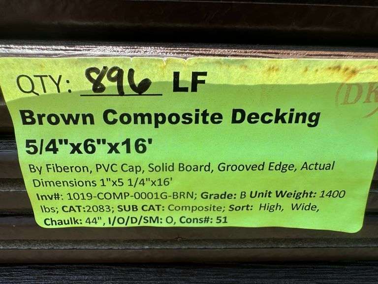 Brown Composite Decking 5/4"x6"x16'. By Fiberon, PVC Cap, Solid Board, Grooved Edge, Actual Dimensions 1"x5 1/4"x16', Grade:B Weight: 1400. Sold by: Linear Foot. Sold as: Price x Quantity.