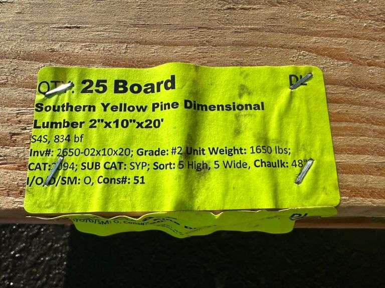 Southern Yellow Pine Dimensional Lumber 2"x10"x20'. S4S, 834 Board Foot, Grade: #2 Weight: 1650. Sold by: Board. Sold as: Price x Quantity.