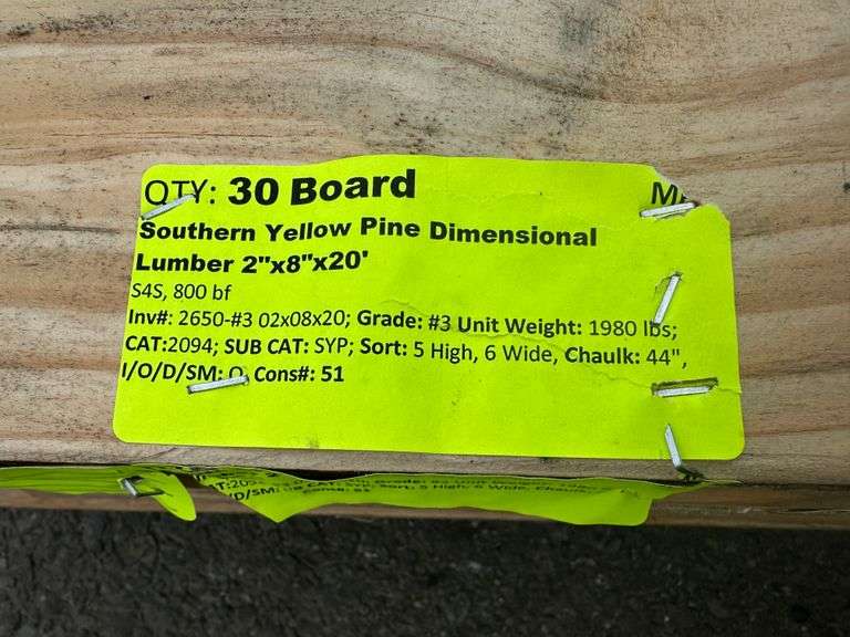 Southern Yellow Pine Dimensional Lumber 2"x8"x20'. S4S, 800 Board Foot, Grade: #3, *Condition Notes: Mold, Splits/Cracks, Please See Photos* Weight: 1980. Sold by: Board. Sold as: Price x Quantity.