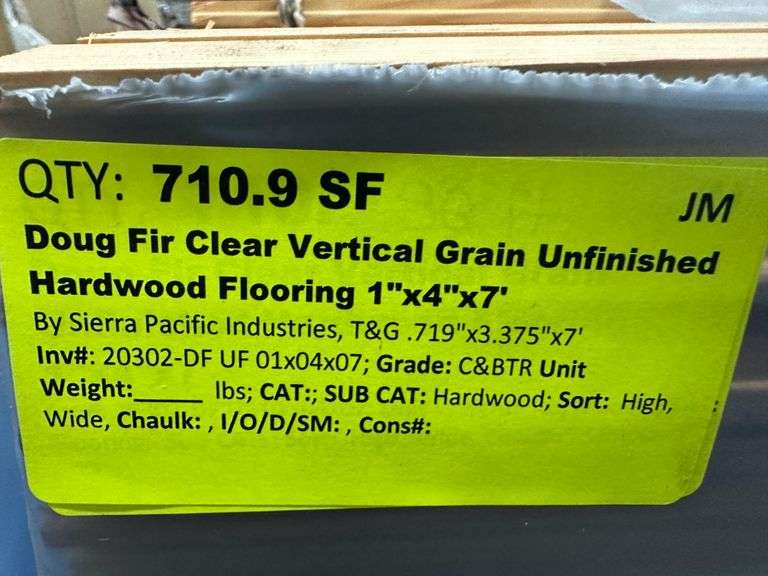 Doug Fir Clear Vertical Grain Unfinished Hardwood Flooring 1"x4"x7'. By: Sierra Pacific Industries, T&G, .719"x3.375"x7', Grade: C&BTR Weight: x. Sold by: Square Foot. Sold as: Price x Quantity.
